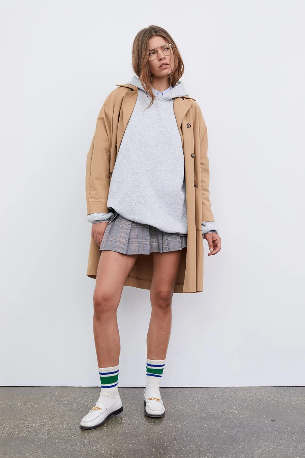 - Contrast ribbed trim at neckline, sleeves, and hem