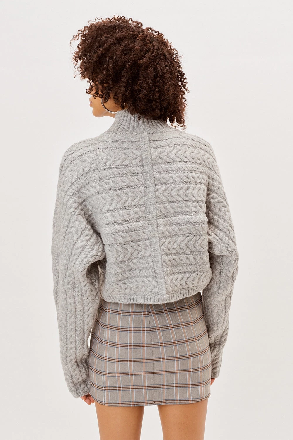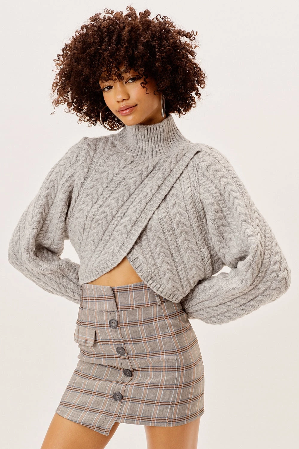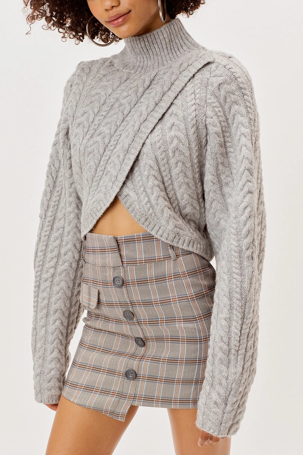 Effortless cable knit sweater featuring overlapped cross front panels and a tall turtleneck. Rib trim detailing throughout.