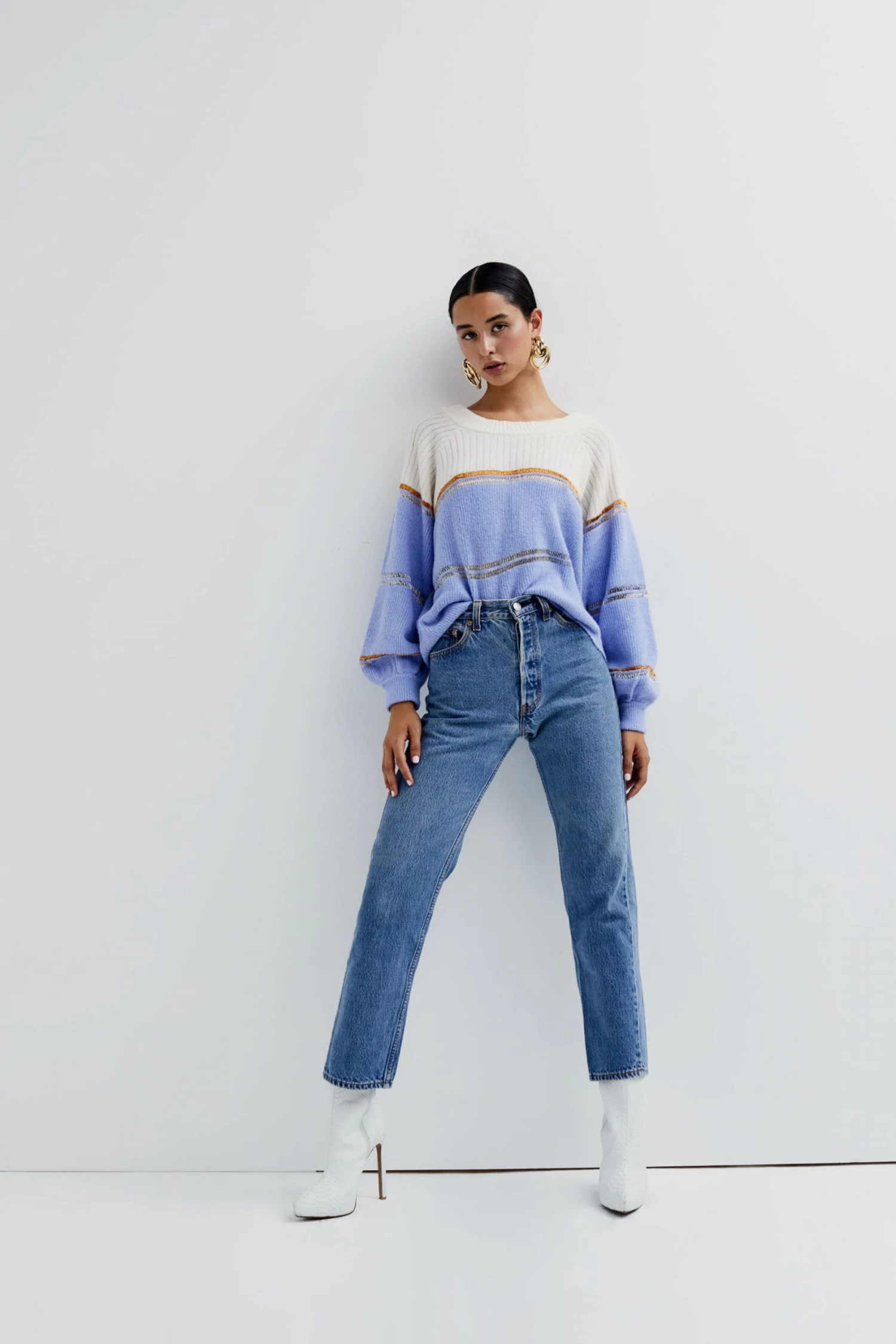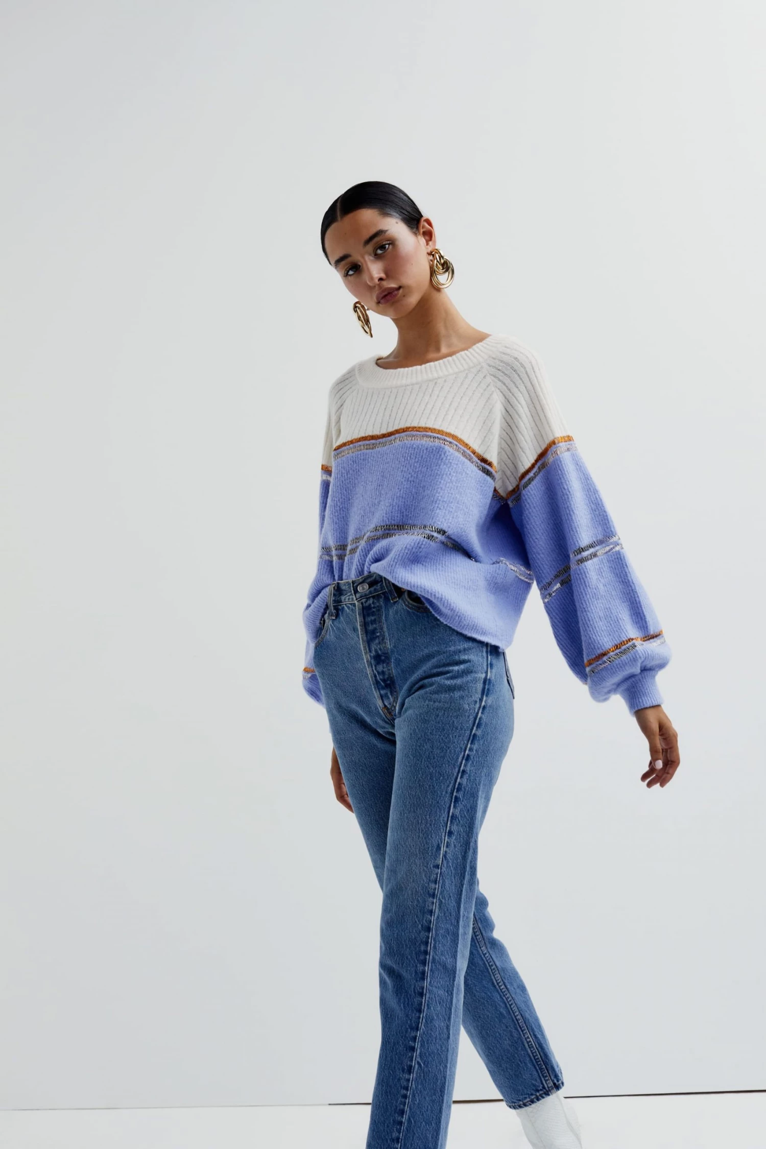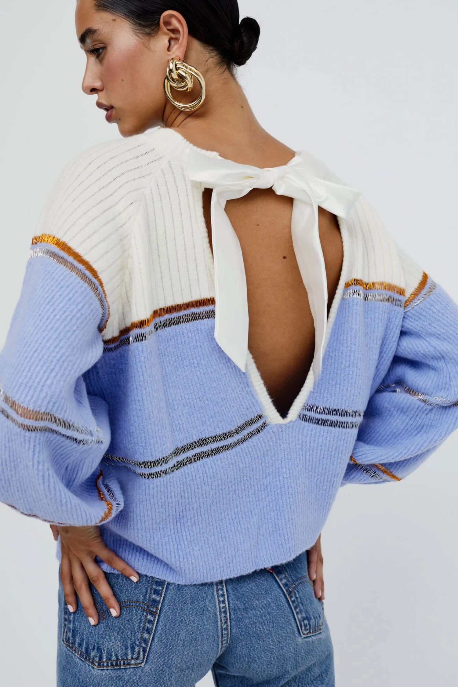 Deliciously soft color block sweater featuring a satin tie back and variegated lurex stripes throughout.