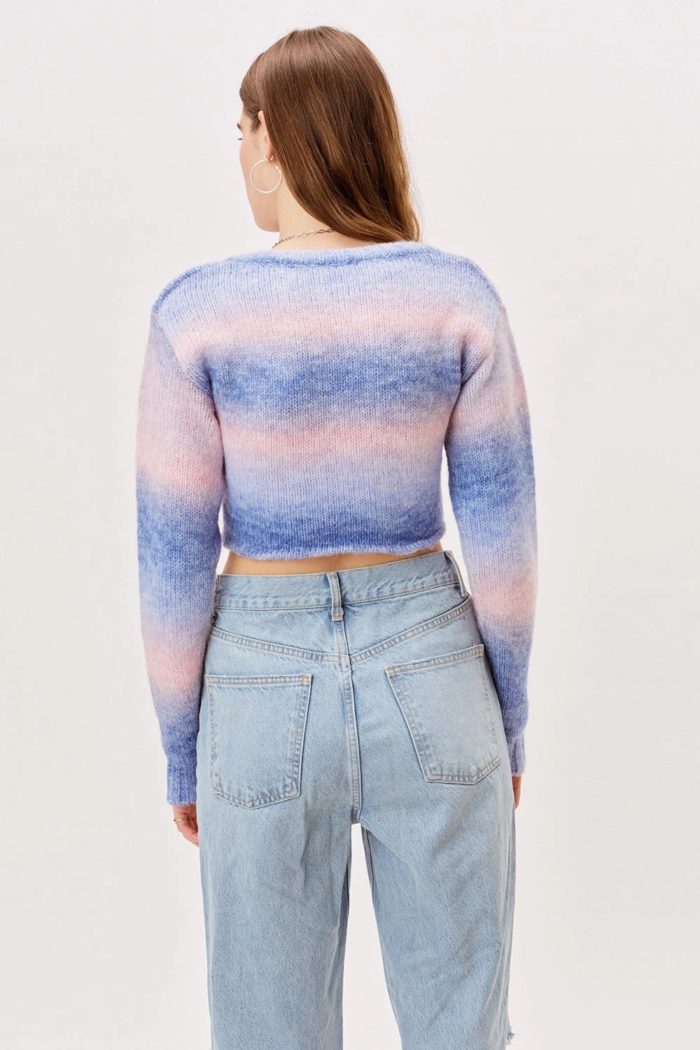 Cotton candy inspired crop sweater featuring a playful front twist and V-neckline. Due to the nature of the ombre detail & knitting process, every piece is unique and will differ slightly from the image on our site.