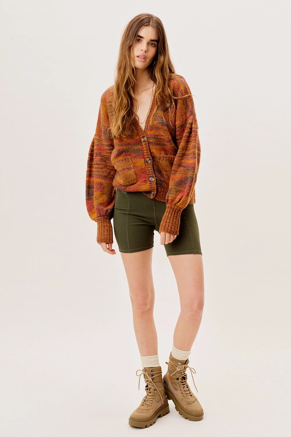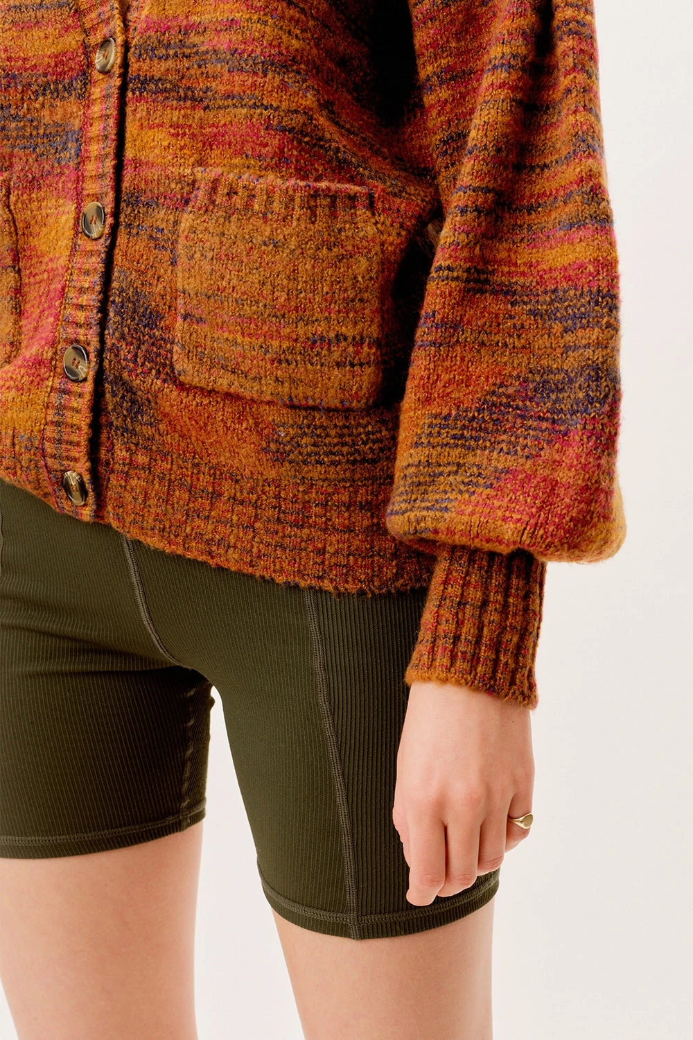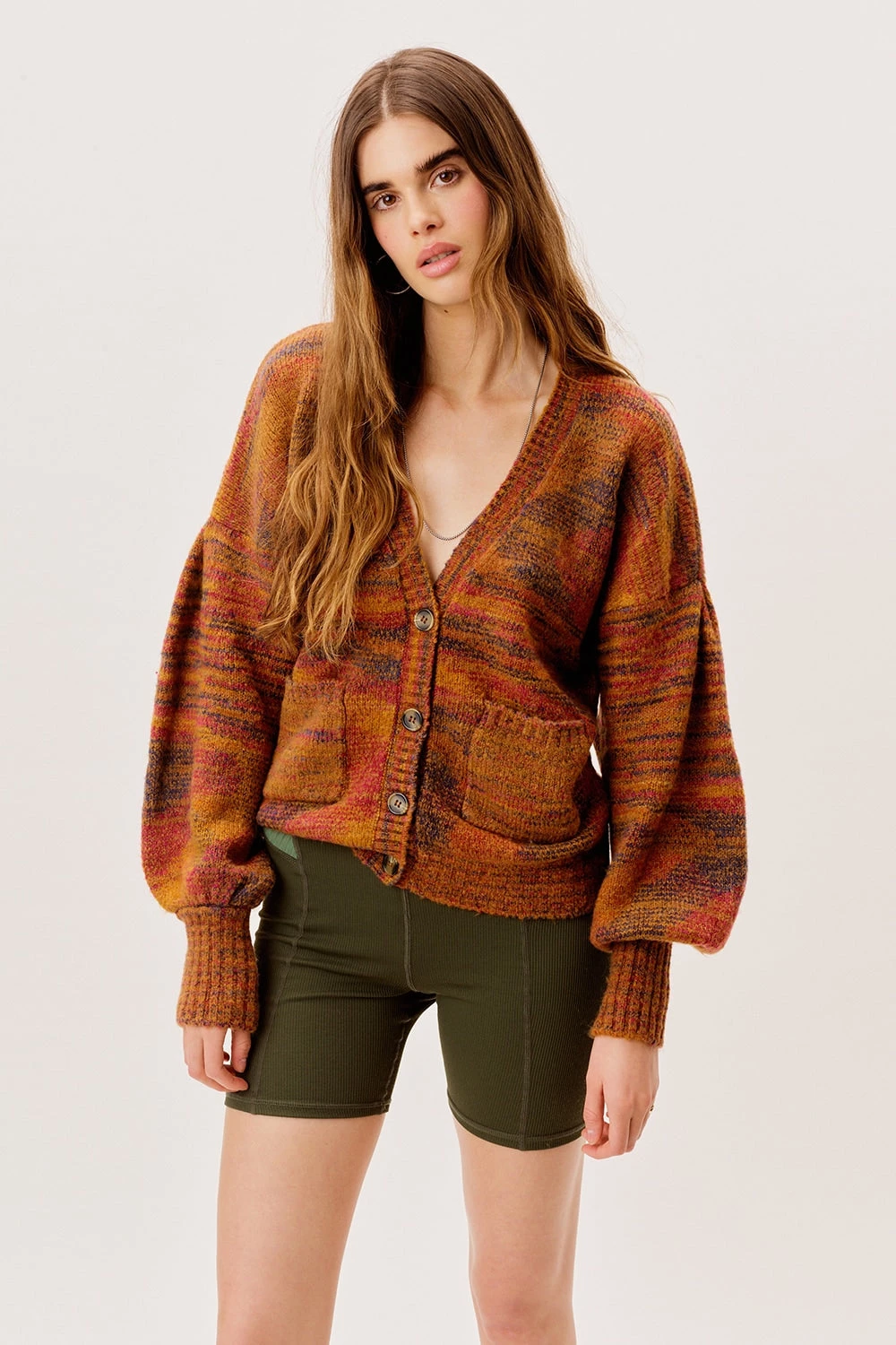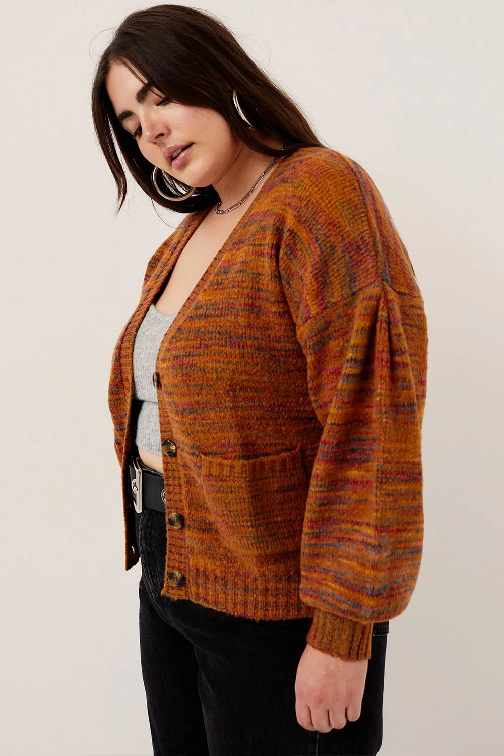 Retro-nostalgic marled cardigan featuring side pockets, a plunging neckline, and billowy sleeves. Faux tortoise buttons.