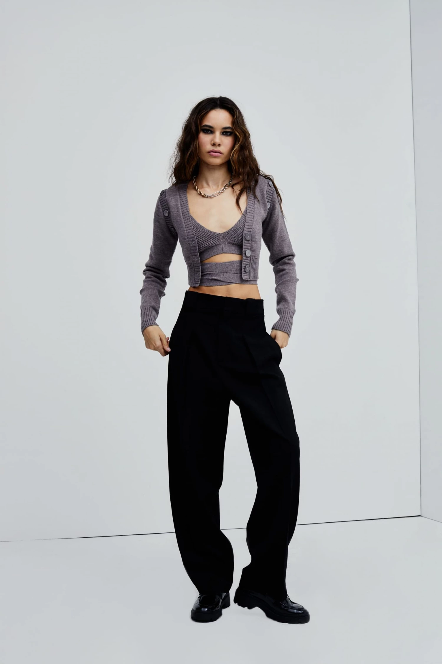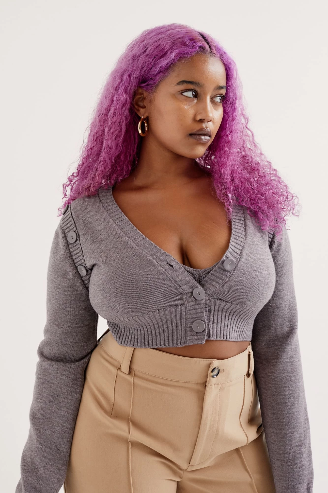Modern cropped knit cardigan featuring tonal buttons at for removable sleeves. Deliciously soft feel.