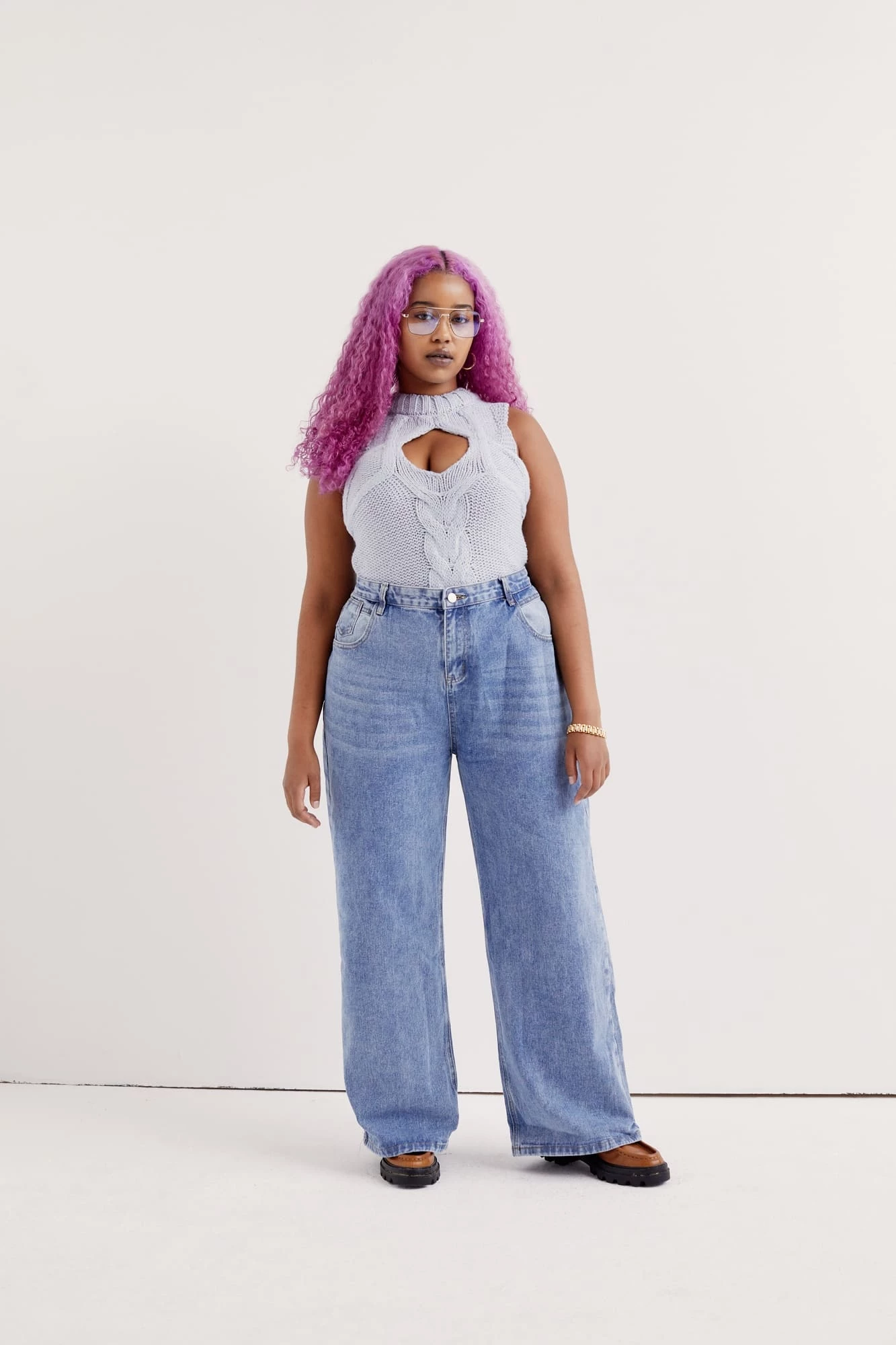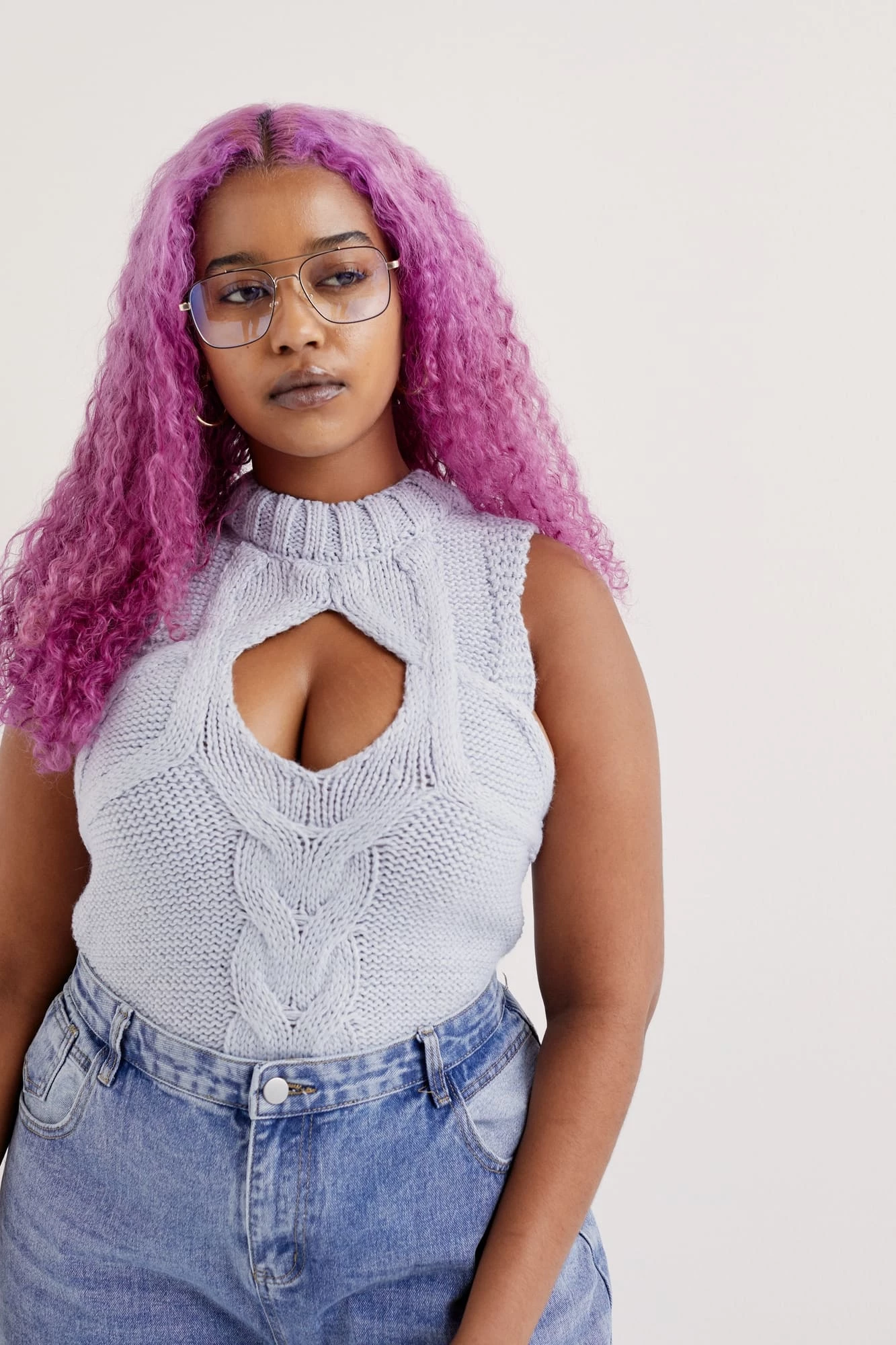 Structured cable knit top featuring a high neck and keyhole cutout at bust. Deliciously soft feel.