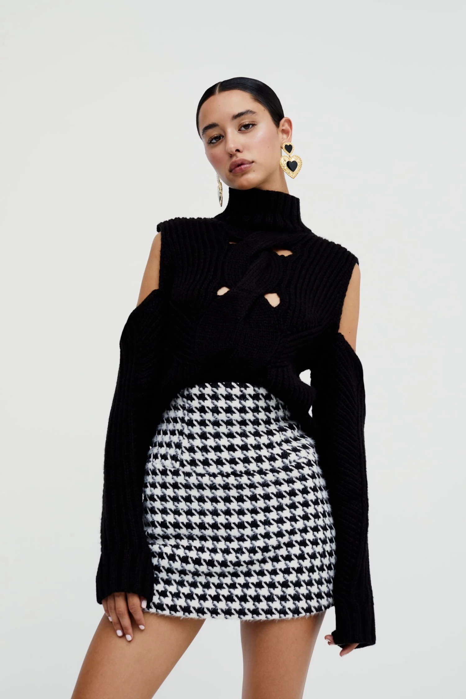 Structured cable knit turtleneck sweater featuring cutout detailing at bust and slouchy shoulders. Deliciously soft feel.