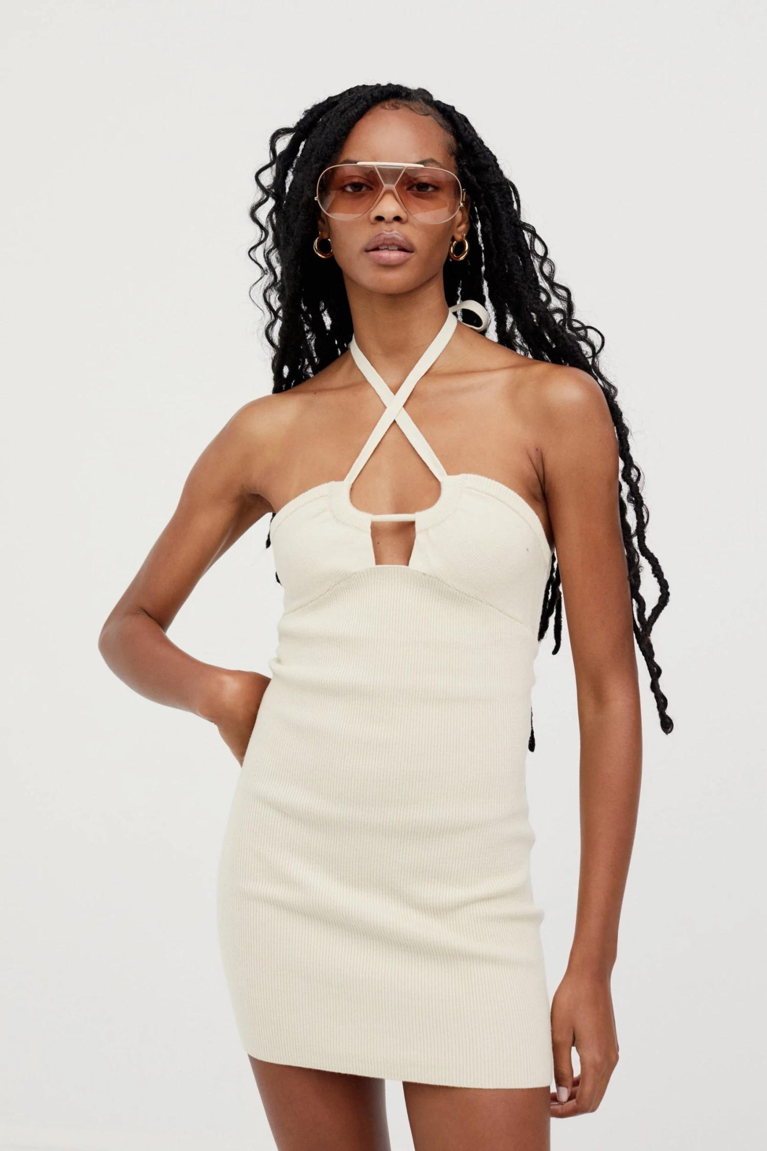 Deliciously soft faux mohair mini dress featuring a figure-flattering fit and criss-cross strappy detailing at neck.