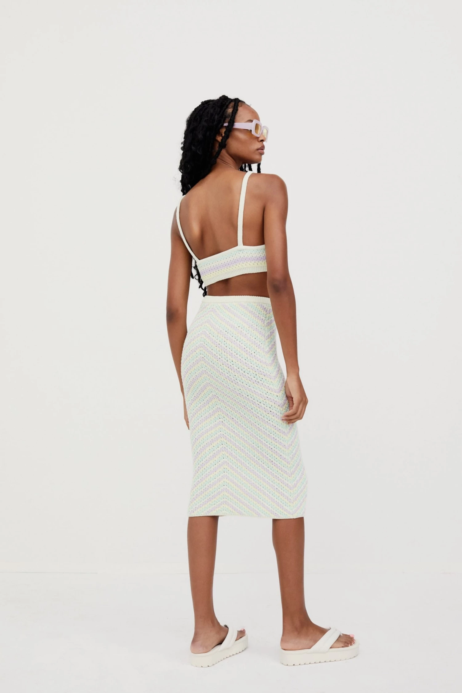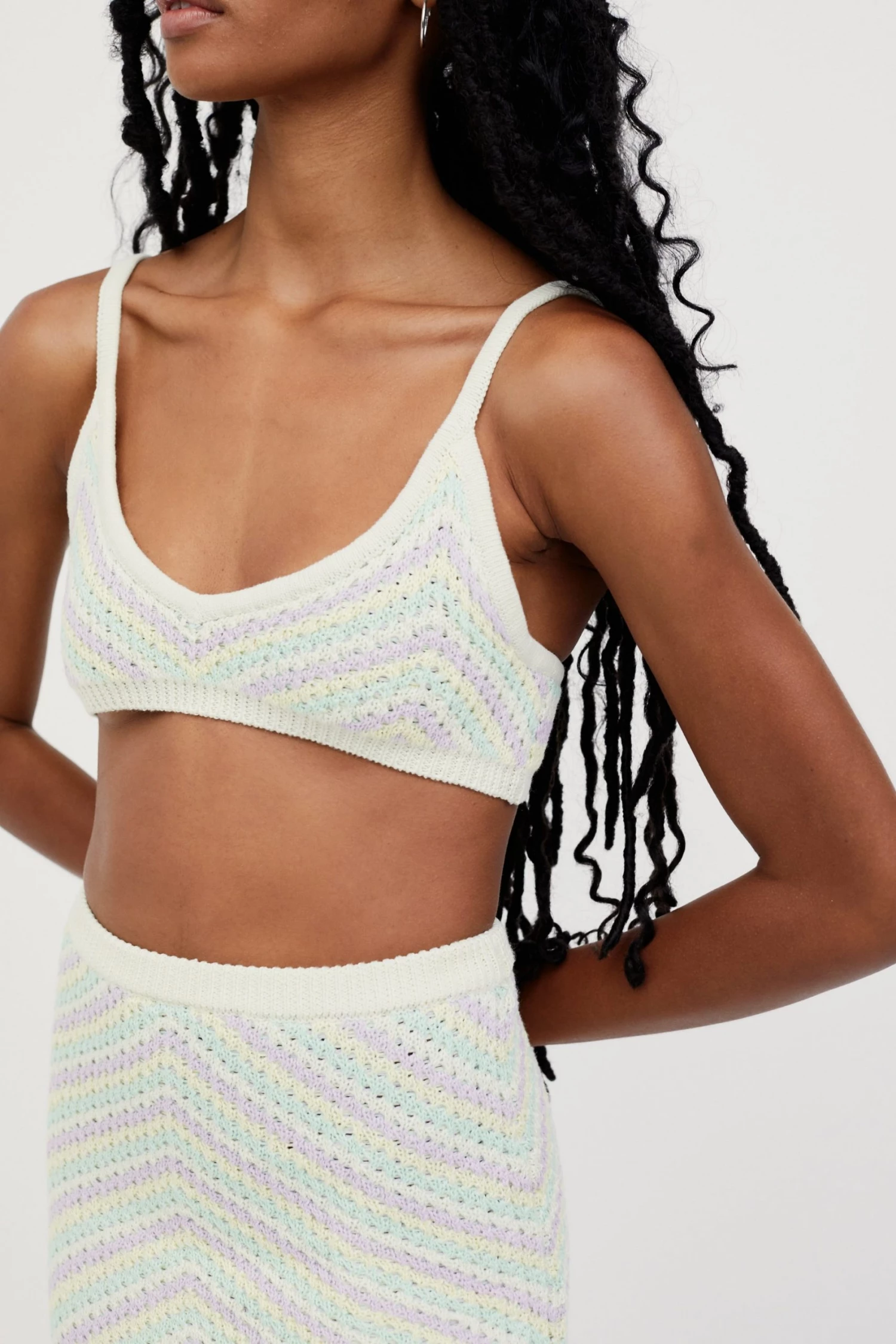 Deliciously soft open knit bralette featuring chevron color blocking.