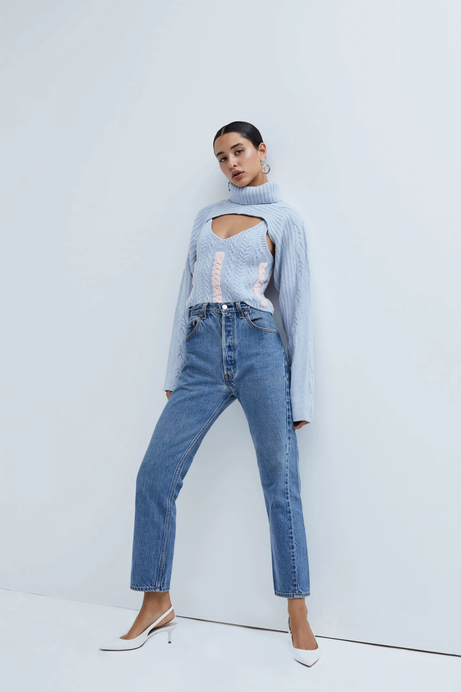 Modern cable knit cami featuring a neckline cropped turtleneck layered on top.