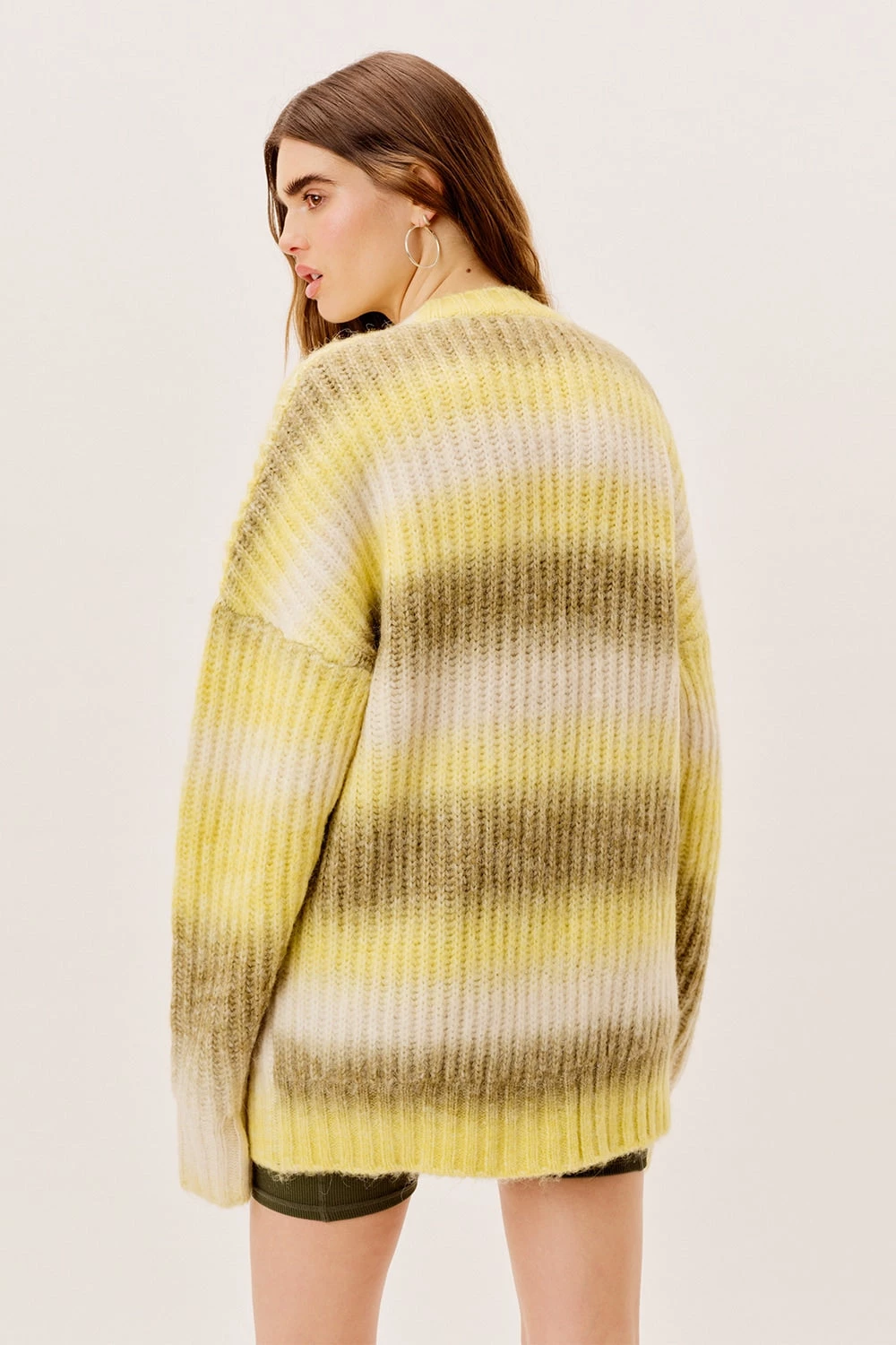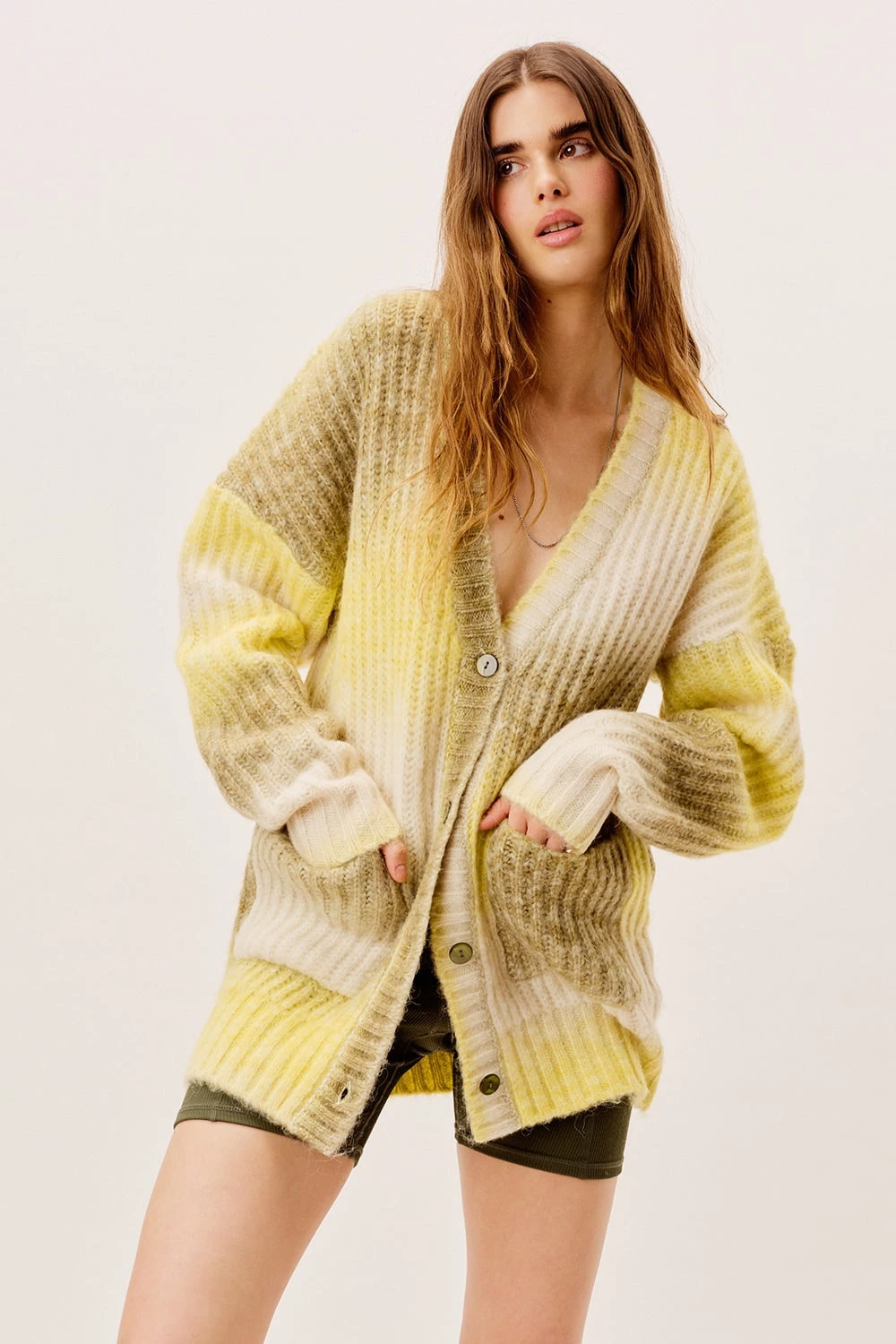 Oversized ombre stripe cardigan featuring front button closure, pockets, and tonal buttons. Due to the nature of the ombre detail & knitting process, every piece is unique and will differ slightly from the image on our site.