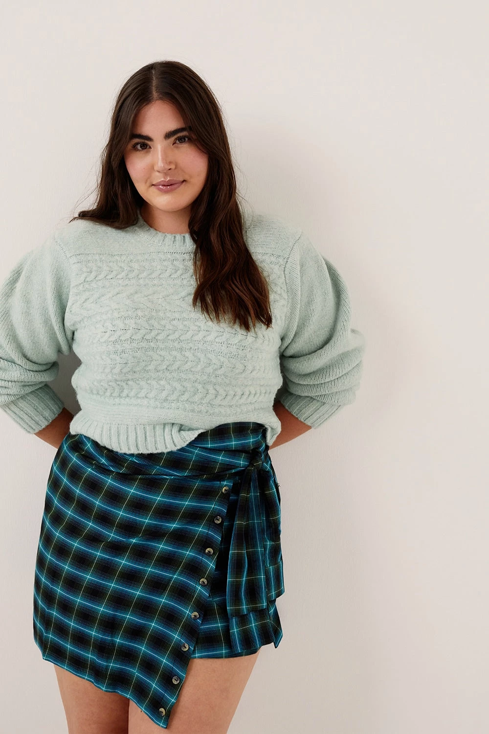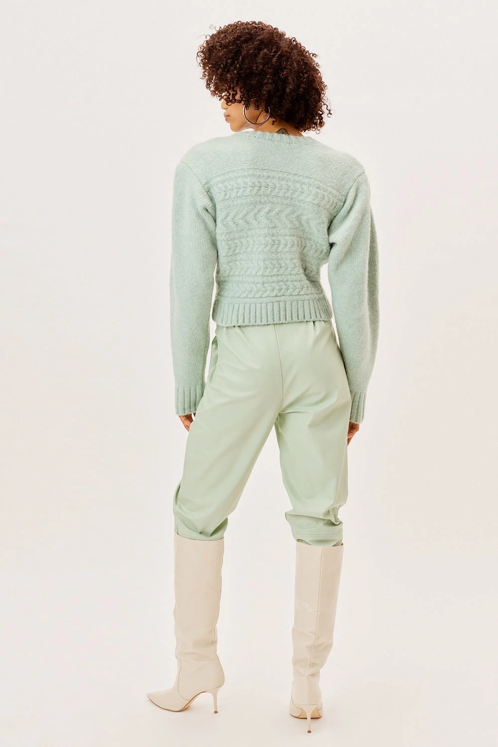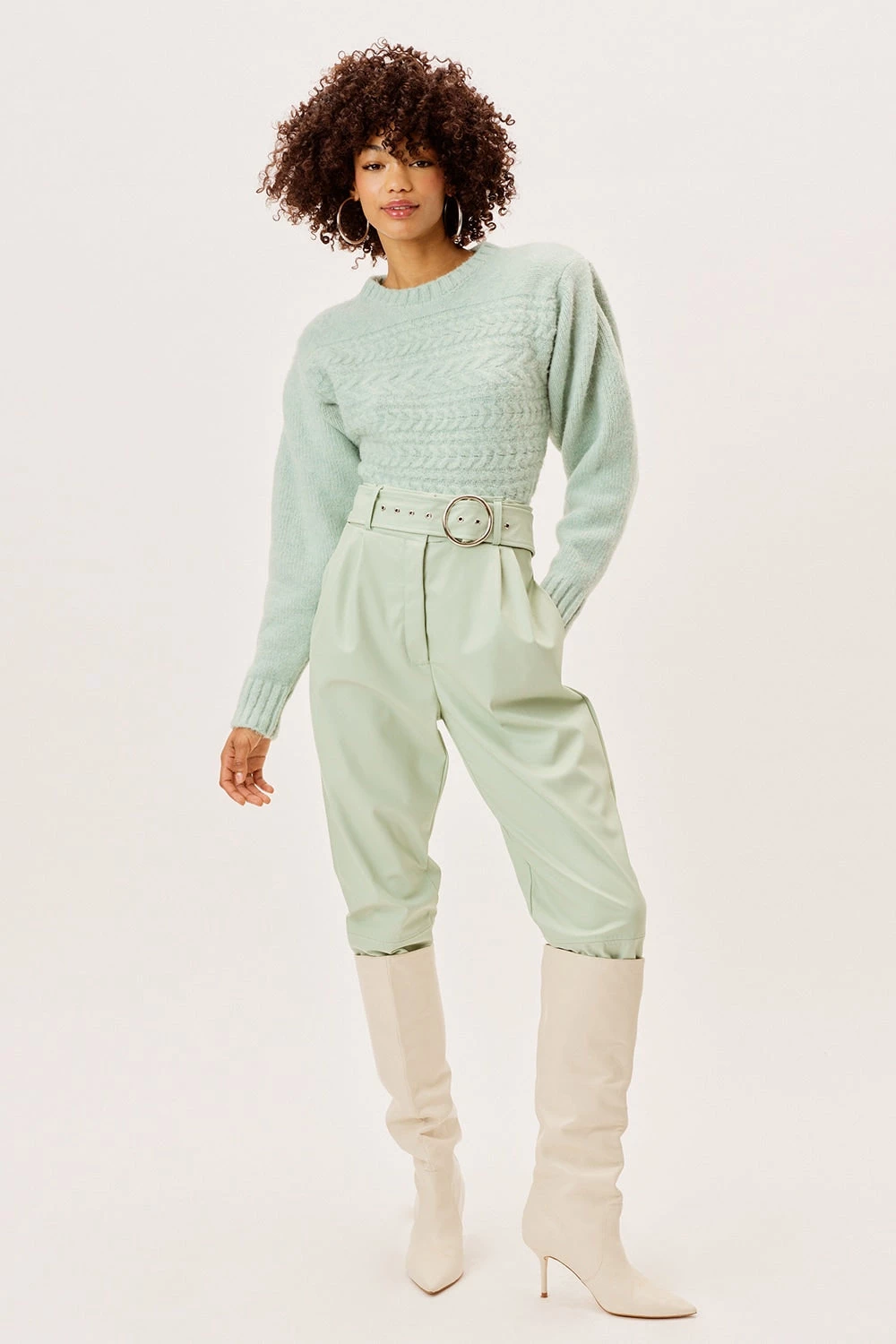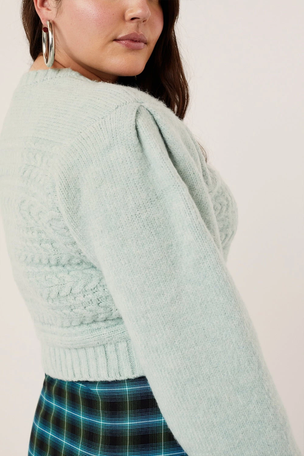 70s-inspired mixed scale cable knit sweater featuring dramatic shoulder pads and a box pleat on sleeves.