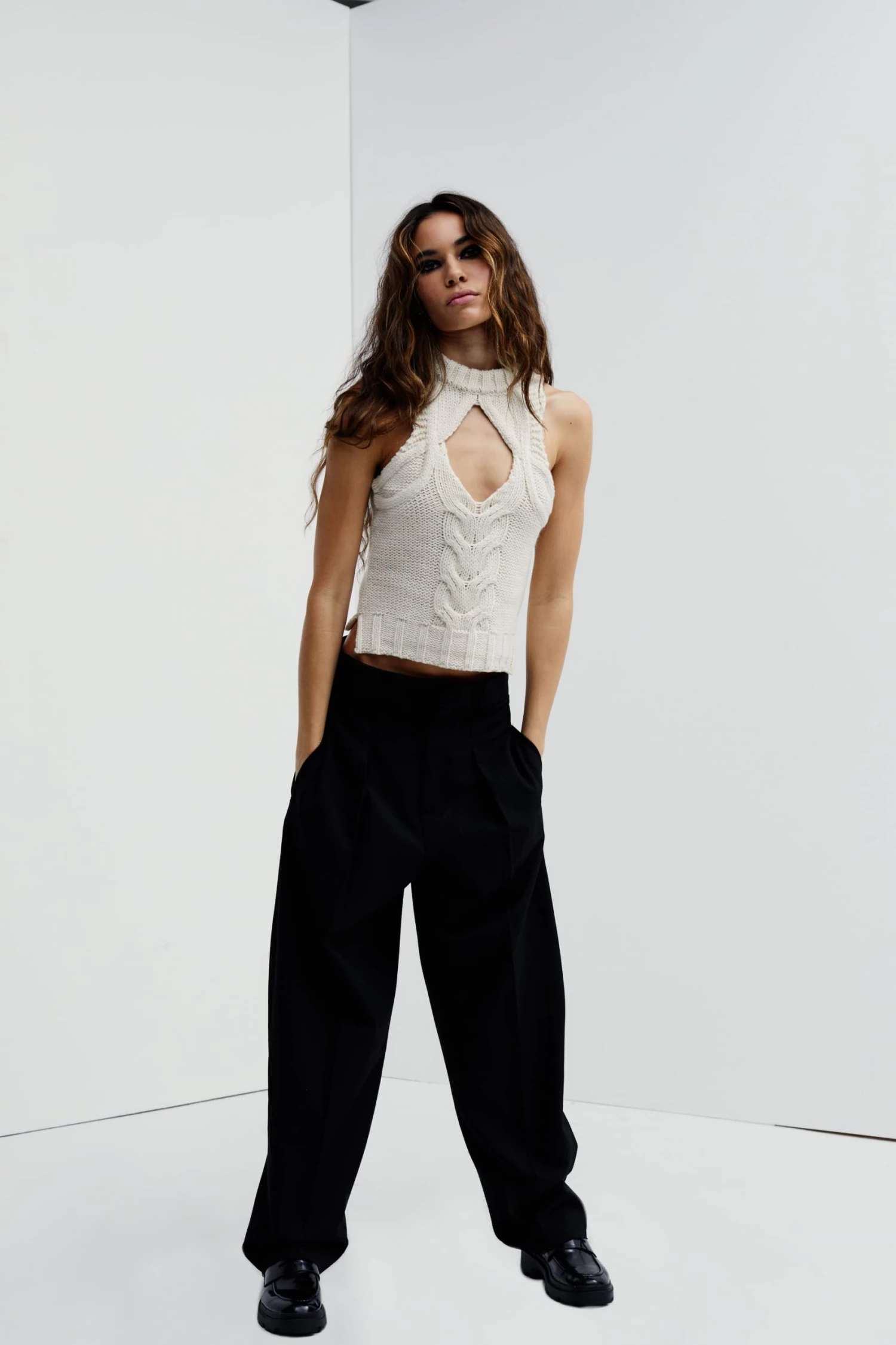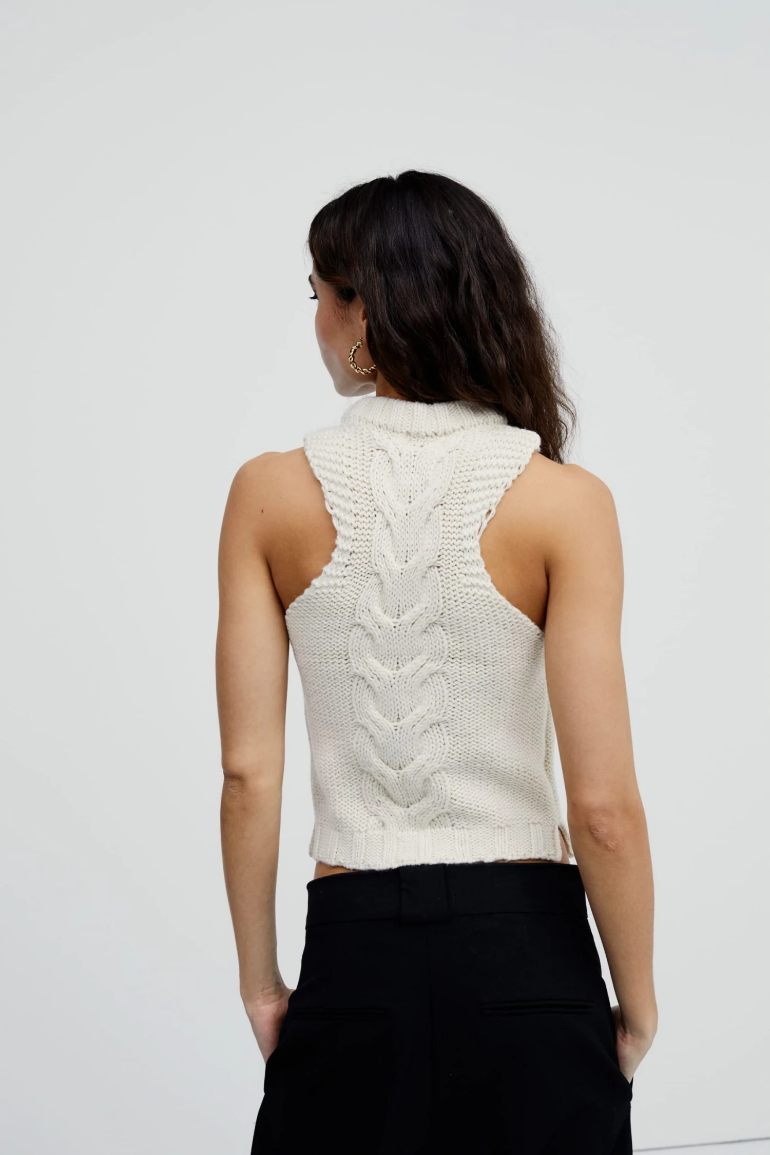 Structured cable knit top featuring a high neck and keyhole cutout at bust. Deliciously soft feel.