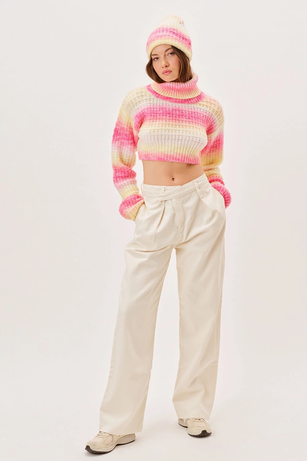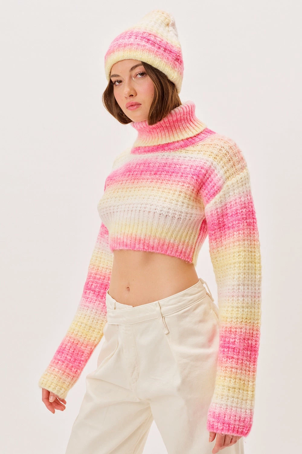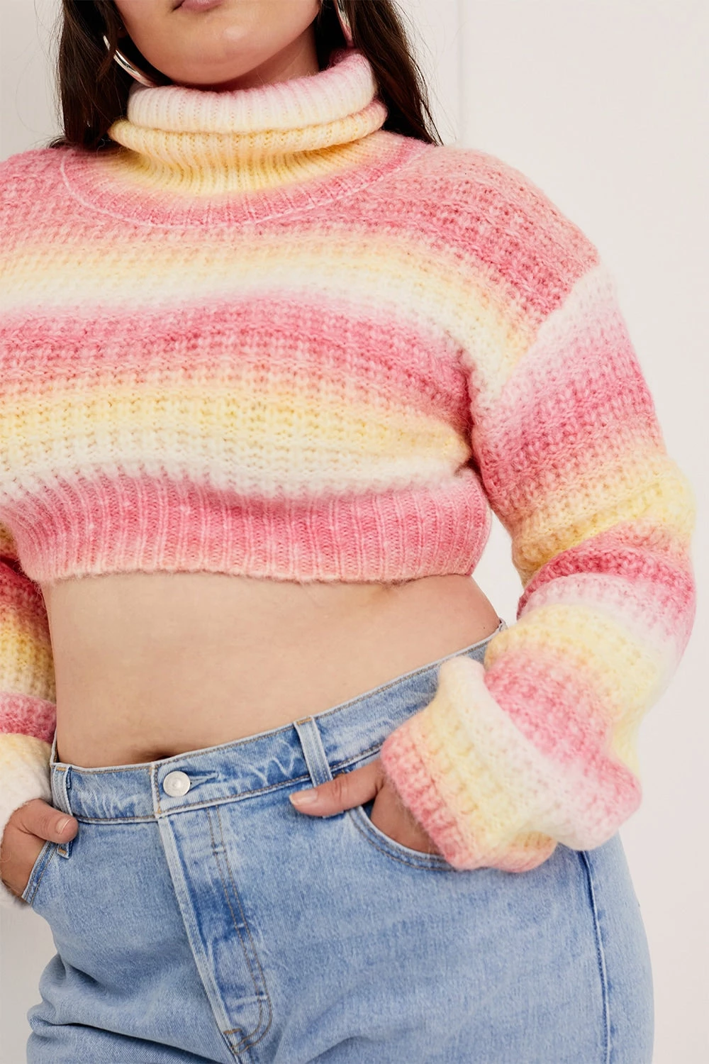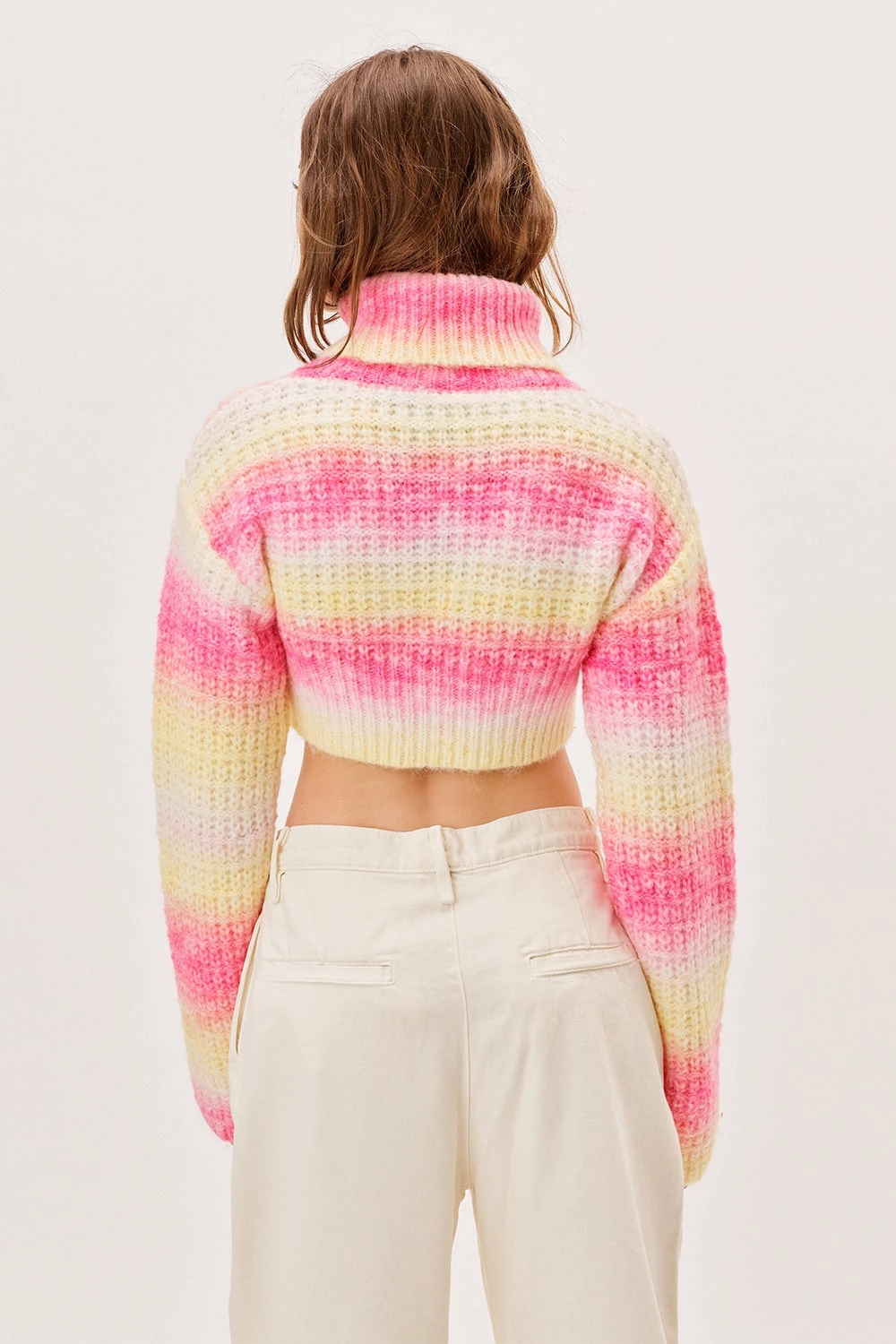 90s-inspired waffle knit ombre stripe cropped tank sweater featuring a dramatic open back. Due to the nature of the ombre detail & knitting process, every piece is unique and will differ slightly from the image on our site.