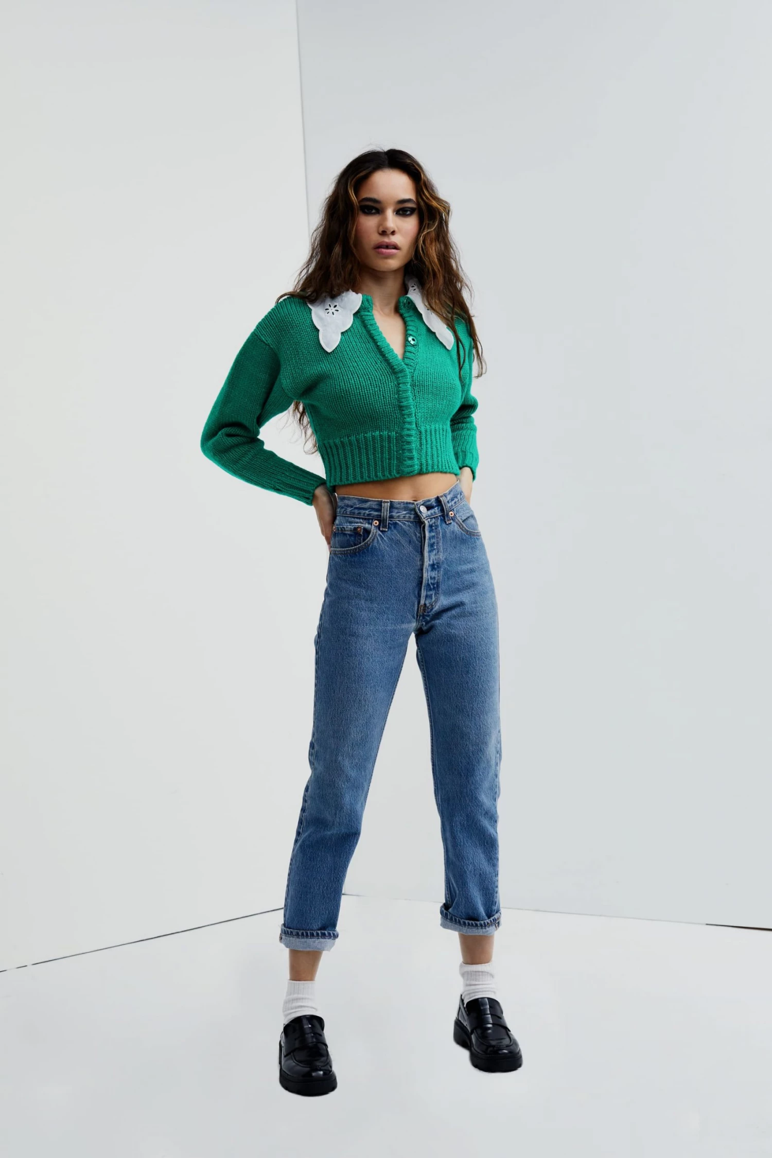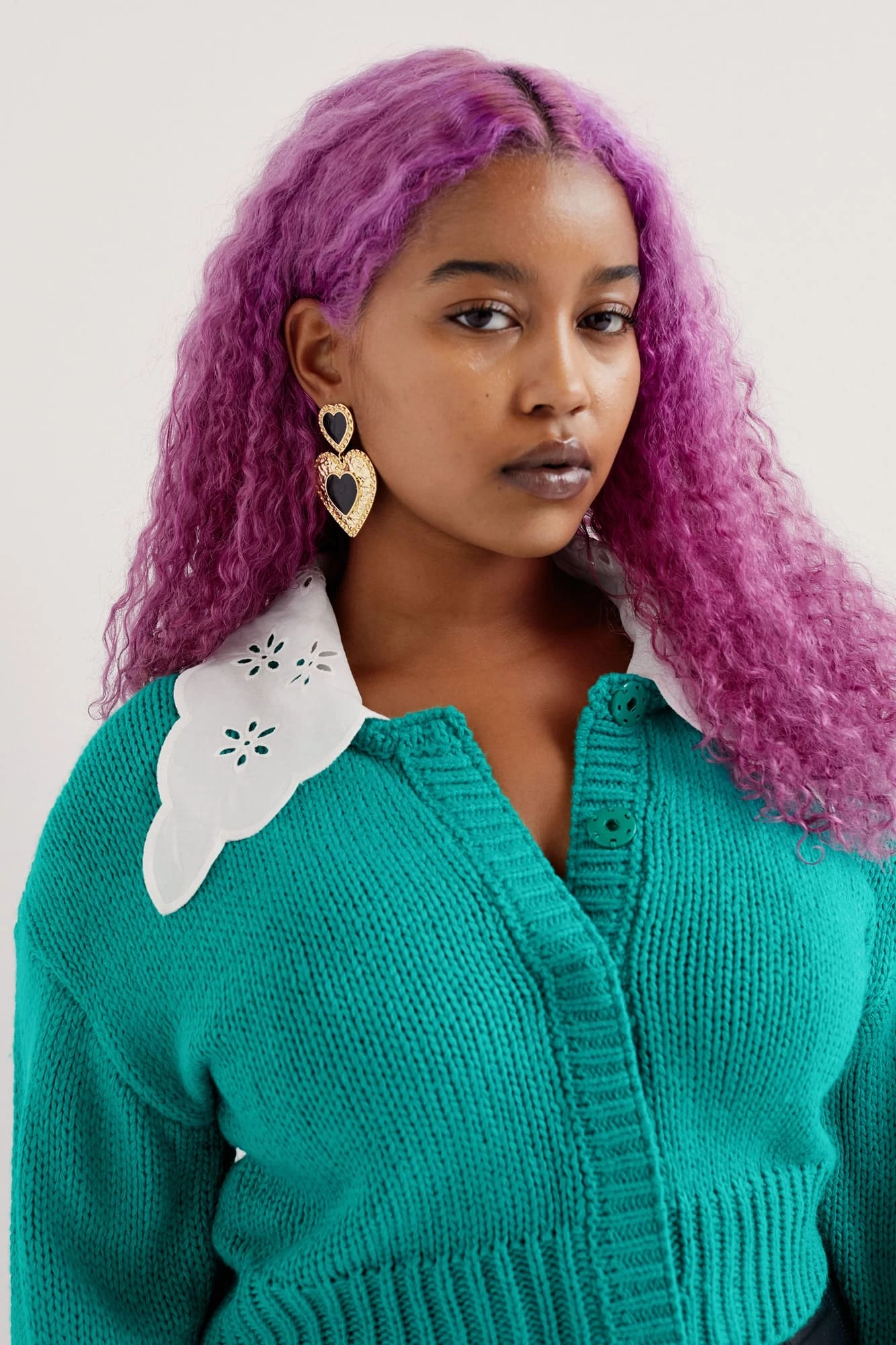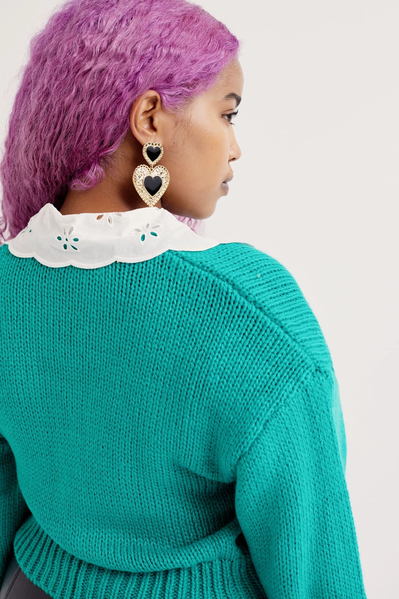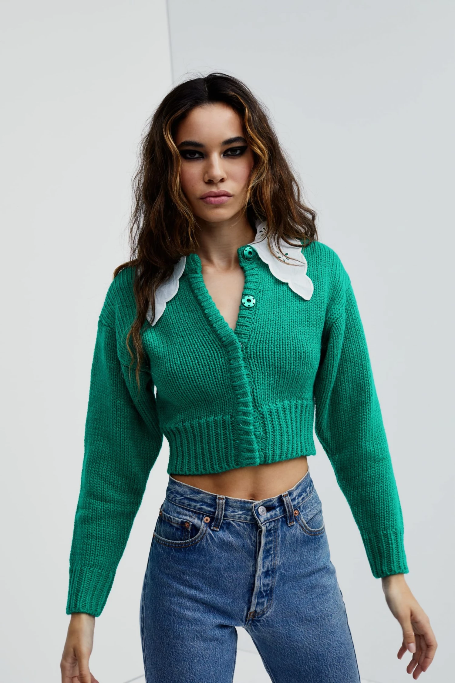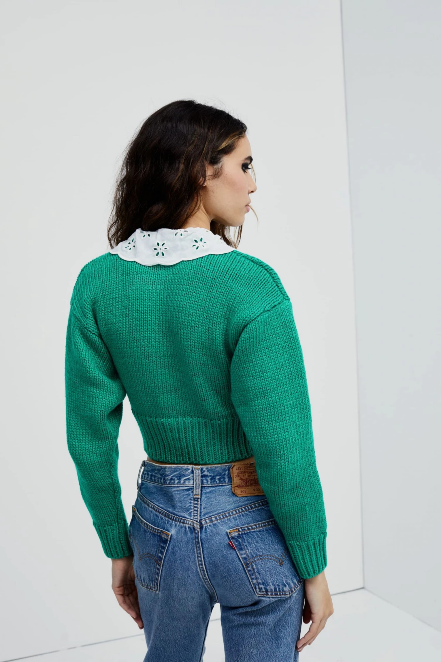 Vintage-inspired knit cardigan featuring a sweet embroidered cotton collar. Structured fit, padded shoulders, tonal snap buttons.