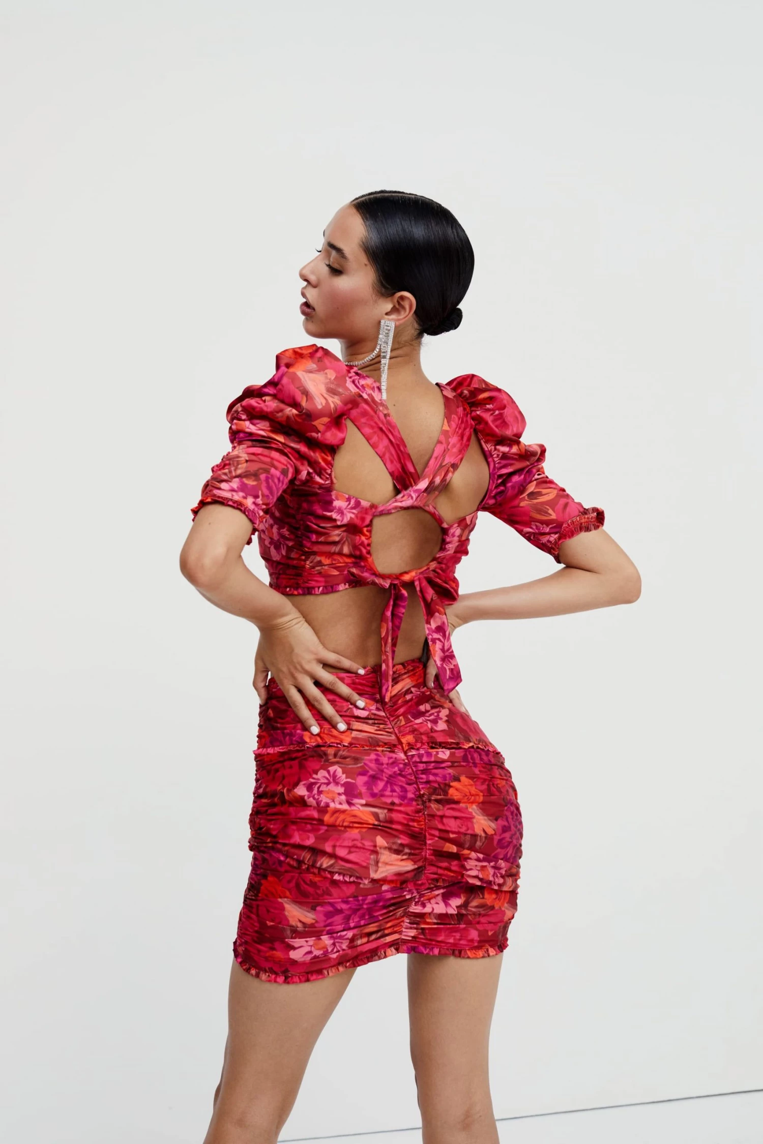 Romantic floral stretch satin mini skirt featuring gathered asymmetrical panels and subtle ruffle trim. Invisible zipper at back, fully lined.