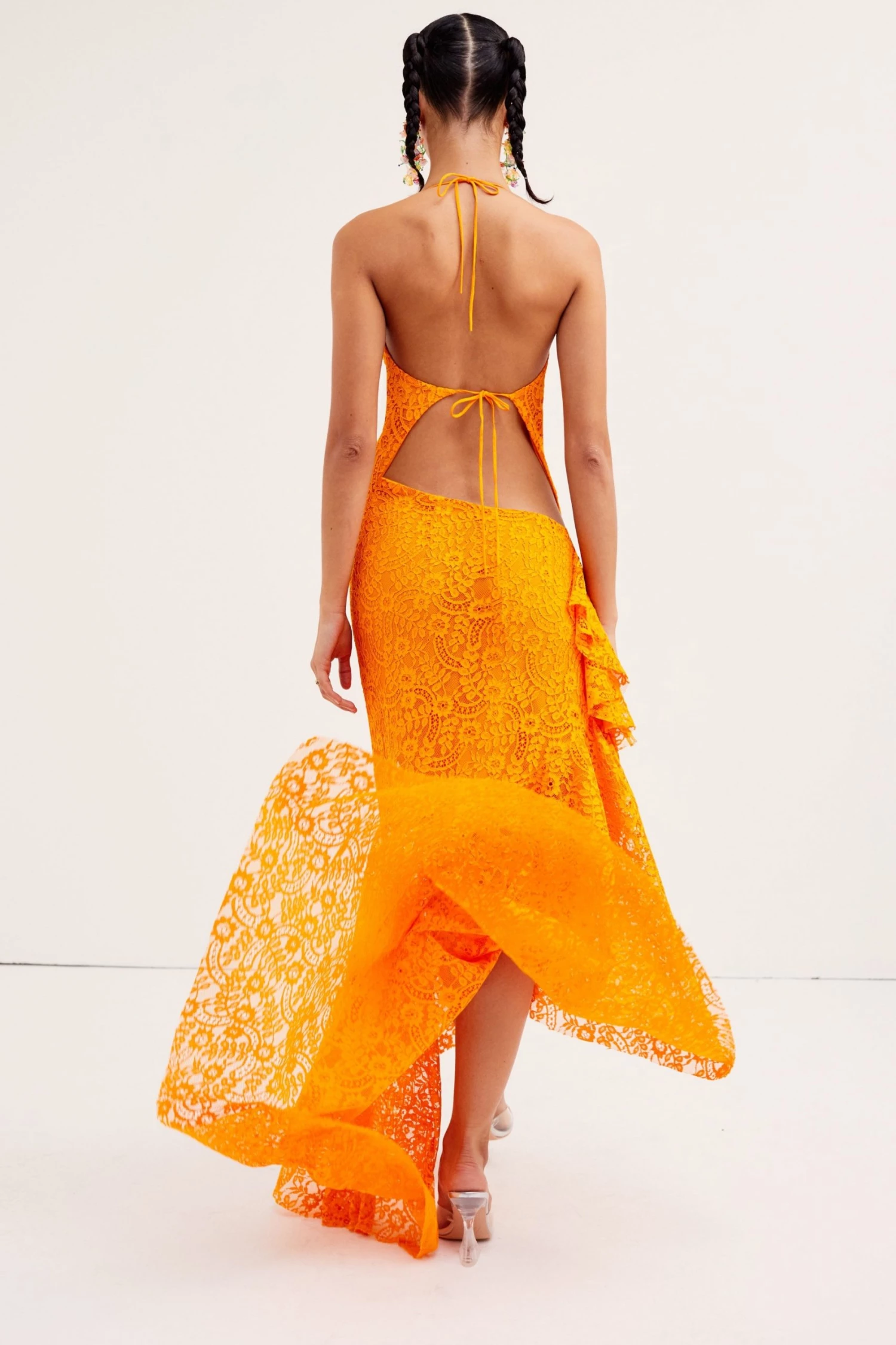 Tropical maxi dress featuring lace-up detailing along the hip with a cascading lace ruffle.
