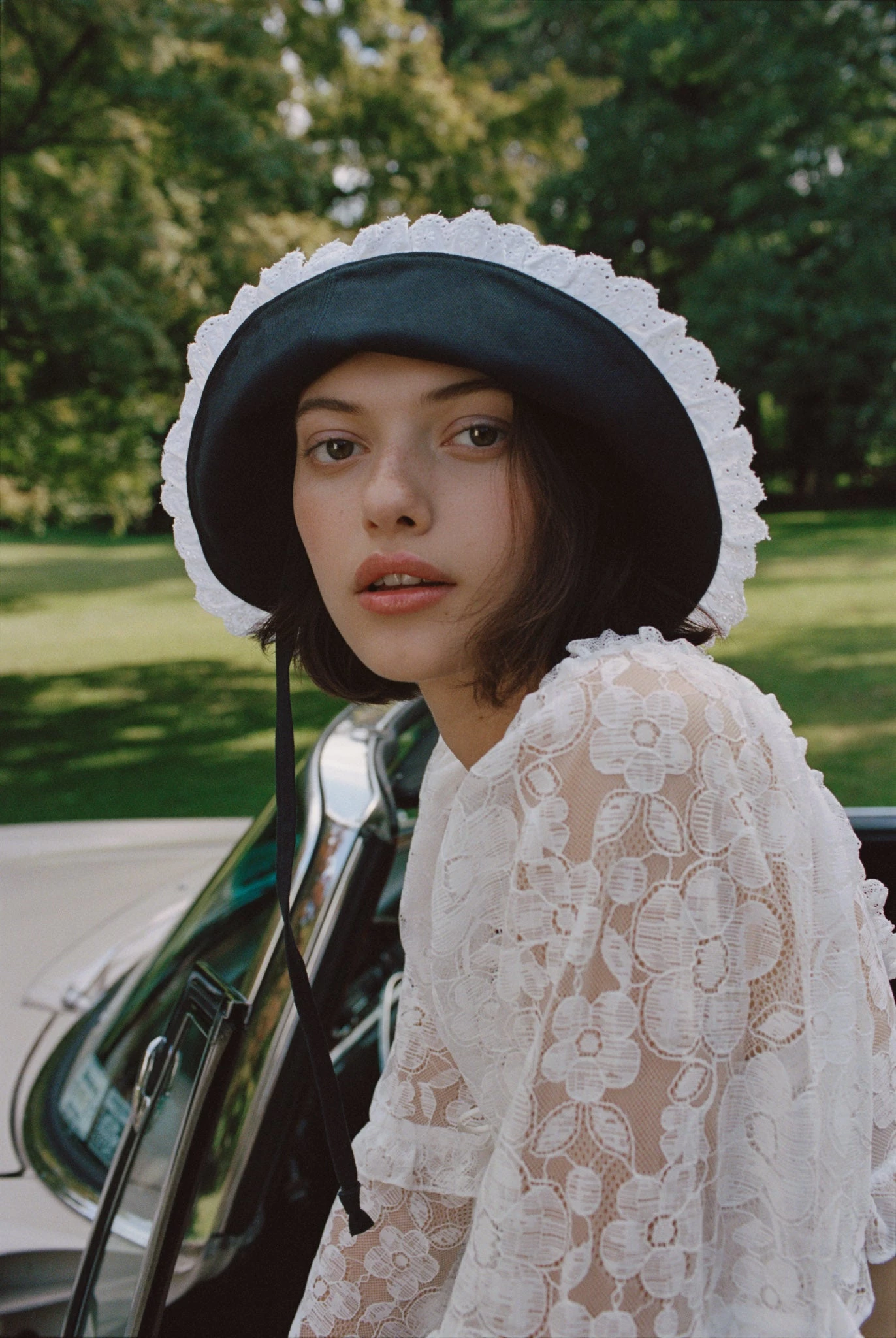 Ethereal lace crop top featuring pintucked cups and ruffled trim. Sheer blouson sleeves, bra closure at back.