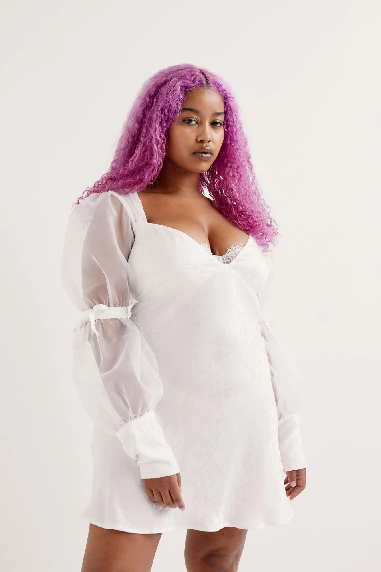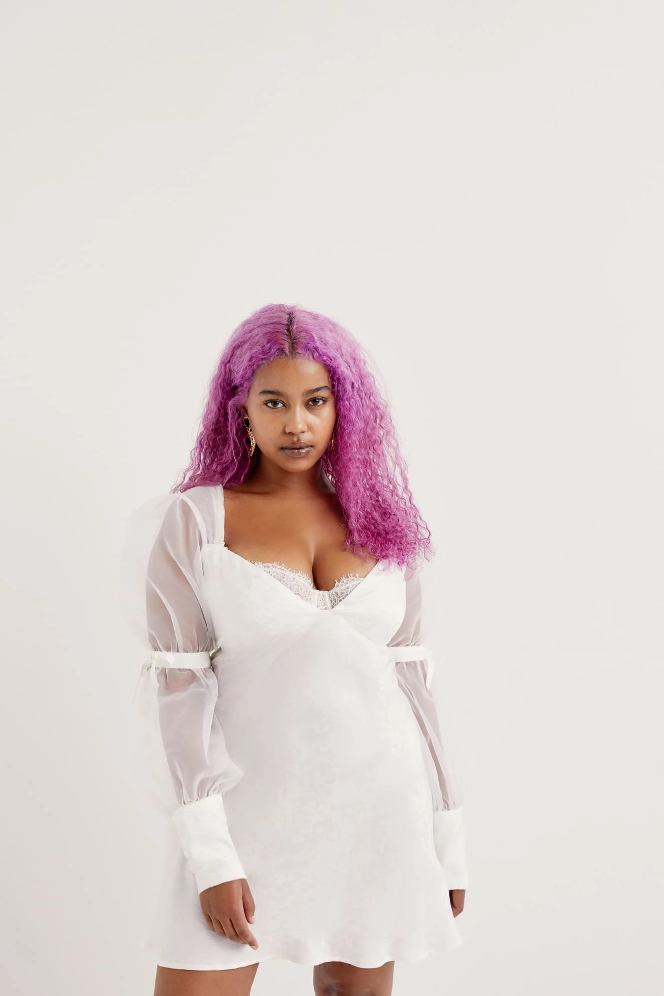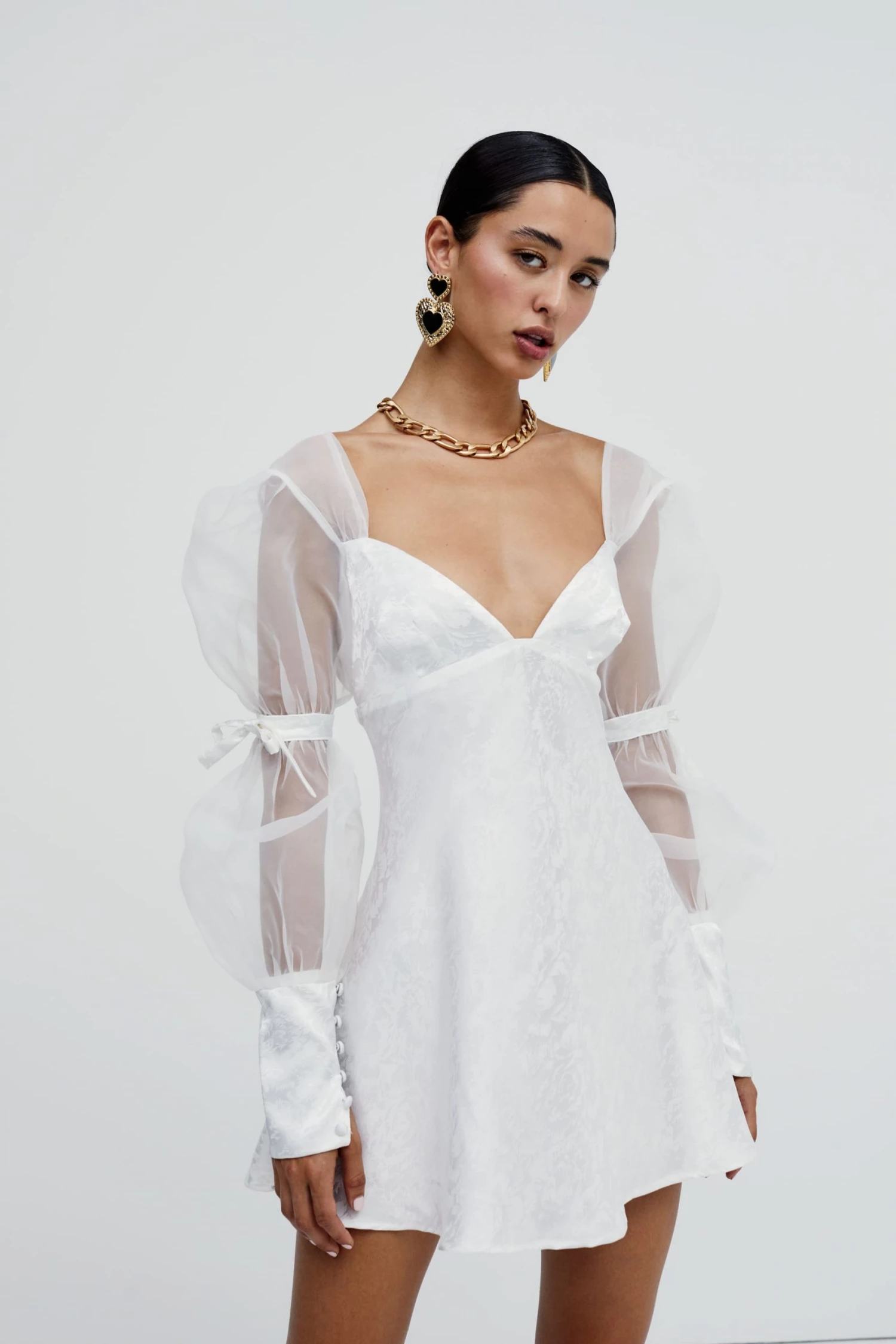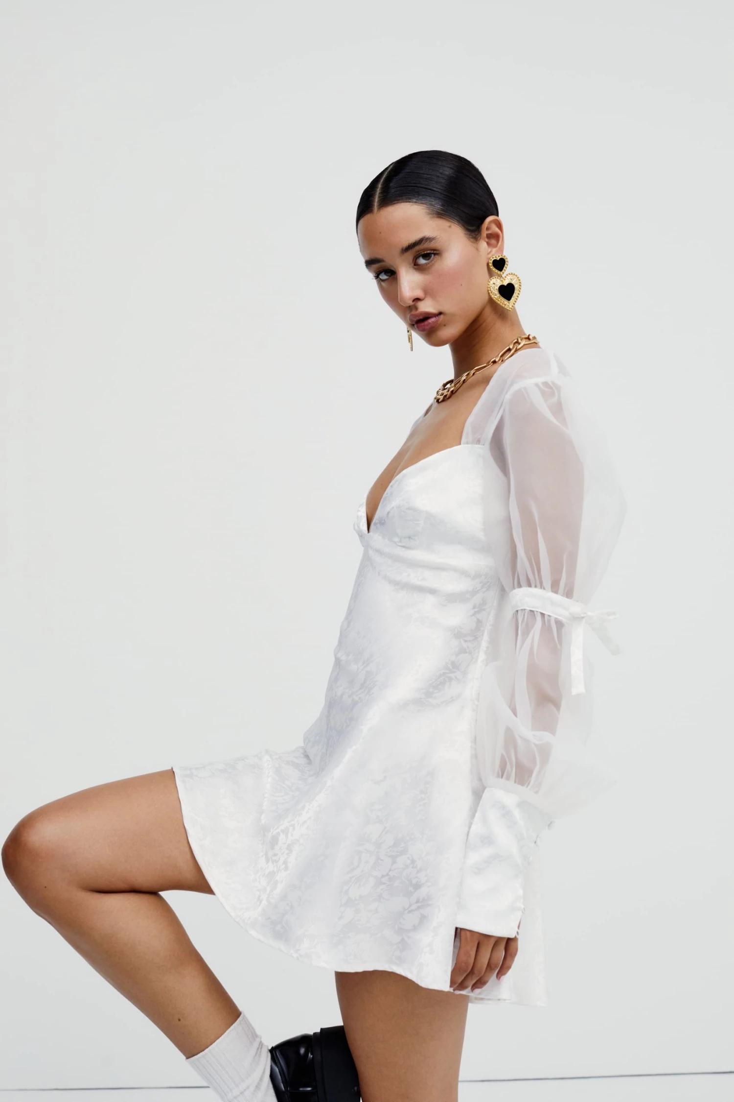 Sweet satin jacquard mini dress featuring a sweetheart neckline and a swing skirt. Full organza sleeves with a delicate tie at elbow. Tall cuffs with tonal satin buttons. Partially lined, invisible zipper at side.