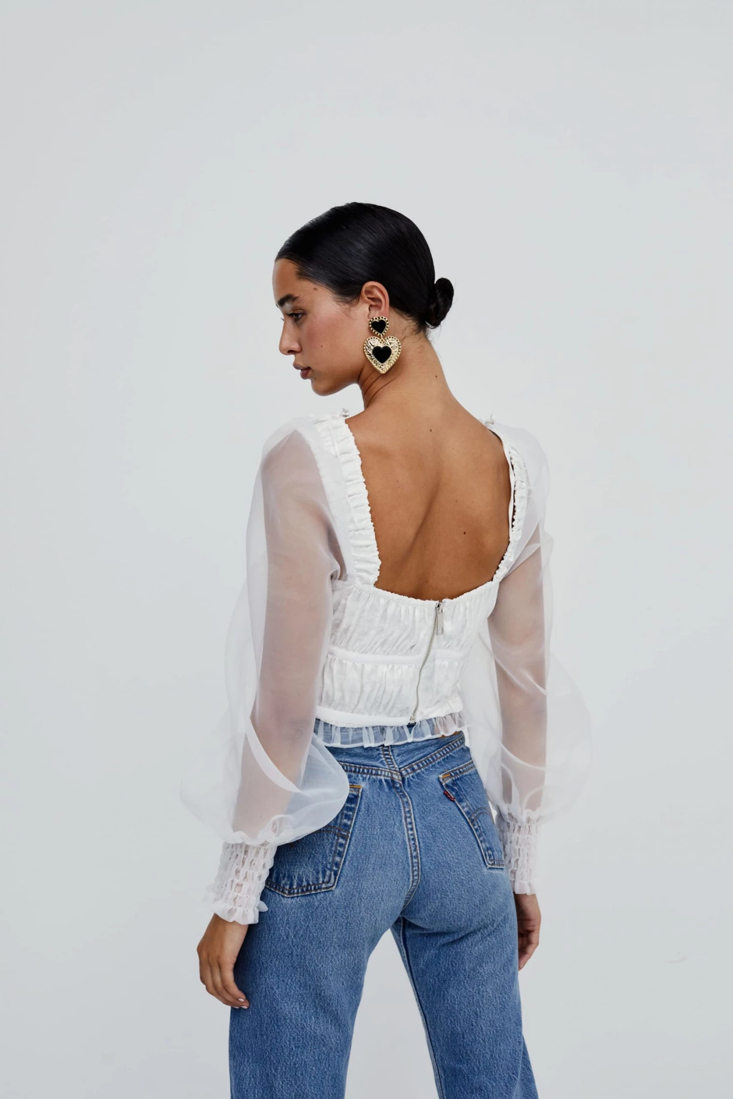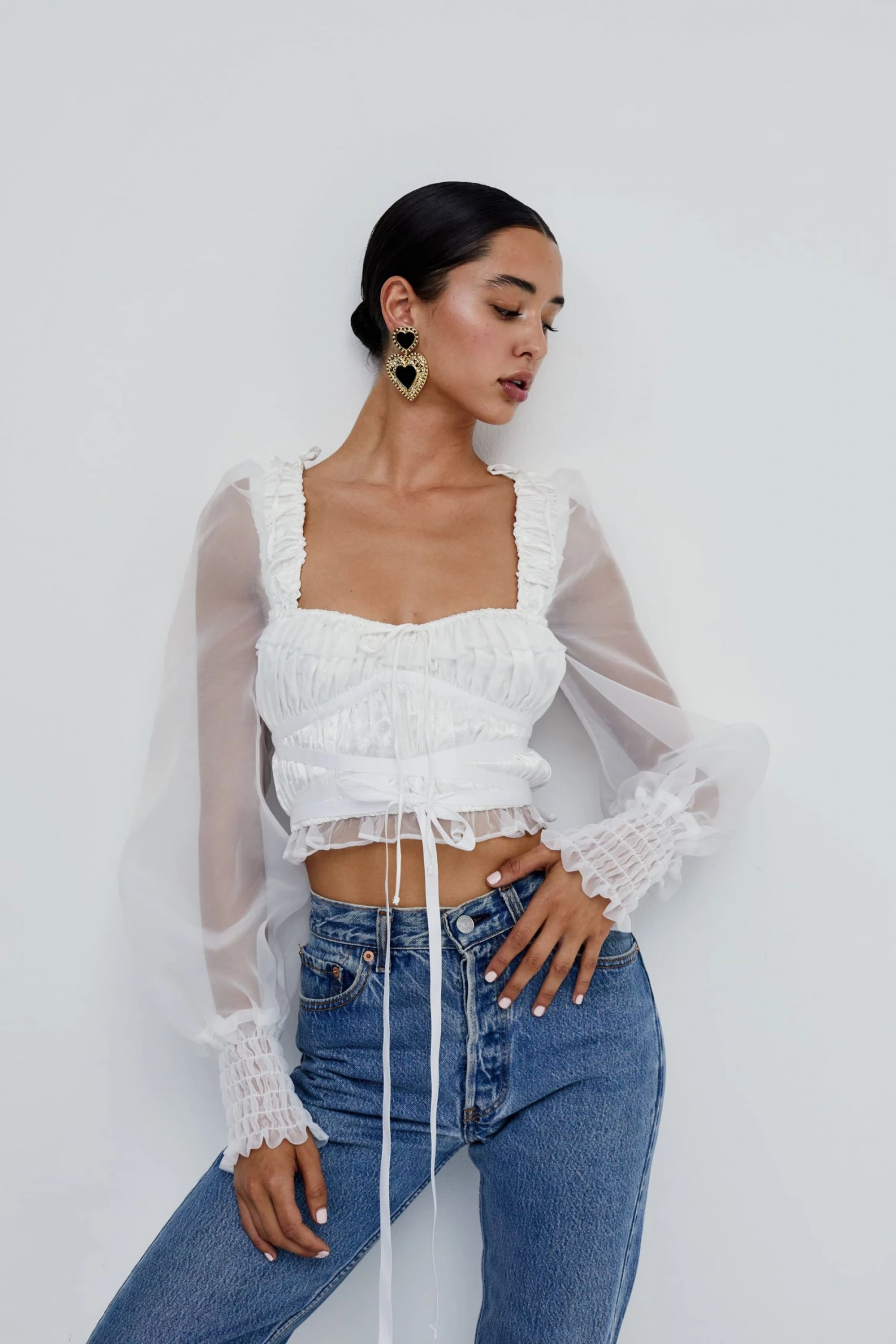 Sweet satin jacquard top featuring a sheer bust overlay and satin ribbon lacing throughout. Full organza sleeve with a smocked cuff. Zipper at back.