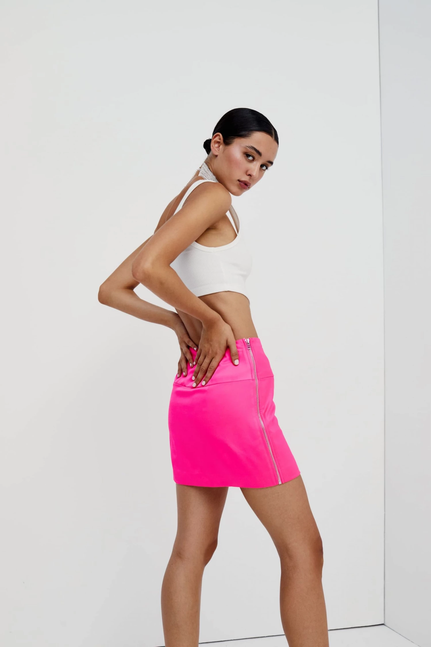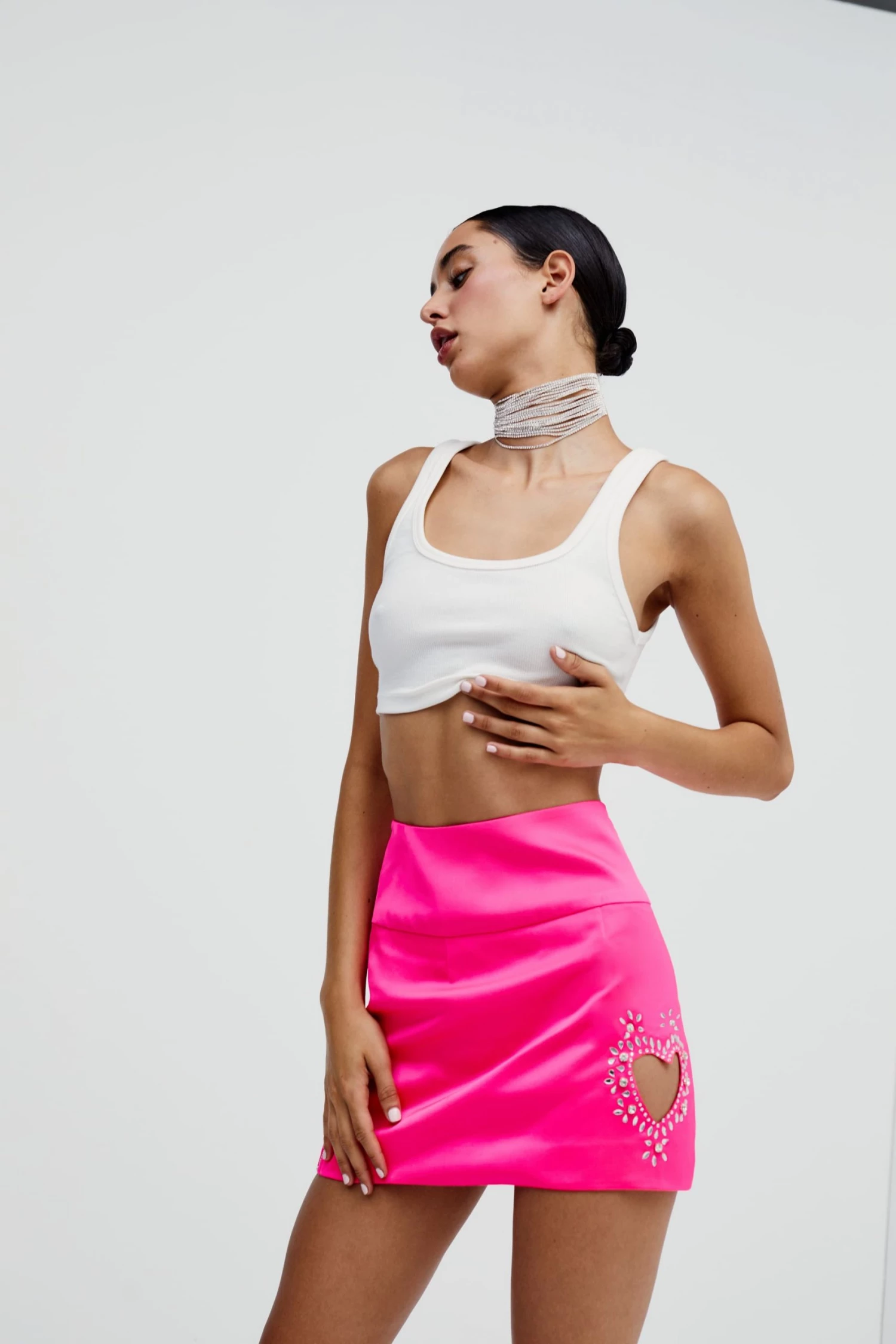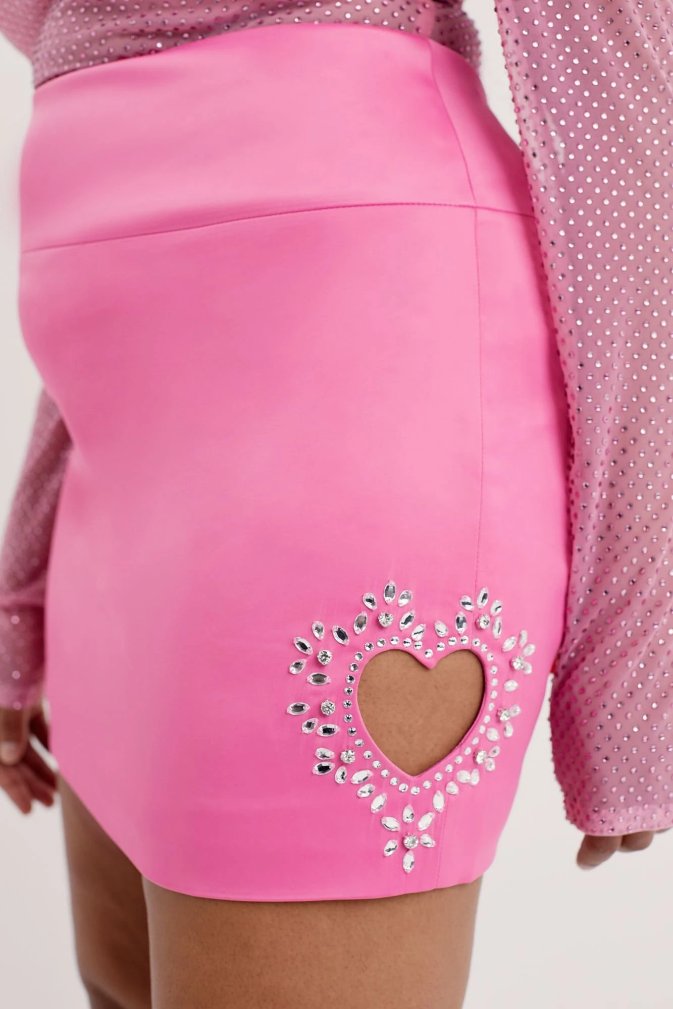 Sleek duchess satin body-skimming mini skirt featuring a cut-out heart with crystal detailing. Zipper at side, fully lined.