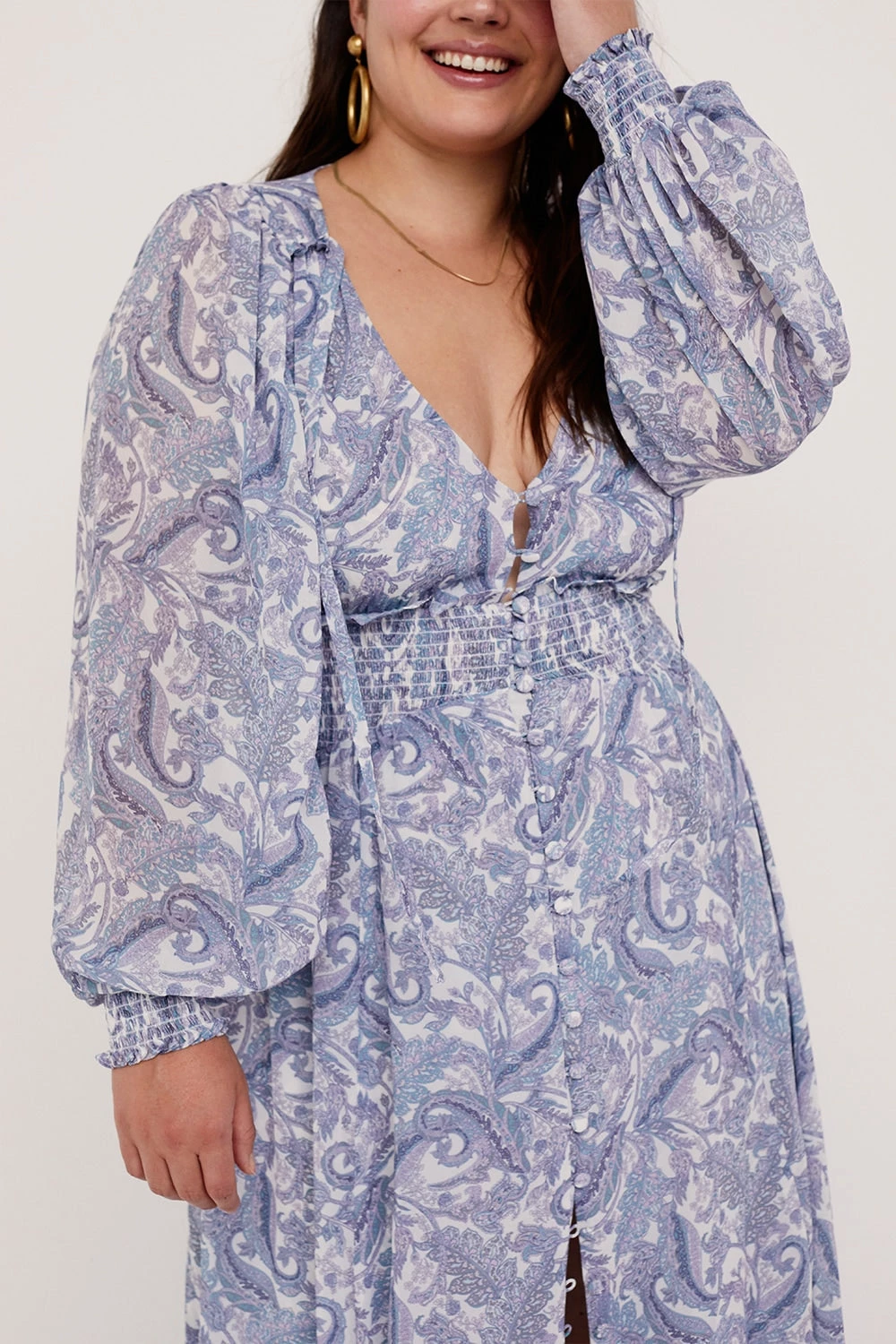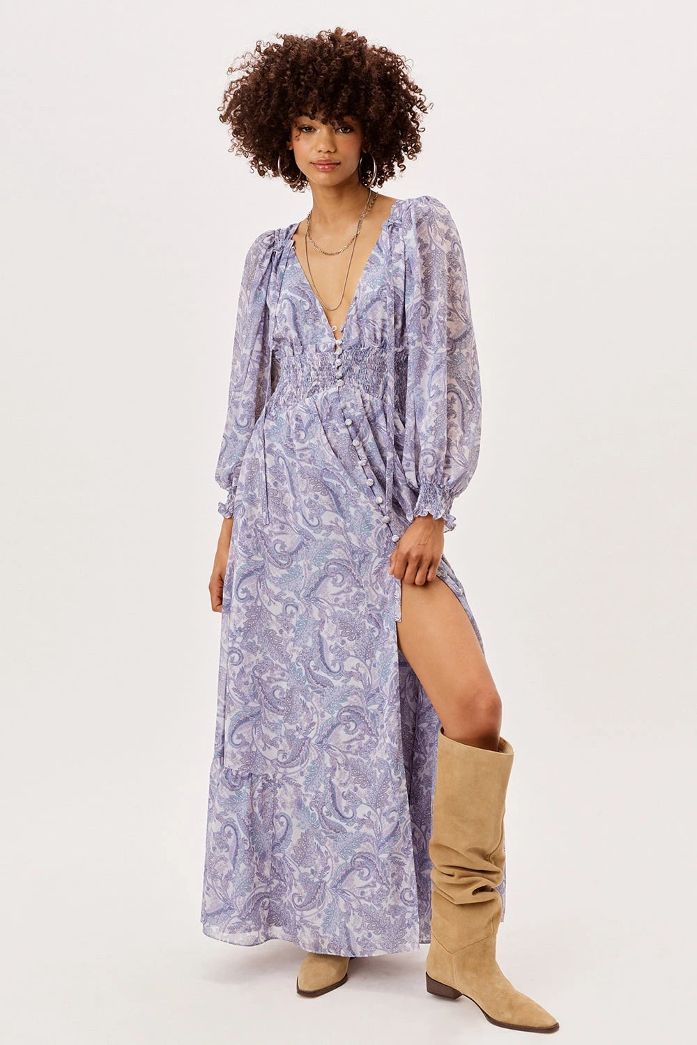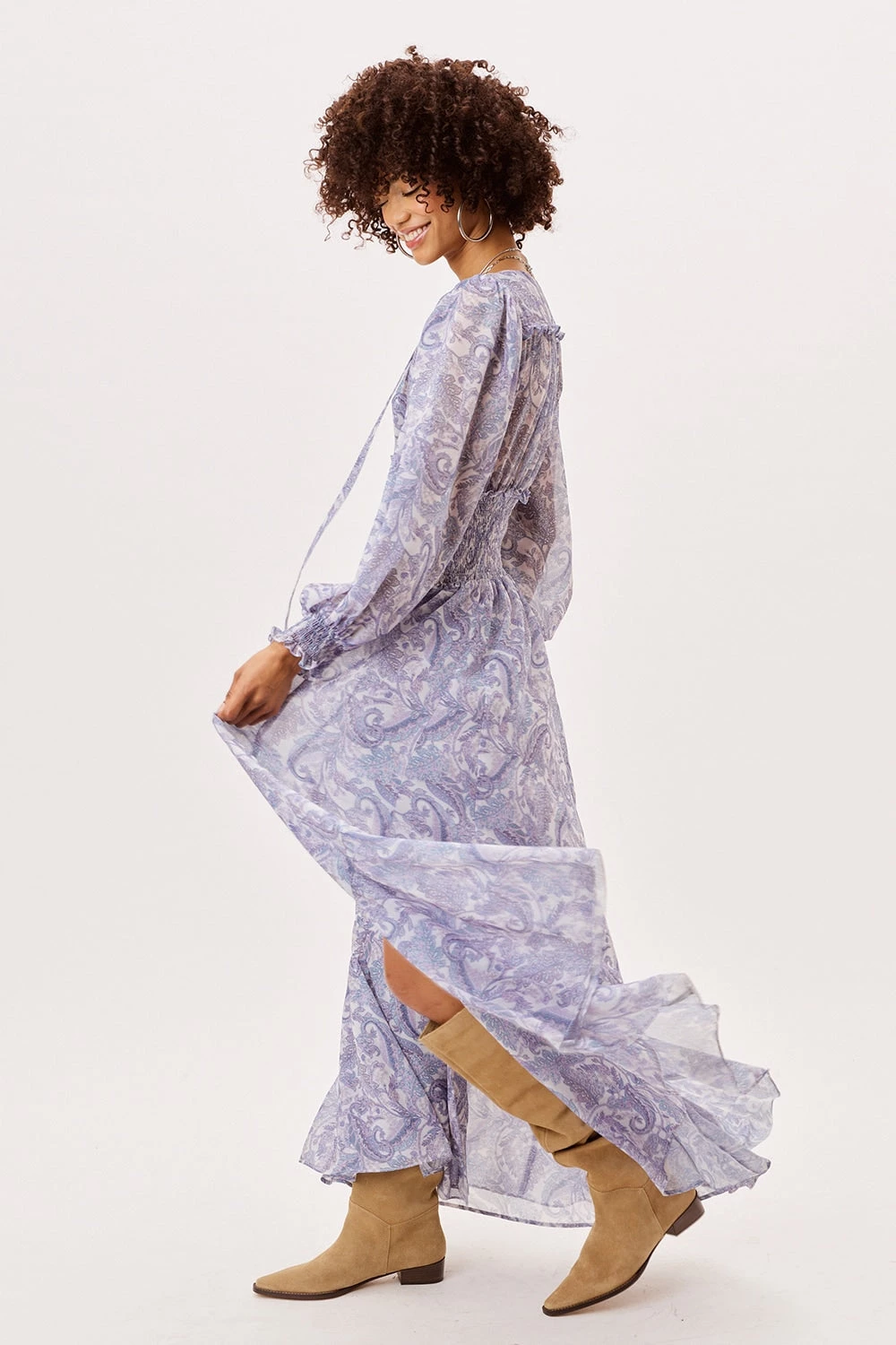 Feather paisley print chiffon maxi dress featuring billowy long sleeves, tonal front buttons, and delicate drawstring ties at shoulders and waist. Made of recycled poly.