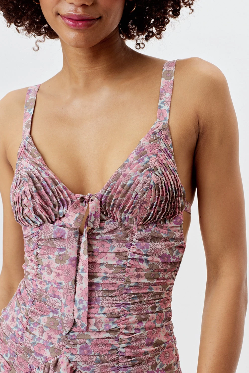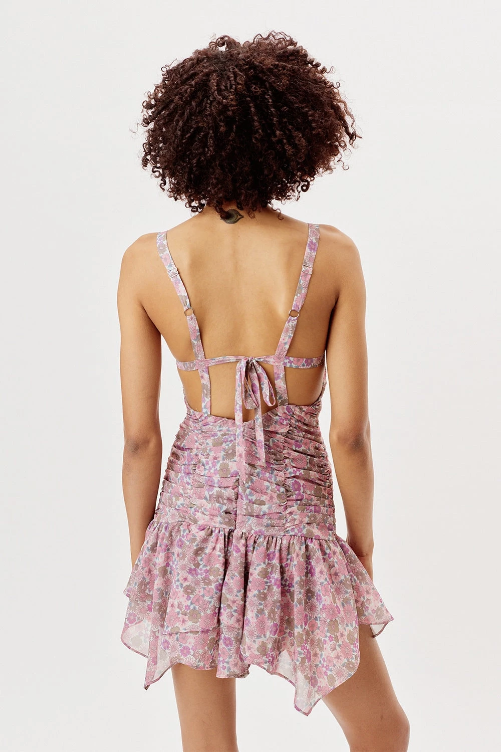 70s-inspired woodstock floral chiffon mini dress featuring feminine pintucked cups, figure-flattering shirring along waist, and pretty tie closures along bust and back. Handkerchief tiered skirt, invisible zipper closure. Fully lined.