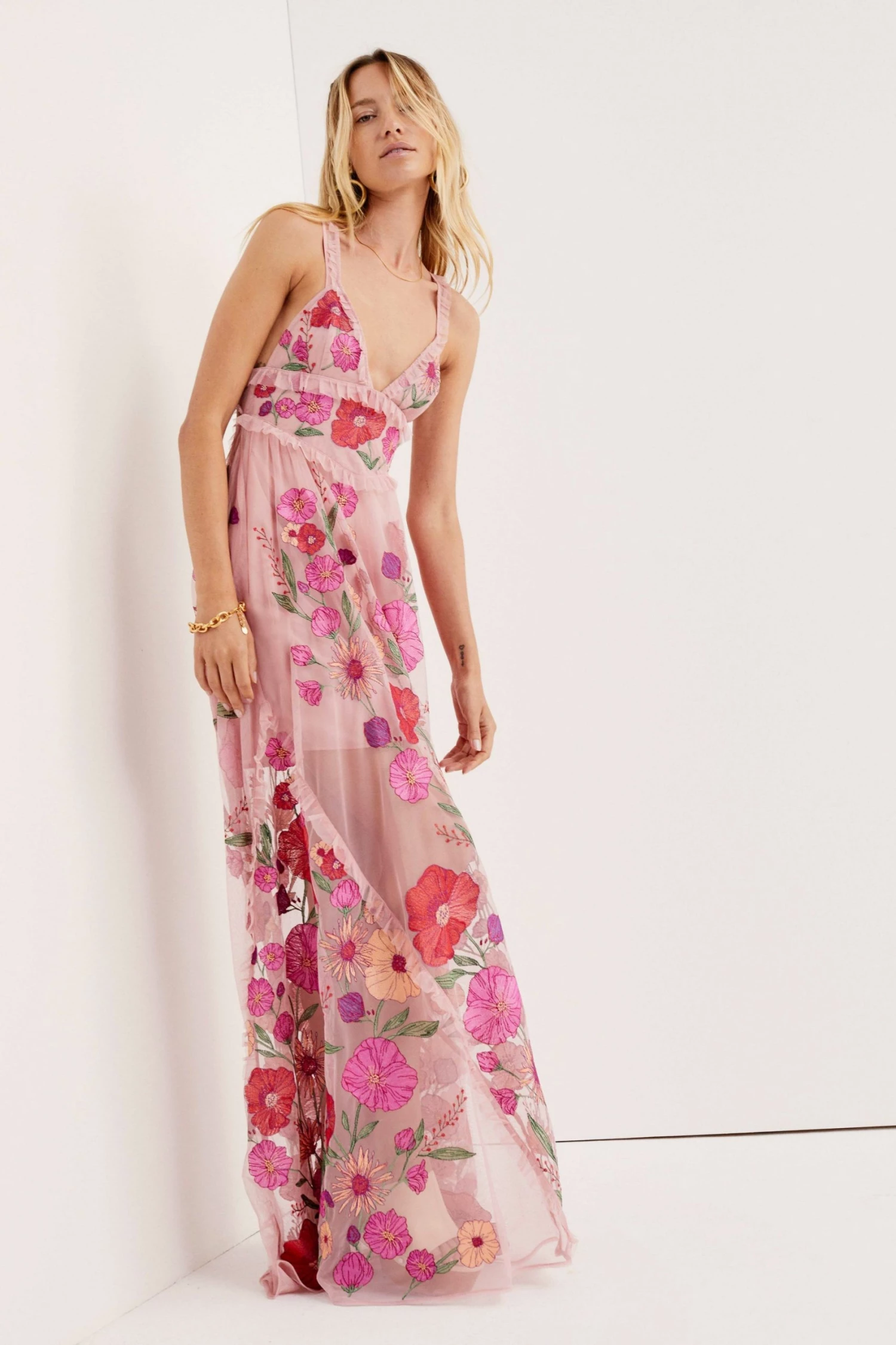 Vibrant eco tulle maxi dress featuring bold floral embroidery and feminine ruffles throughout. Delicate straps criss-cross at a low open back. Removable slip lining.