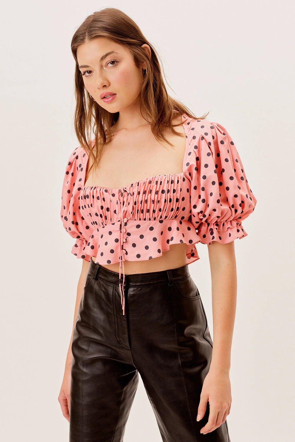 Sweet polka dot print poplin crop top featuring a sweetheart neckline, feminine shirred bust, and tonal front buttons. Delicate ties at bust and back, partially lined.
