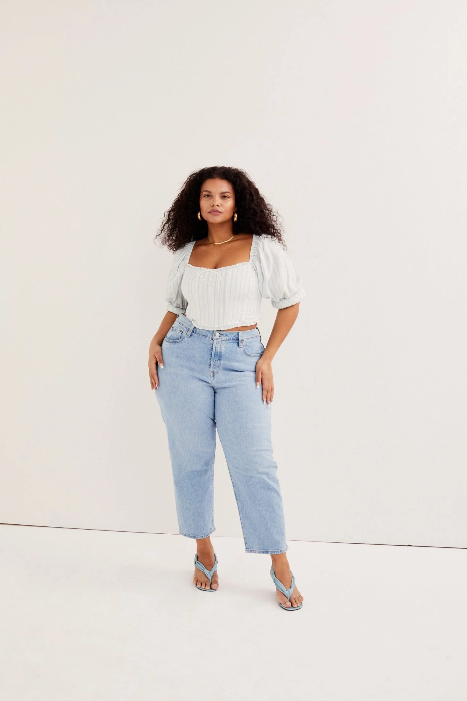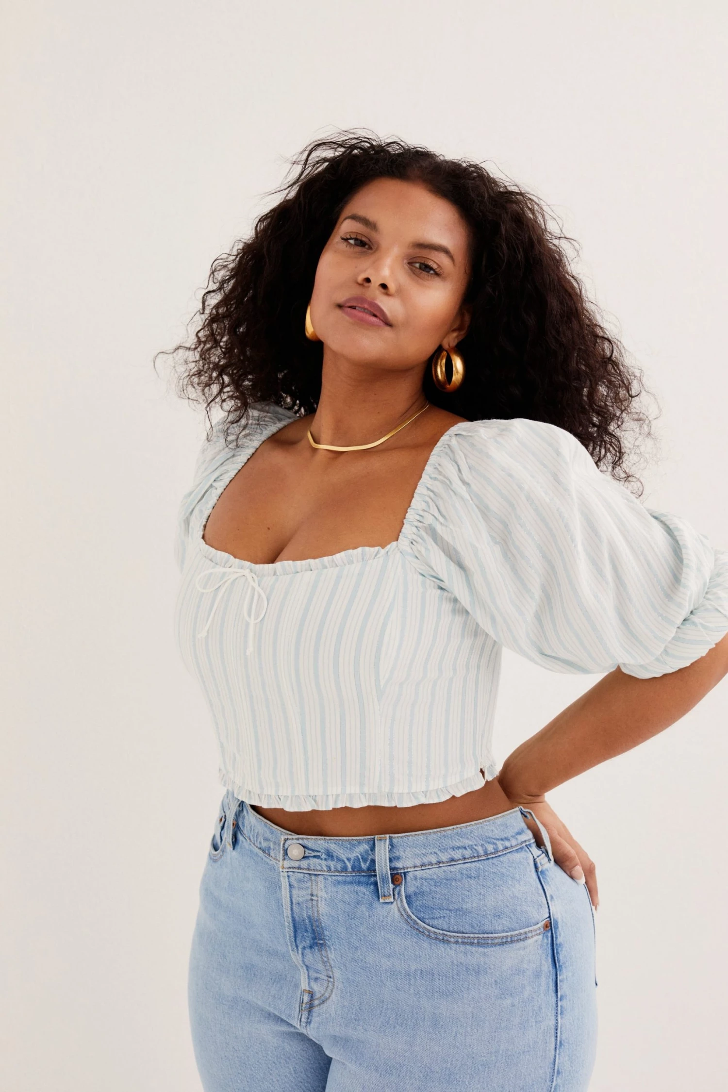 Picnic-ready crop top featuring thin shimmering lurex stripes and a delicate lace-up back. Corset seam detailing, puff sleeves have a structured cuff with twisted detailing.