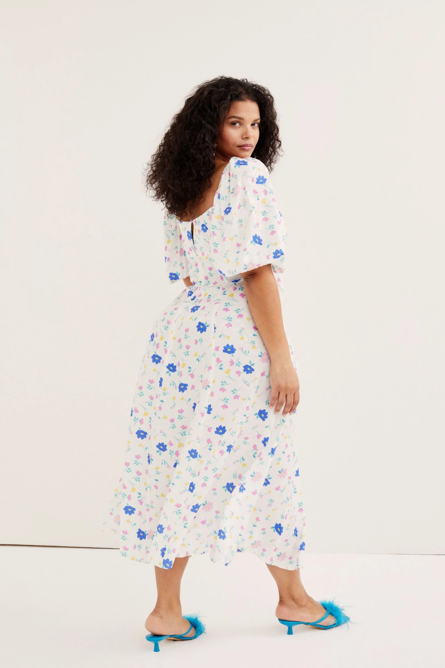 Fresh floral printed maxi dress featuring pin-tucked bust details and puff sleeves. Delicate buttons down front with a decorative tie. Keyhole at bust. Made from LENZINGâ„¢ ECOVEROâ„¢fibers.