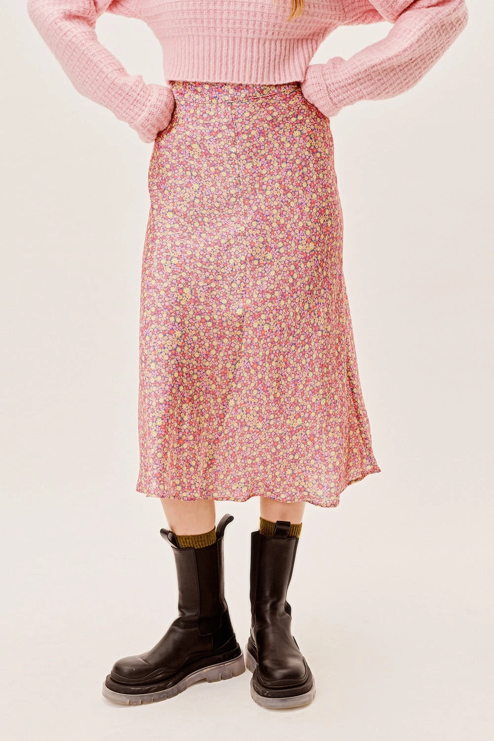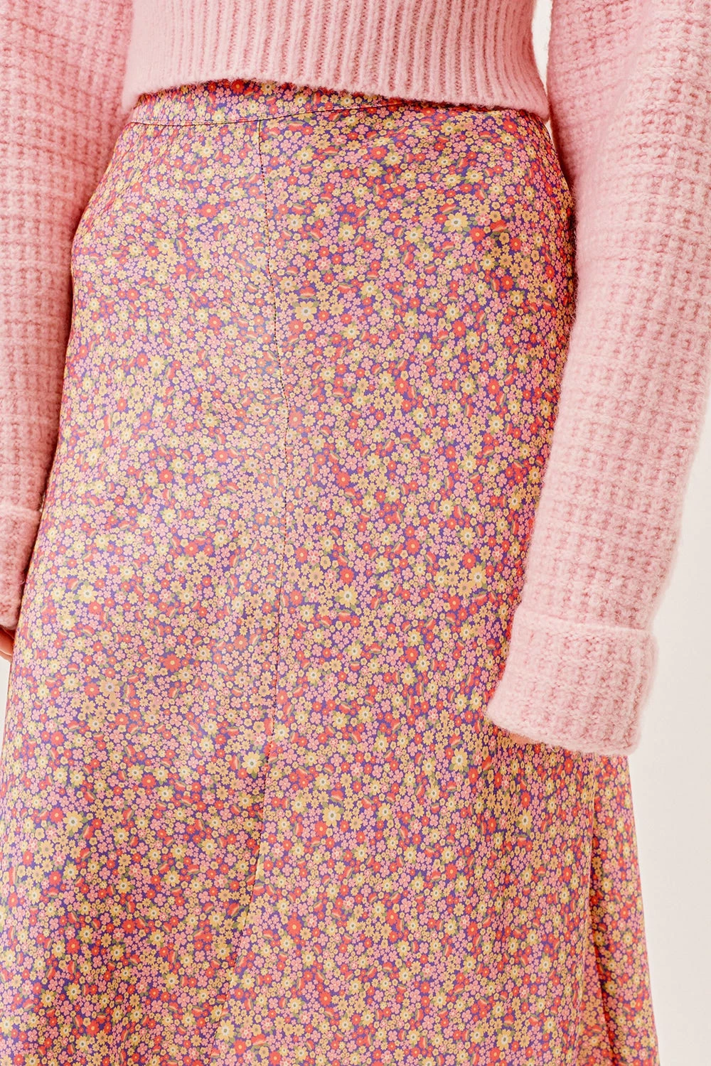 Ultra-feminine floral satin maxi skirt featuring a flowy silhouette. Seam line detailing at front and back, zipper closure.