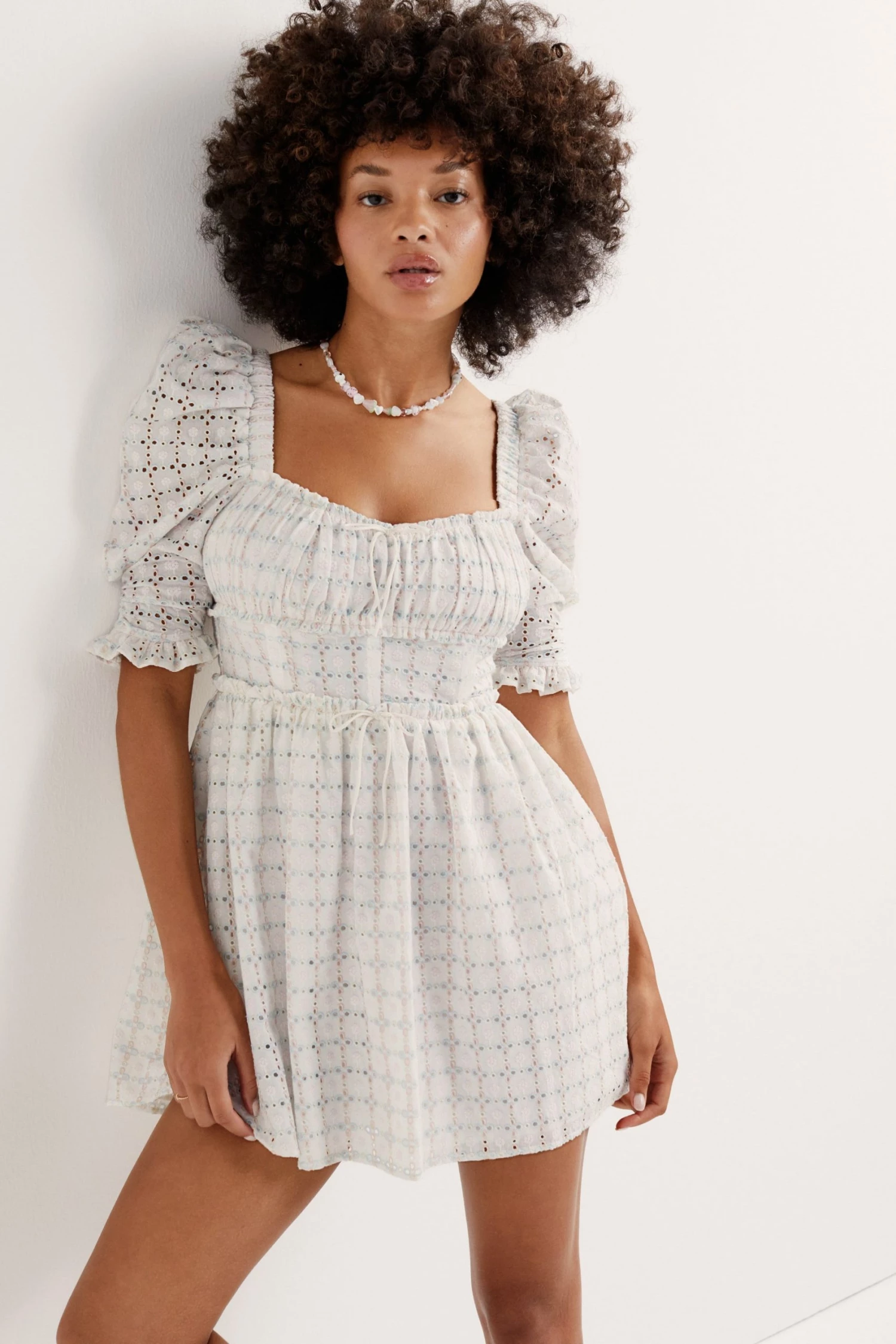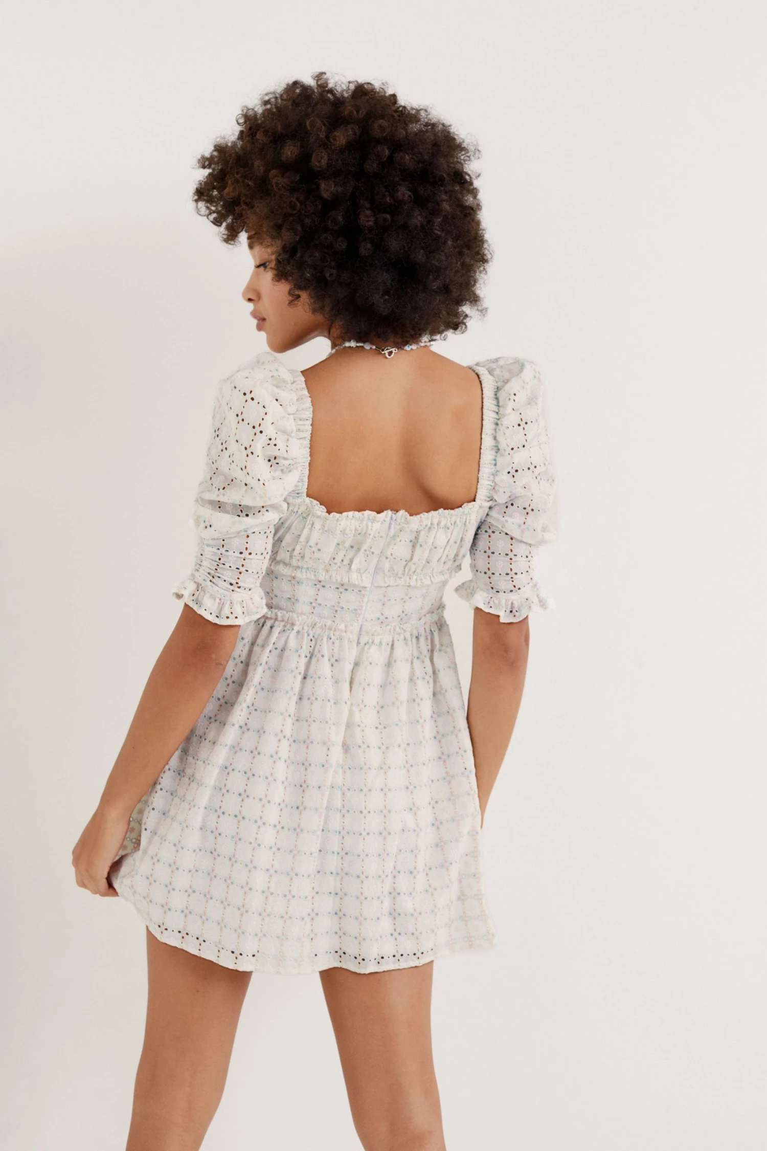 Airy mini dress featuring daisy eyelet embroidery and shirred detailing at bust. Short gathered sleeves, full skirt with a delicate ruffle at waist.