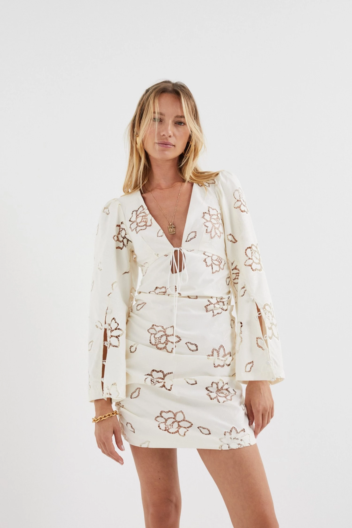 Dreamy mini dress featuring oversized embroidered rose cutouts and vintage-inspired bell sleeves with dainty buttons. Small keyhole at bust with a delicate tie.