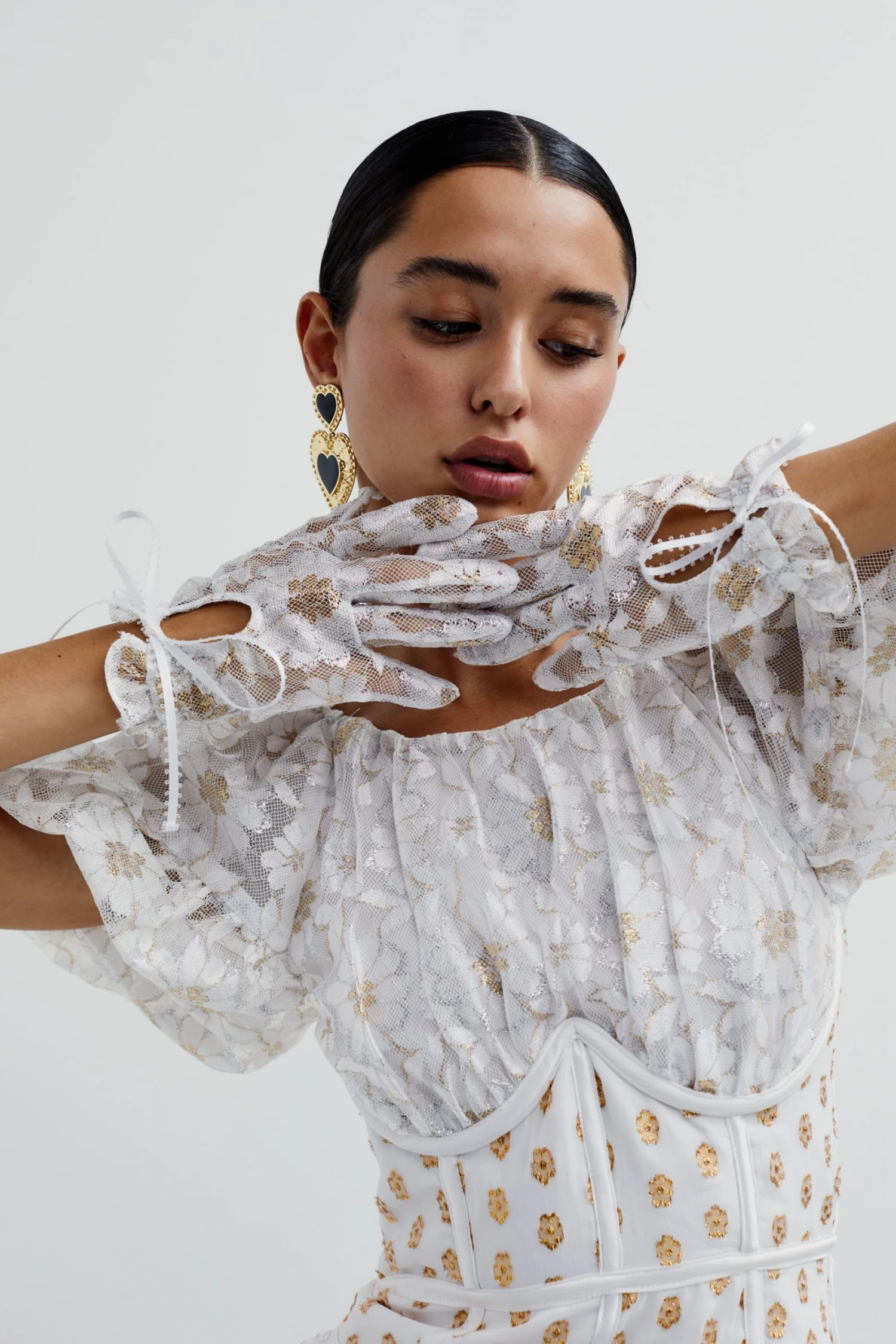 Sweet daisy lace gloves featuring a dainty keyhole at top and decorative bow at wrist. Picot ribbon and ruffle detailing at cuff. Stretch elastic at wrist.