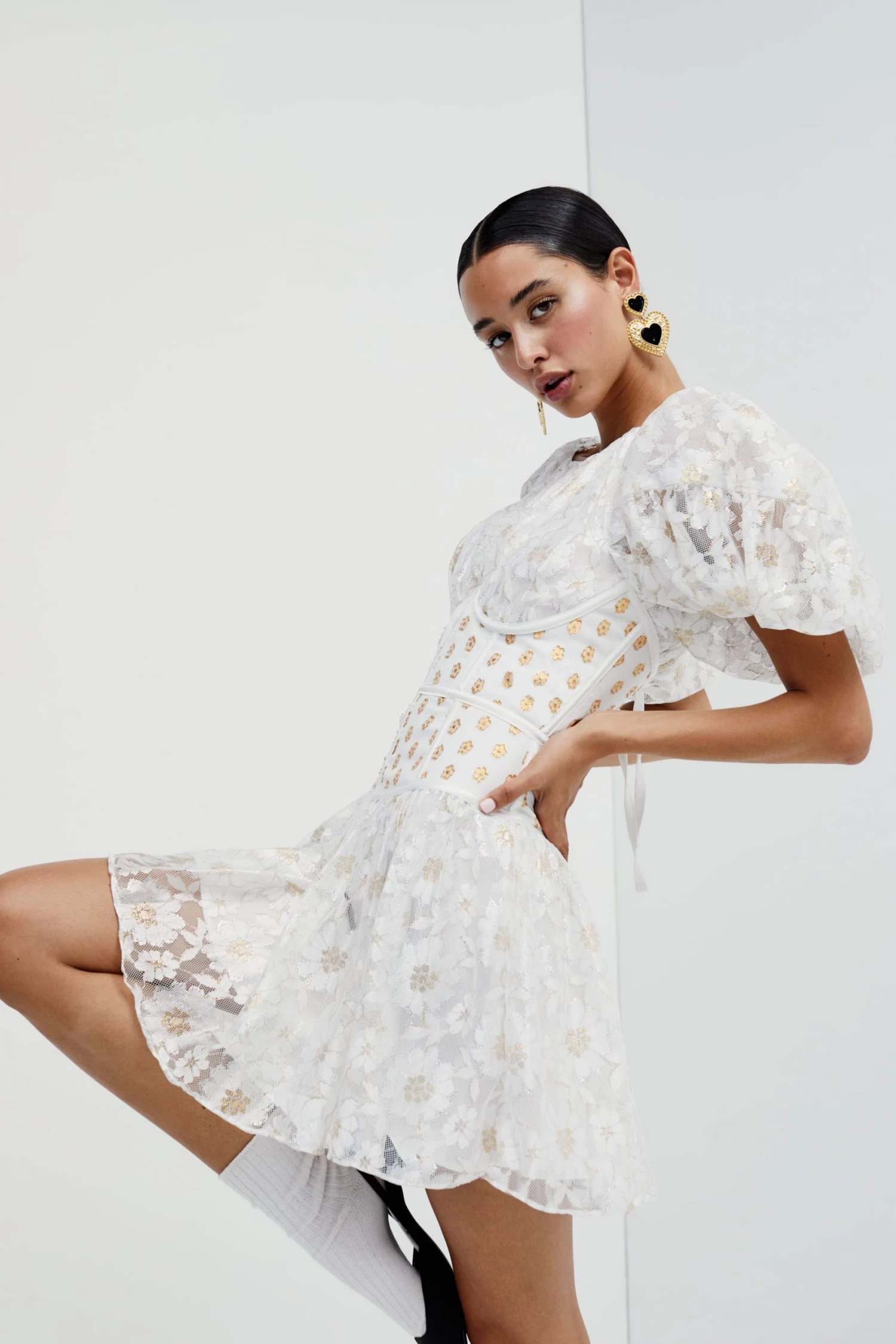 Whimsical lurex daisy lace mini dress featuring a built-in contrast corset and a gathered skirt. Buttons and ties at back with an invisible zipper. Partially lined.