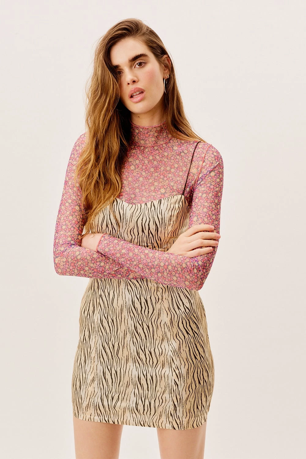 Chic mini dress featuring a figure-flattering silhouette and subtle tiger print. Princess seams, delicate adjustable shoulder straps, back zipper closure.