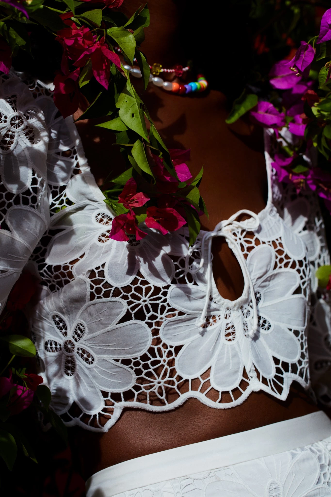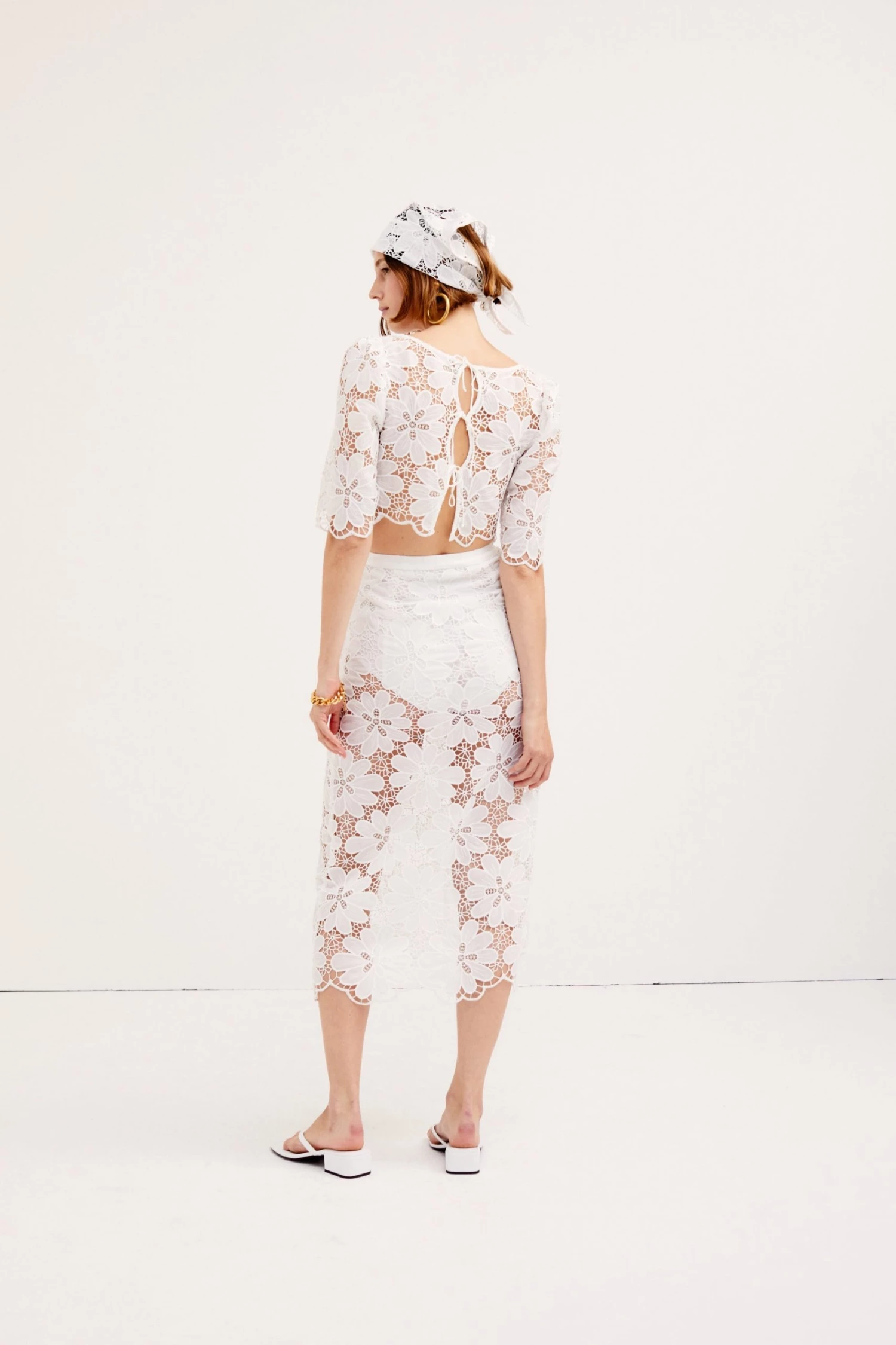 Daisy embroidered midi skirt with scallop trim along the hemline. Satin waistband with matching stretch satin panty lining.