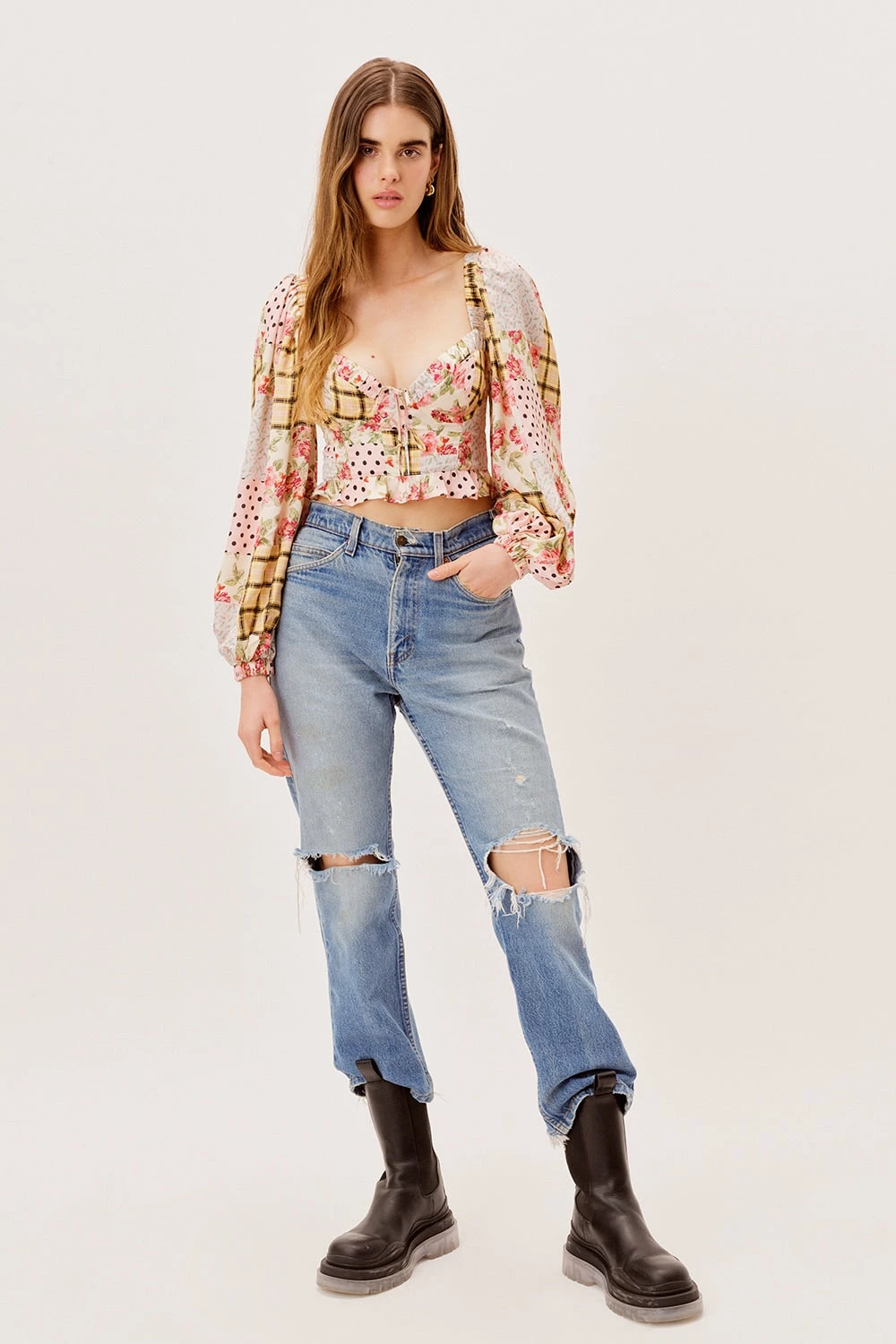 Playful patchwork print satin crop top featuring a feminine underwire bust, pretty peekaboo back, and a sweet ruffle at hem. Delicate front ties, long shirred sleeves.