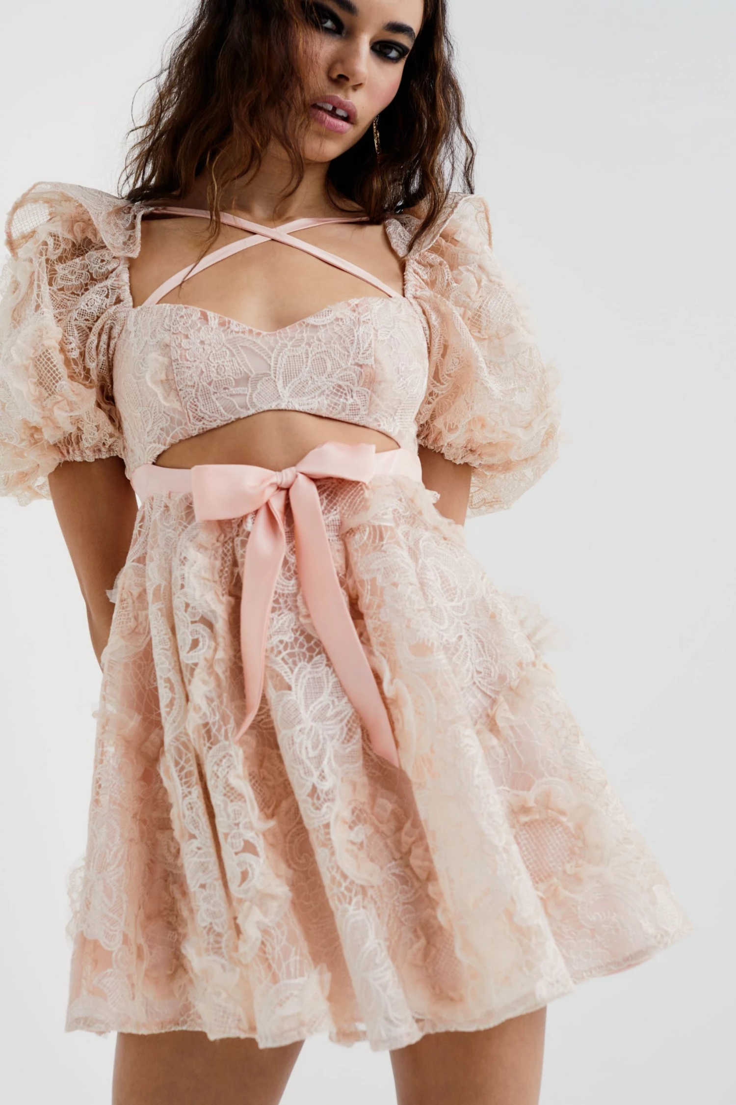 Intricately embroidered lace party dress featuring a sweetheart neckline and delicate tonal satin straps across the chest and back. Tonal satin bow and keyhole detailing at waist Partially lined, invisible zipper at back.