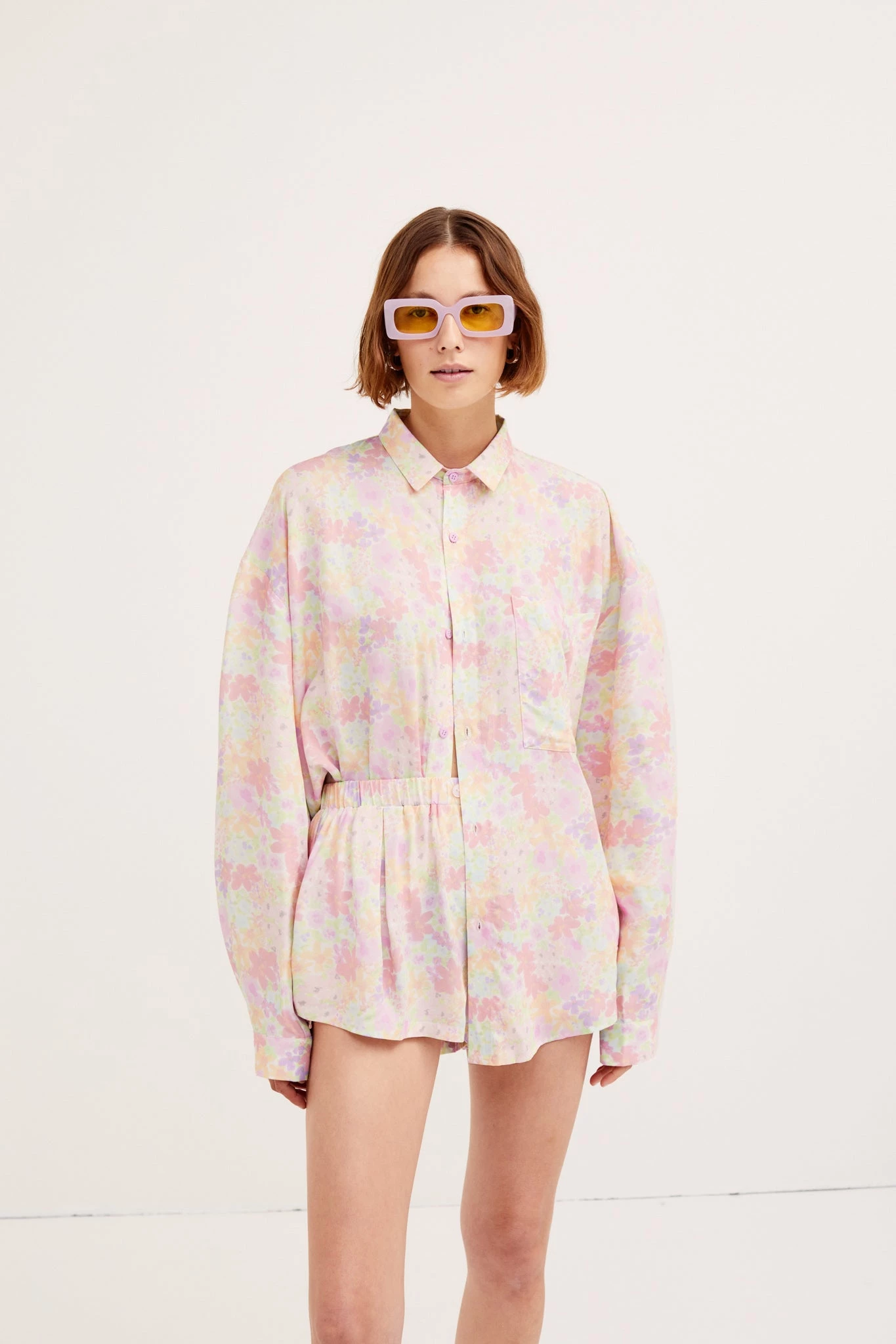 Pastel floral oversized poplin button-up shirt with chest pocket and crosshatch stitched patch detail.