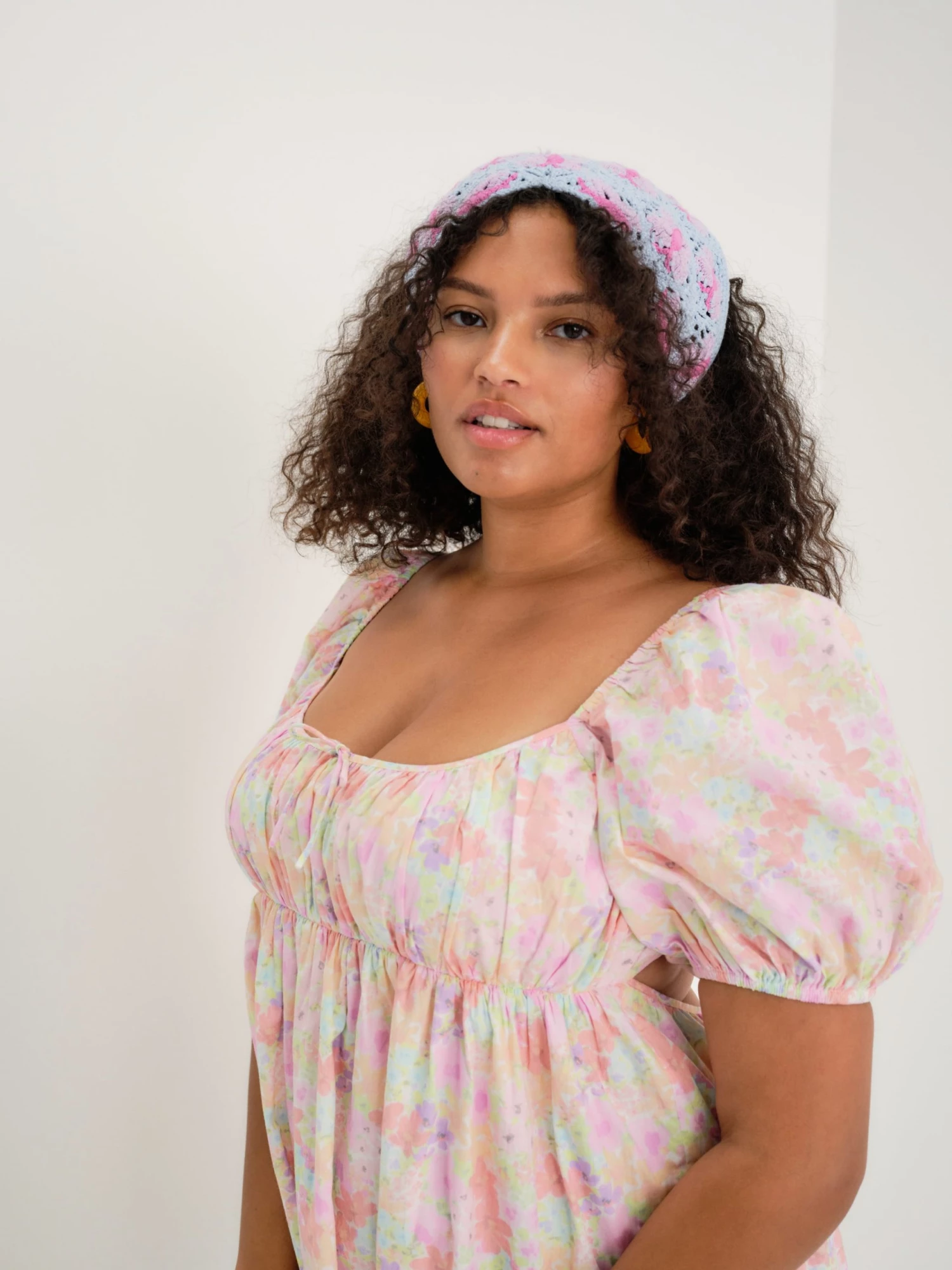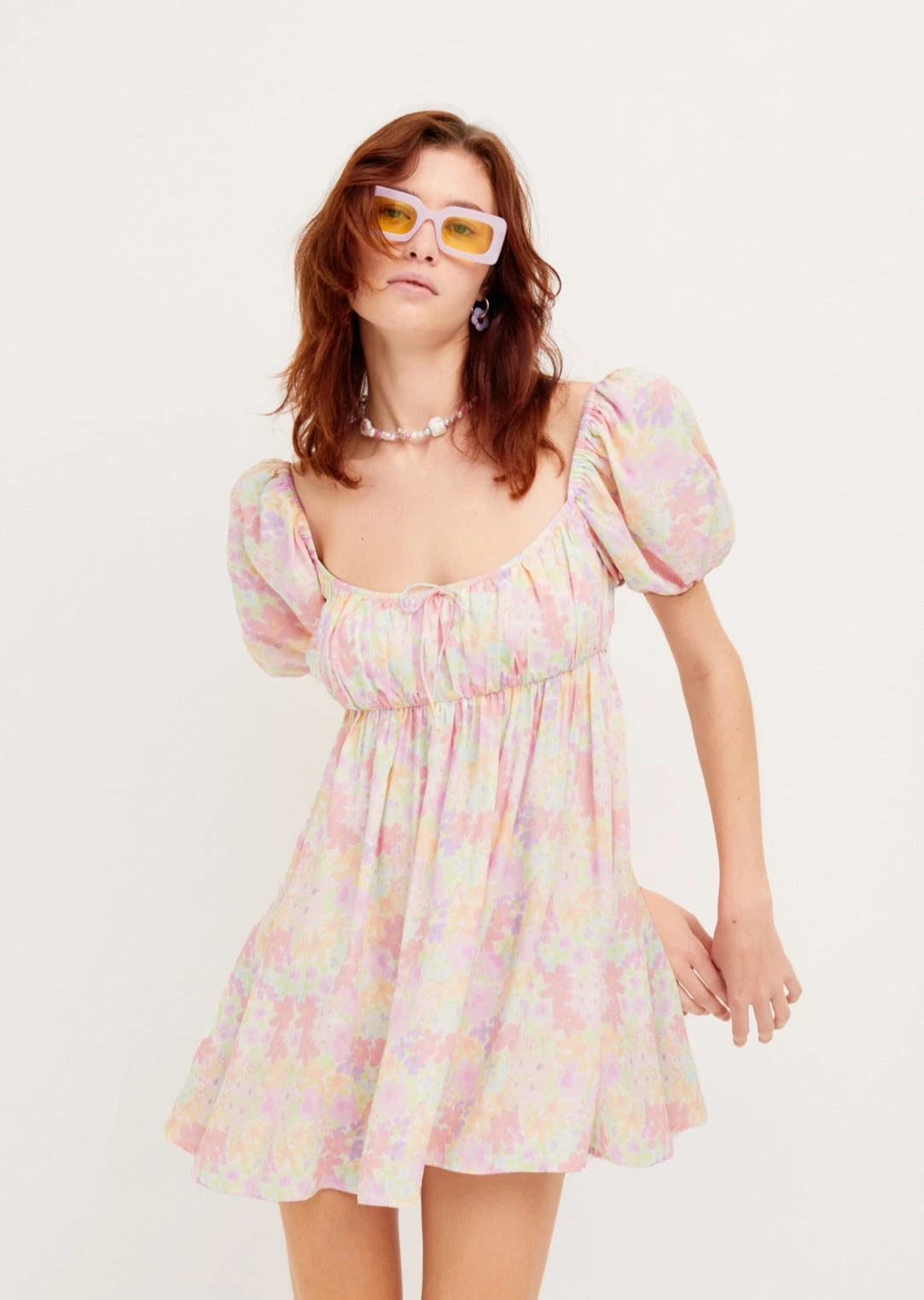 Pastel floral poplin mini dress with gathered neckline, short puff sleeve, and full skirt.Â