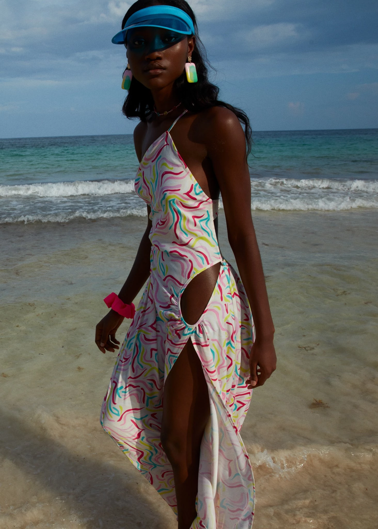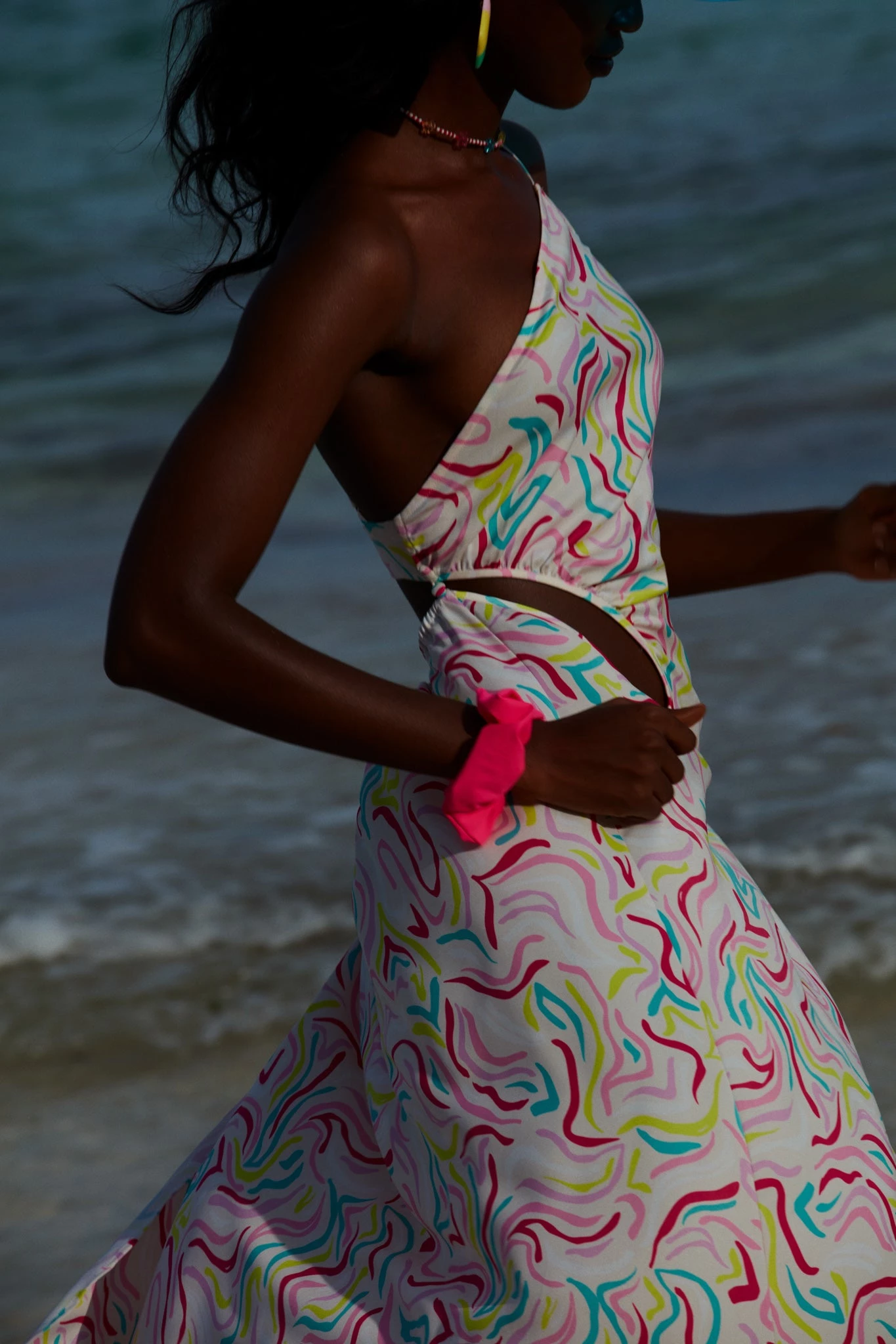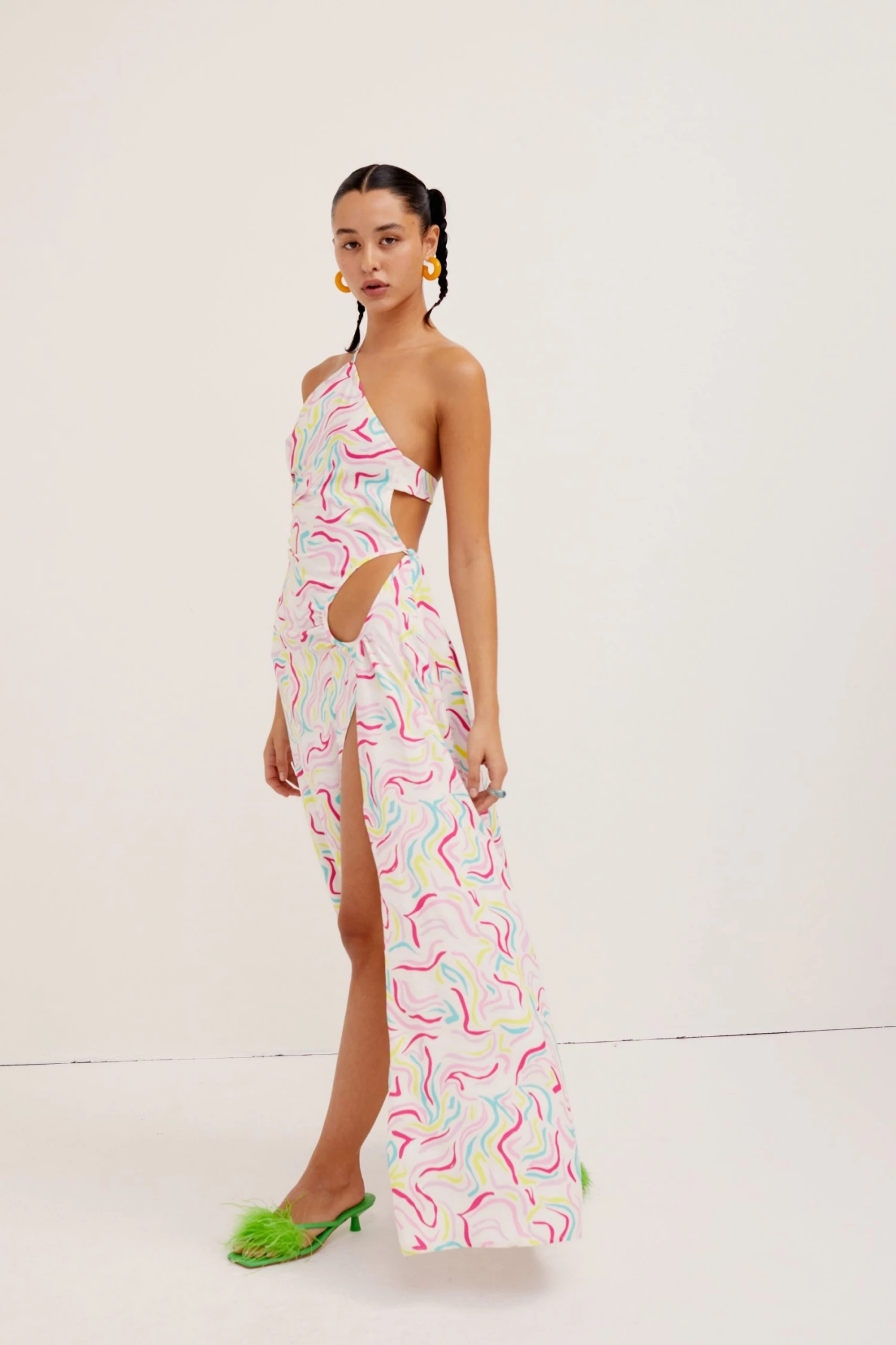 Breezy maxi dress featuring an 80’s-inspired print and an asymmetrical neckline.Â