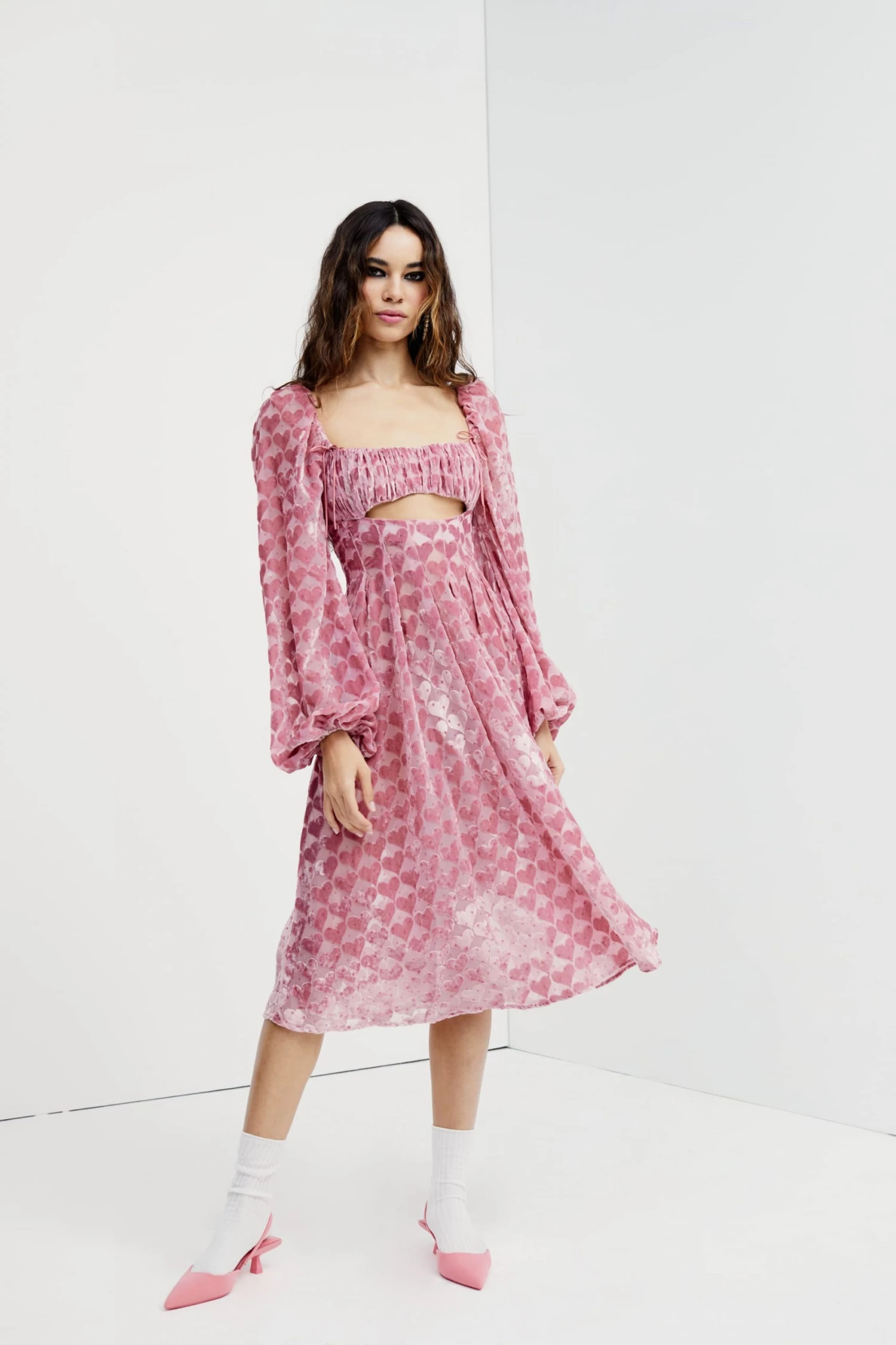 The cutest burnout heart chiffon midi dress featuring a gathered bust, keyhole at waist, and bishop sleeves. Gathered at shoulder, partially lined, invisible zipper at side.