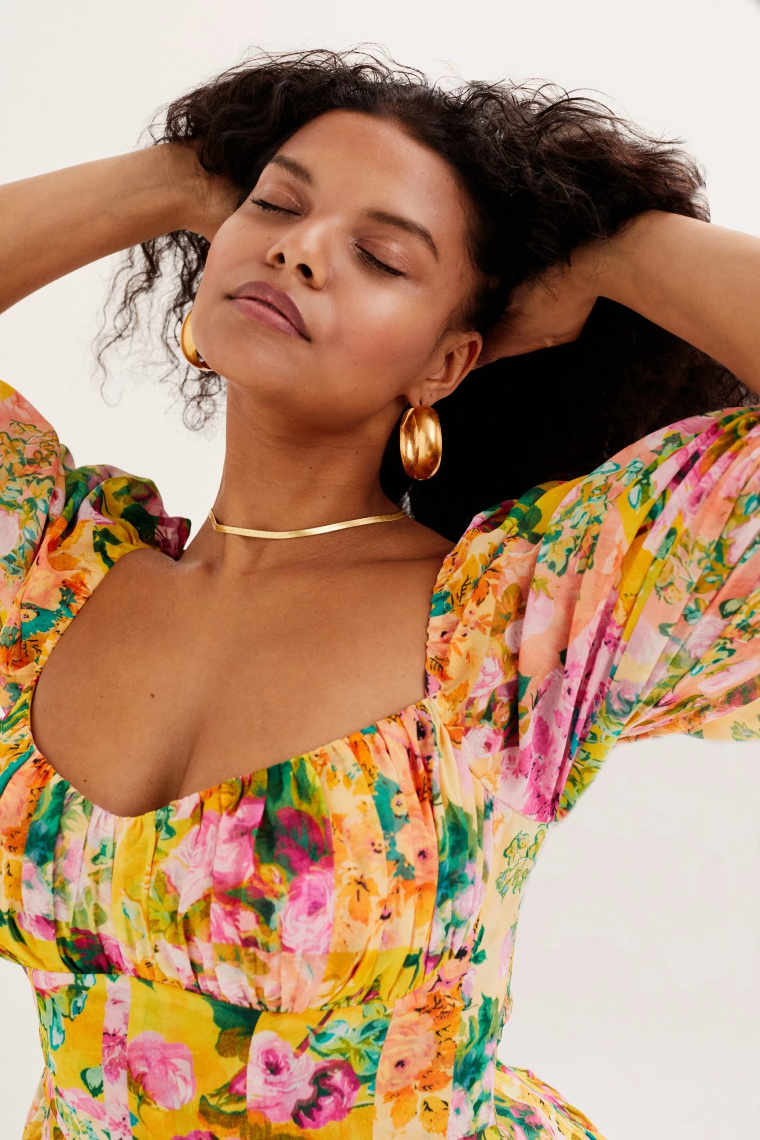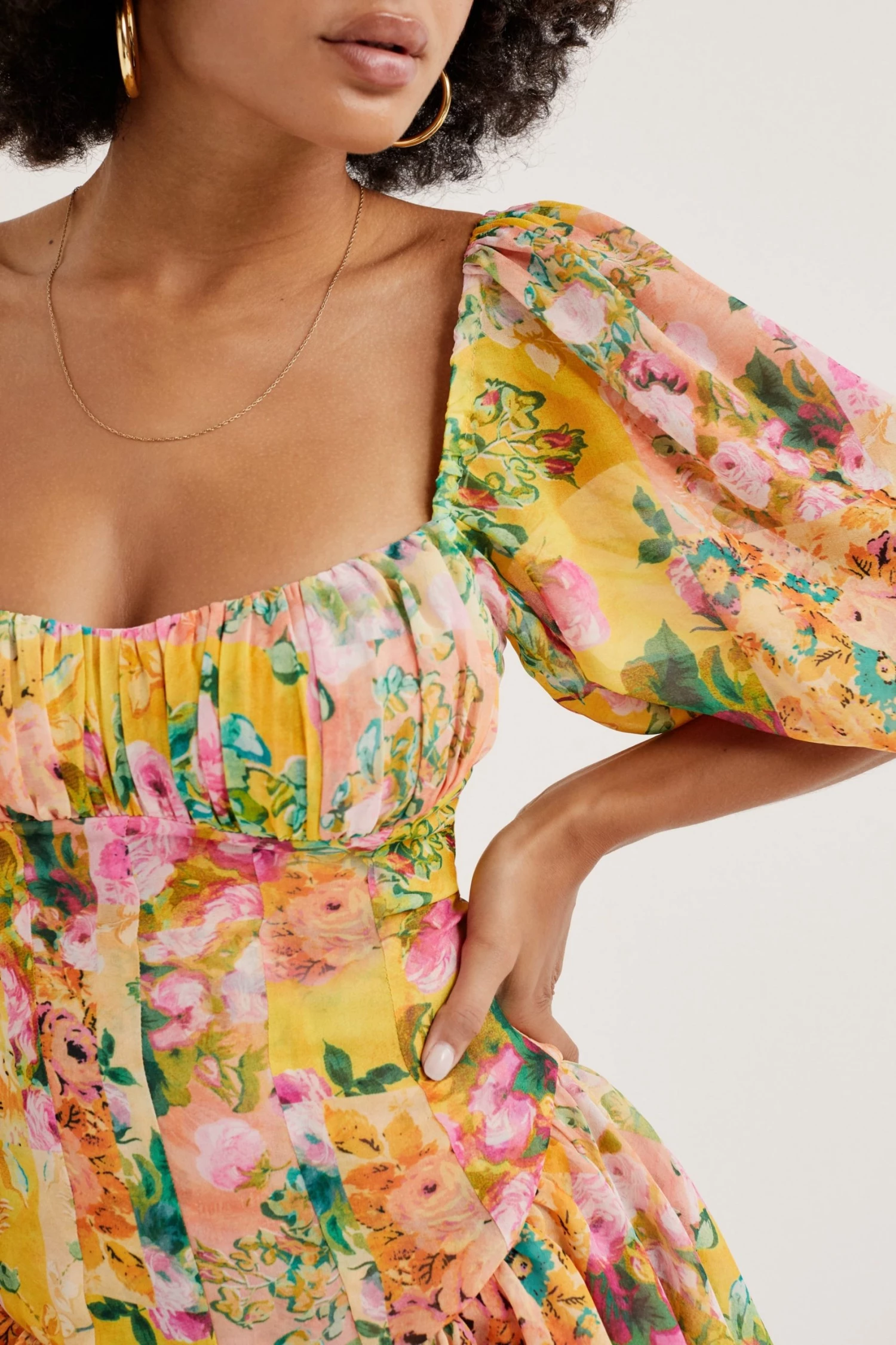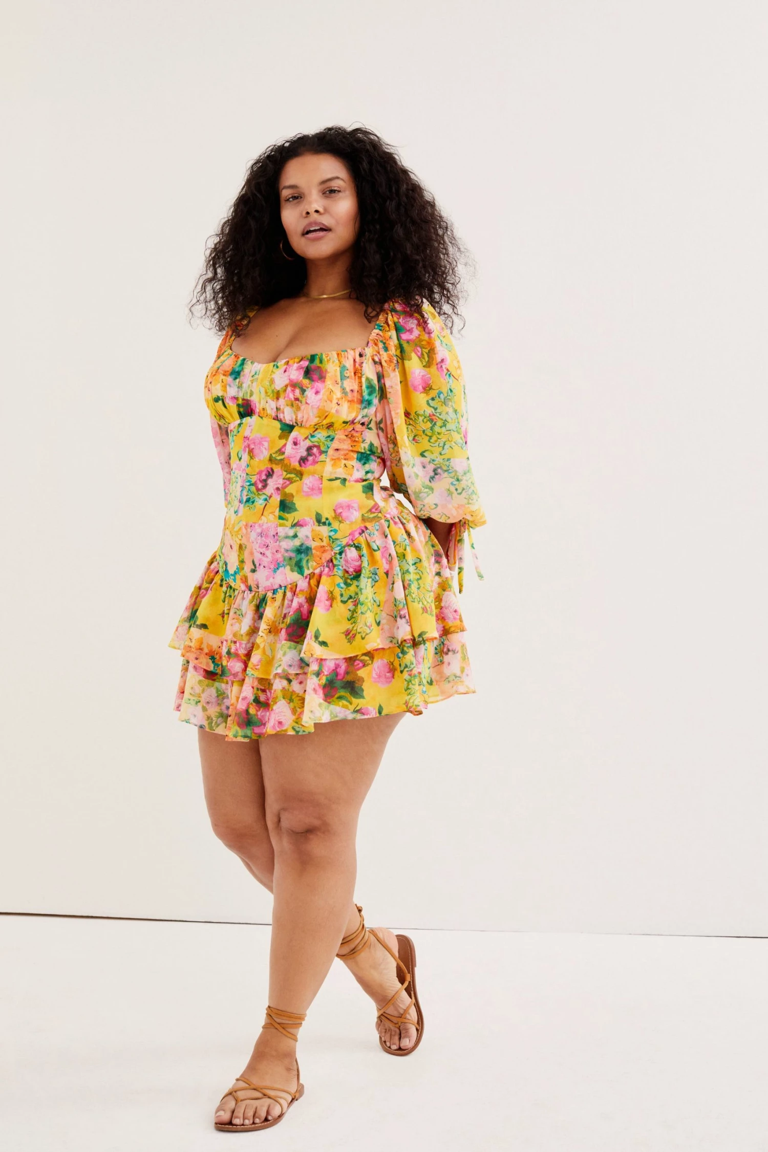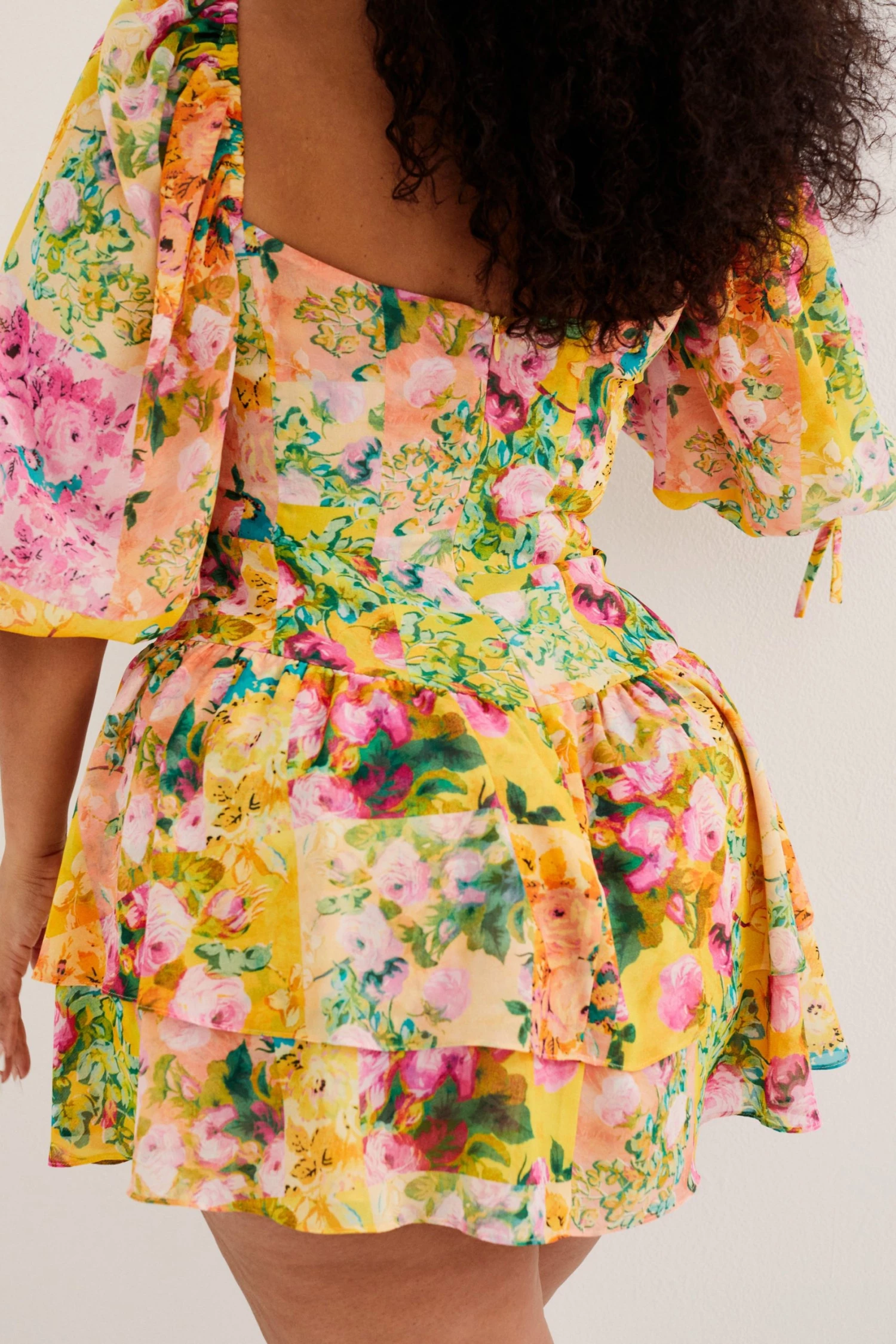 Breezy eco-chiffon mini dress featuring a floral print and gathered detailing at bust. Delicate shoulder ties, skirt has a cascading overlap design.