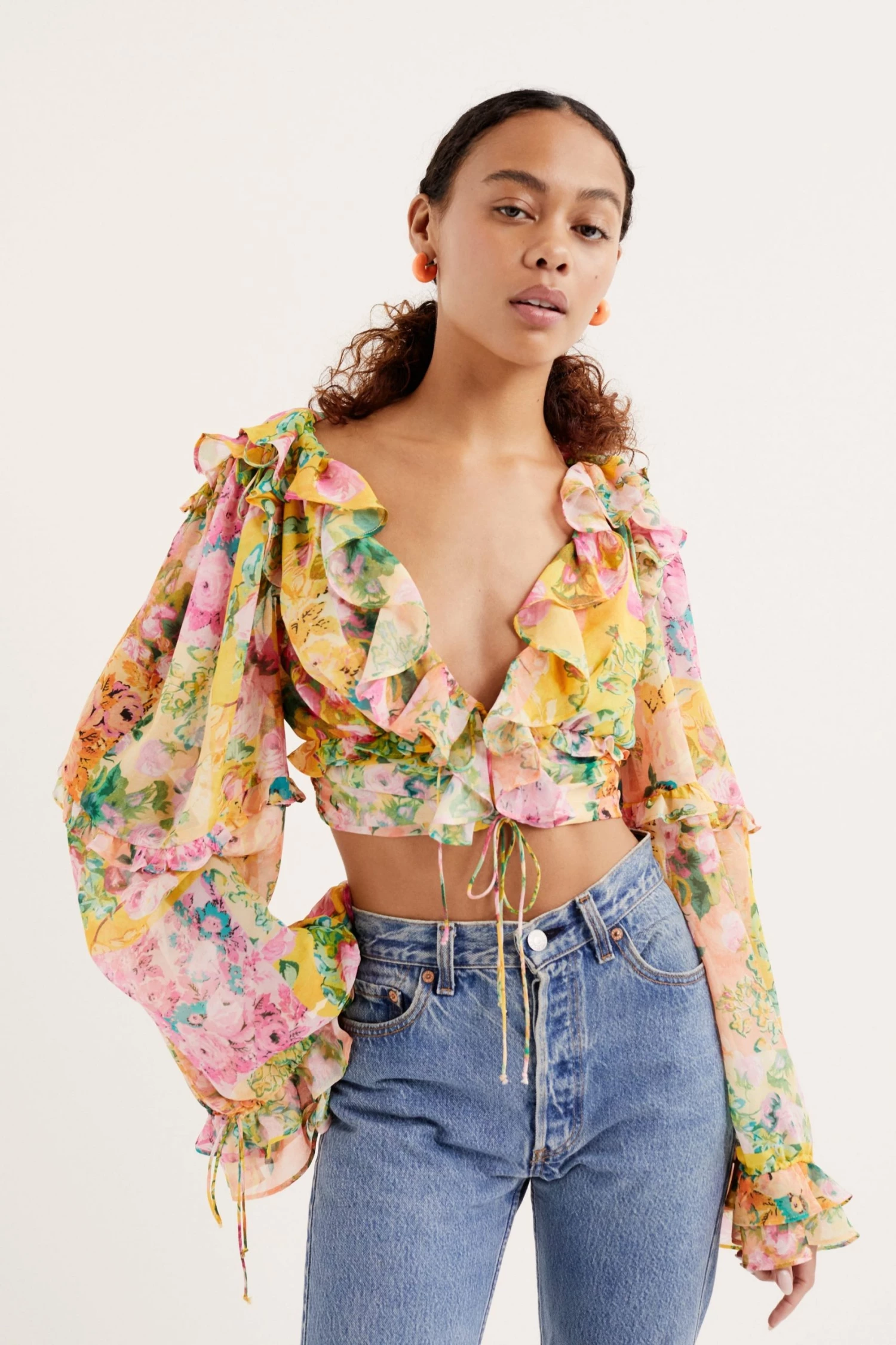 Breezy eco-chiffon floral print blouse featuring cascading ruffle detailing at the neckline. Delicate sheer bell sleeves with ruffle trims at elbow and sleeve opening.