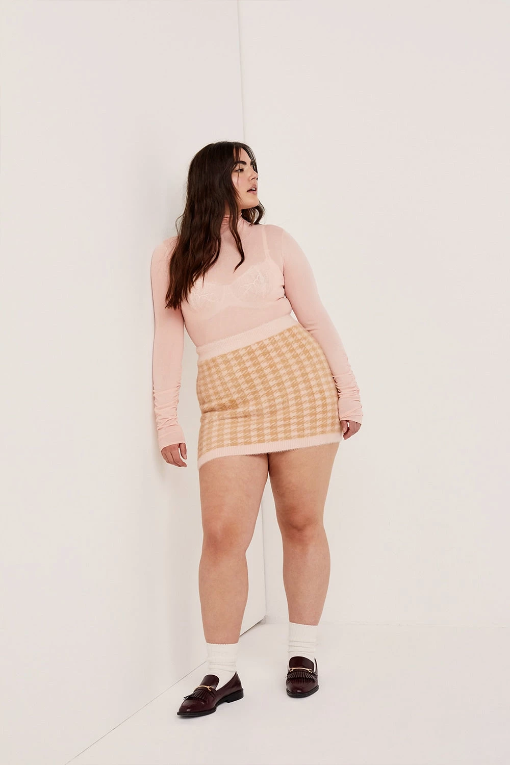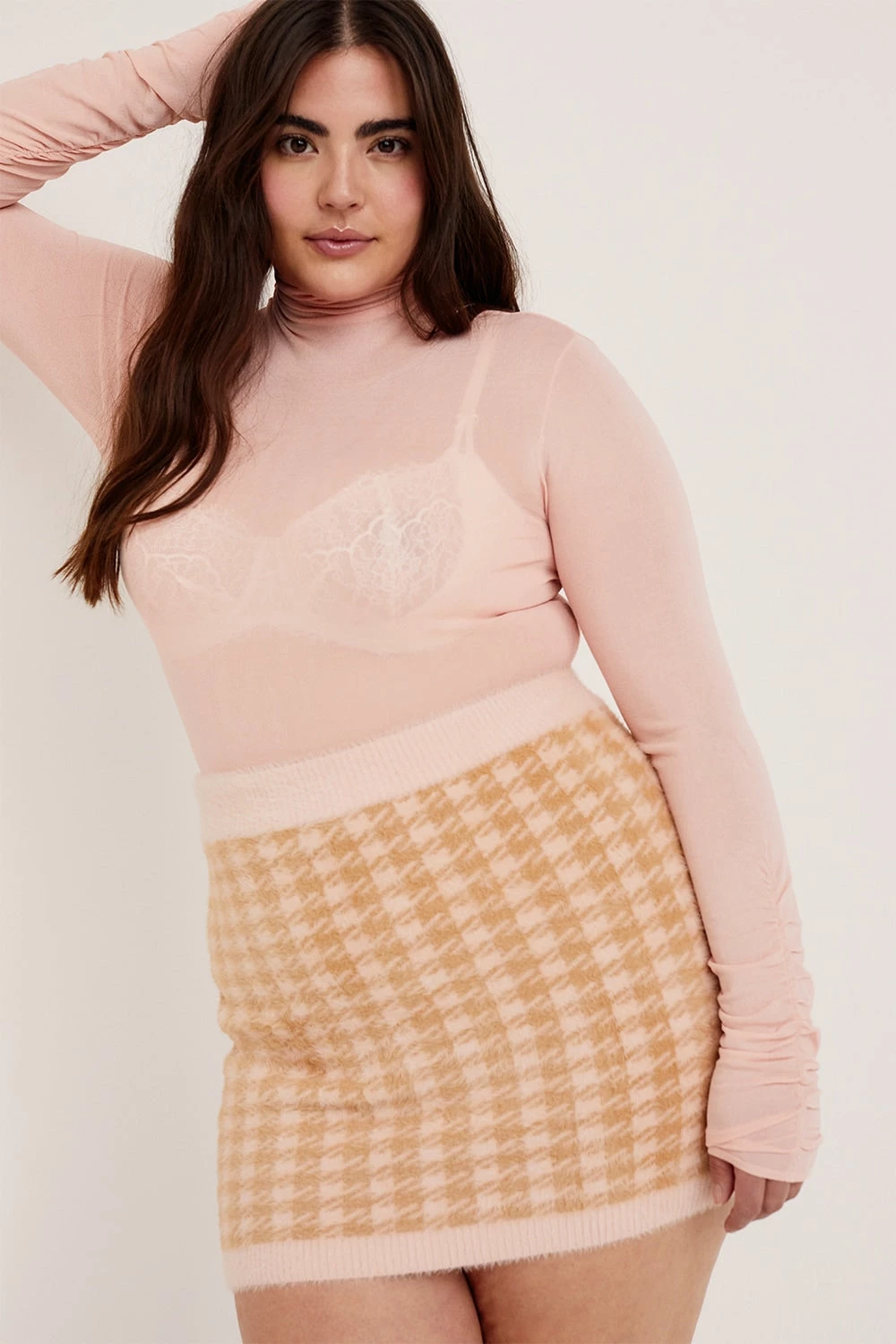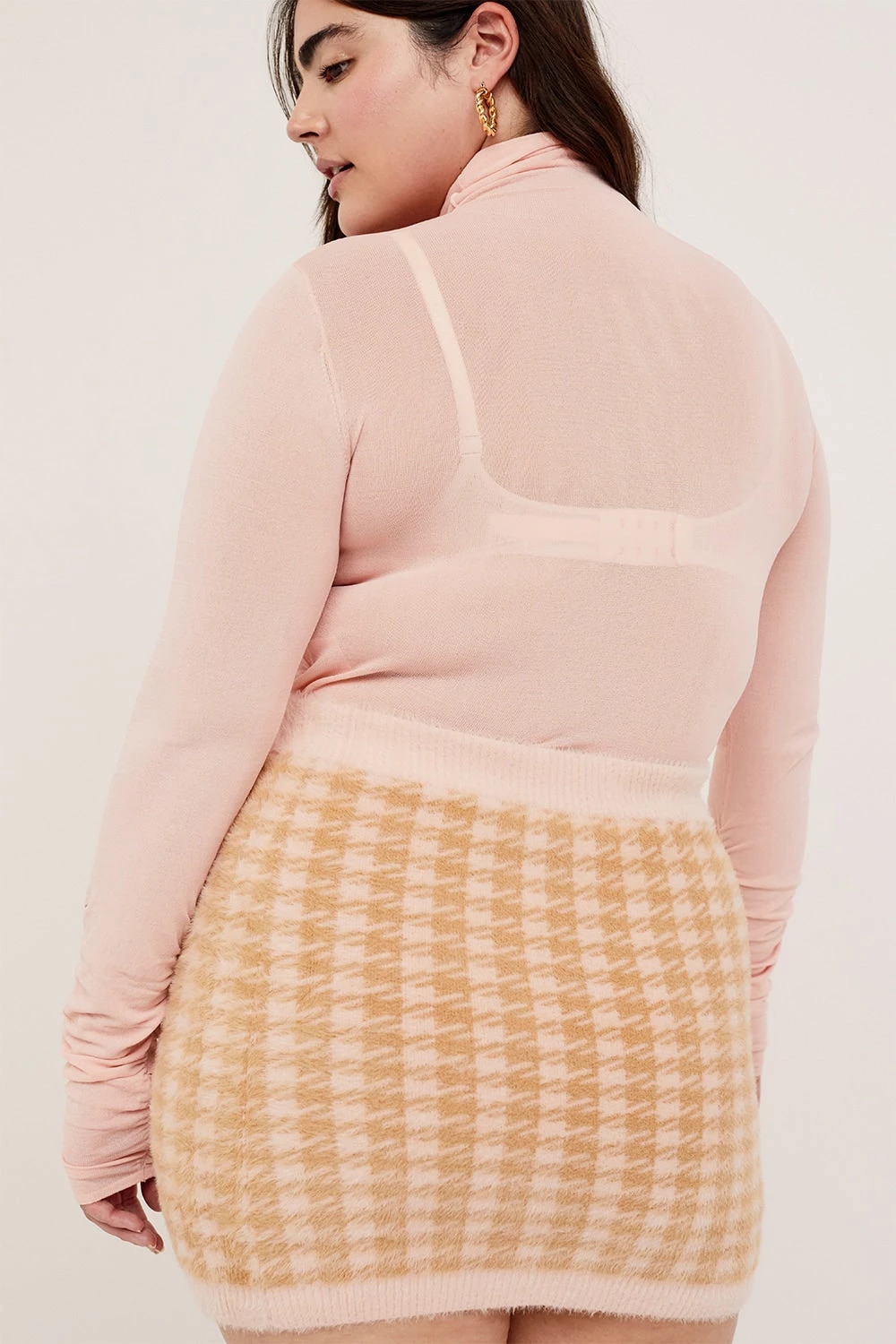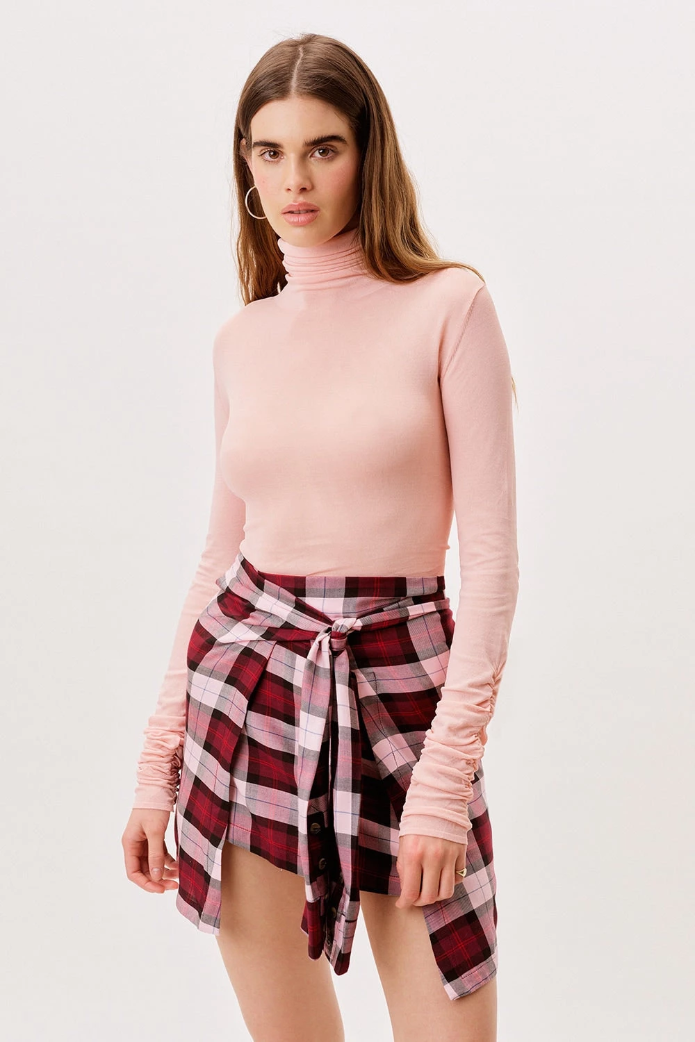 Whisper-weight sheer knit turtleneck featuring a shirred sleeve.