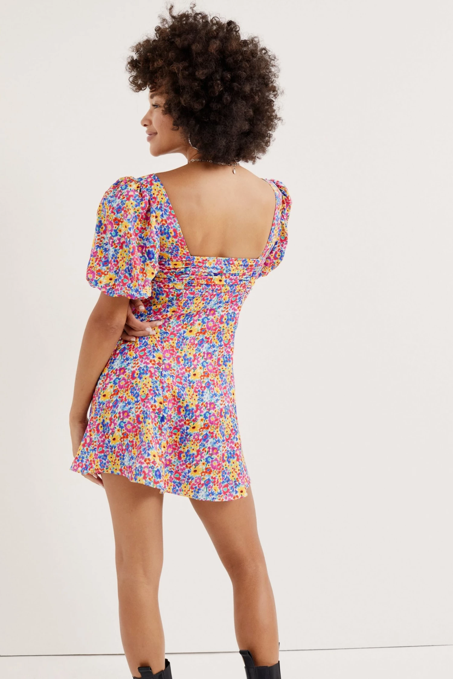 Vibrant confetti floral mini dress featuring ruched detailing at bust with a decorative front tie. Puff sleeves. Made from LENZINGâ„¢ ECOVEROâ„¢fibers.
