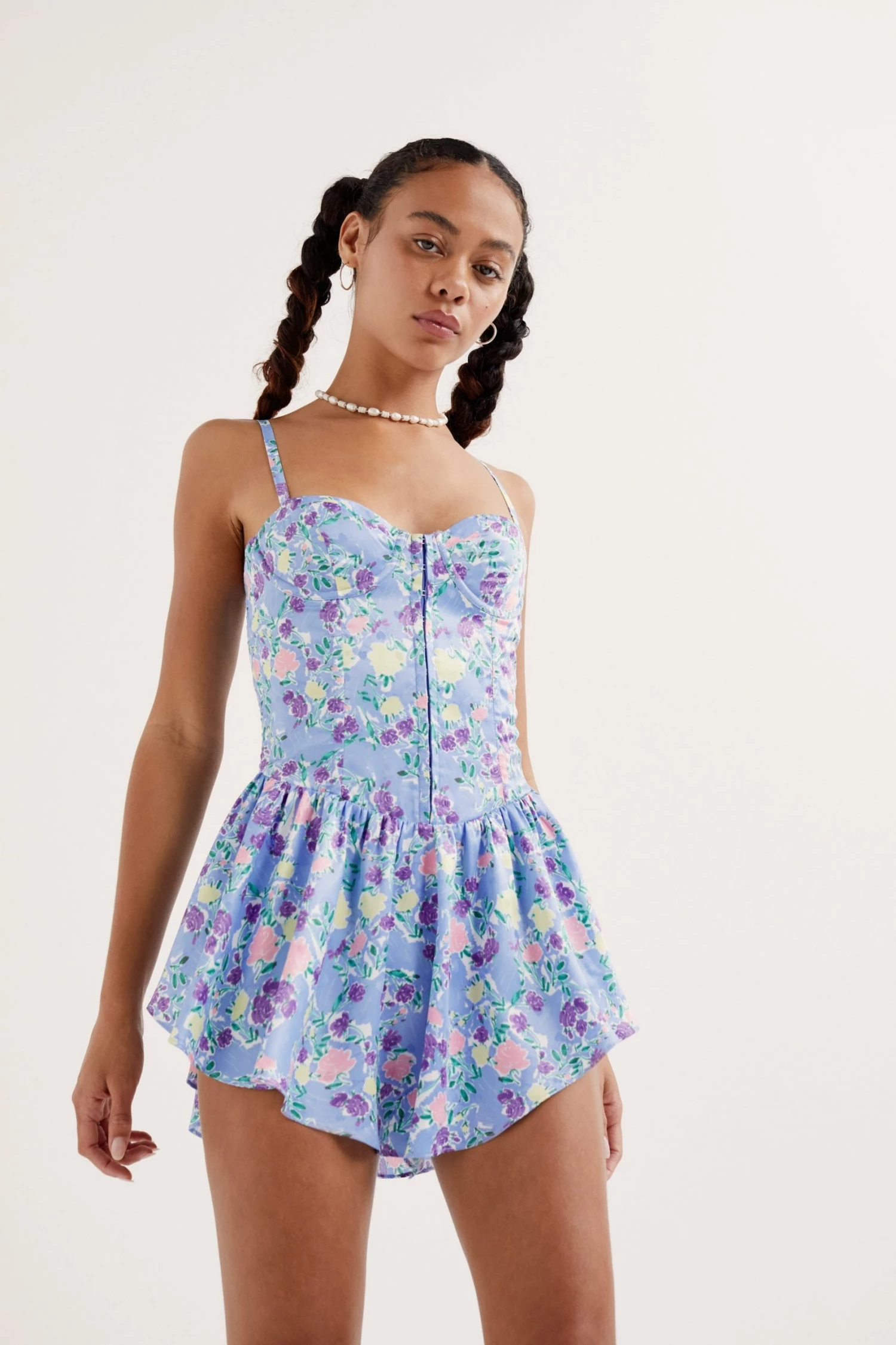 Painterly floral mini dress featuring structured cups and delicate, adjustable shoulder straps. Hidden hook & eye closure along front, vintage-inspired angled waist. Made from LENZING™ ECOVERO™fibers.