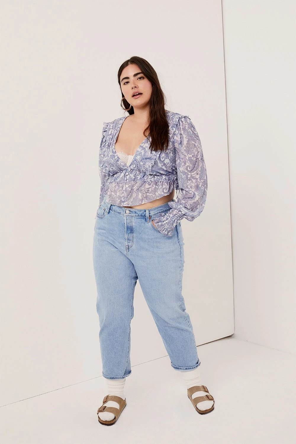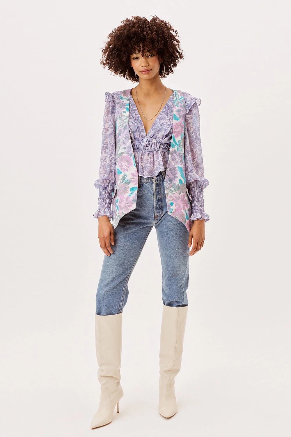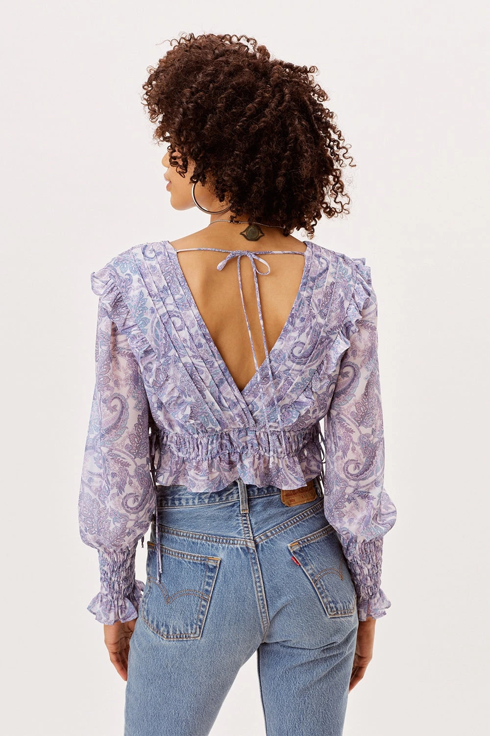 Feather paisley print top featuring a plunging neckline, feminine pintucked and ruffle detailing, and an open V-back with delicate tie closure. Made of recycled poly.