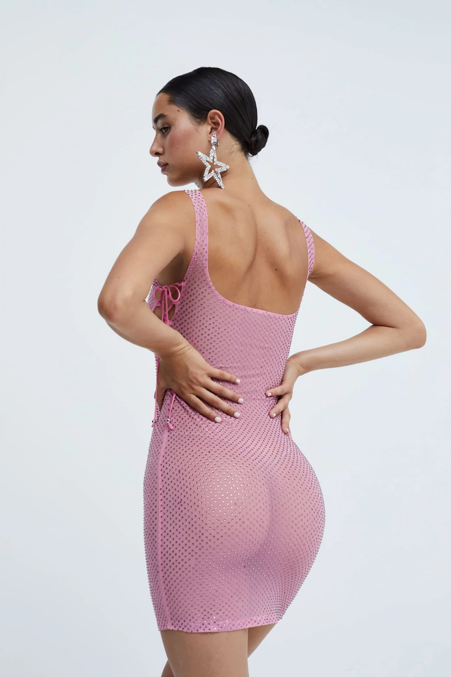 Racy sheer crystal mesh tank dress featuring delicate lace-up sides. Unlined.