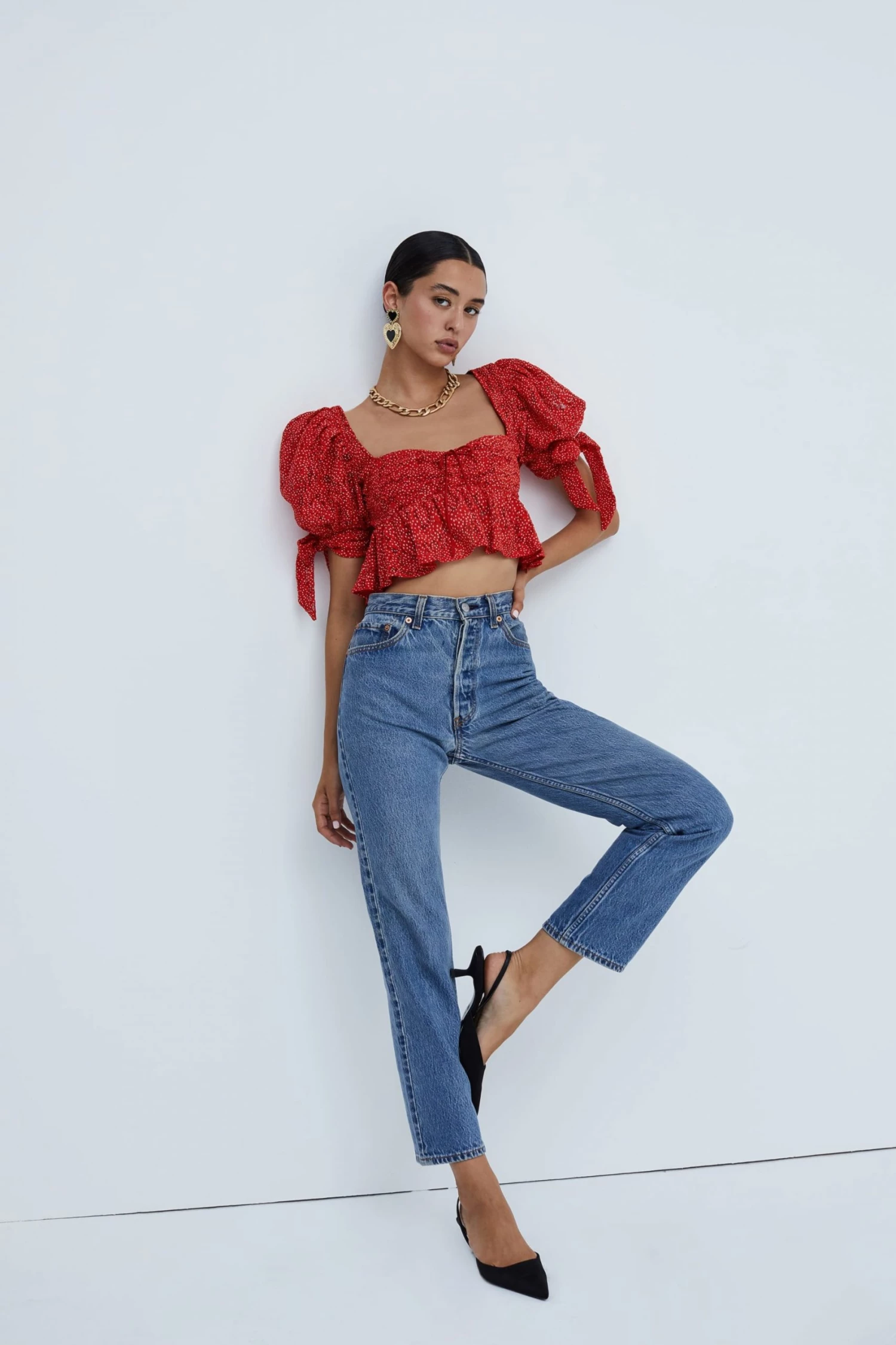 Delicately dotted lace crop top featuring a gathered neckline, voluminous puff sleeves, dainty ties. Pull-on fit, bust is lined.