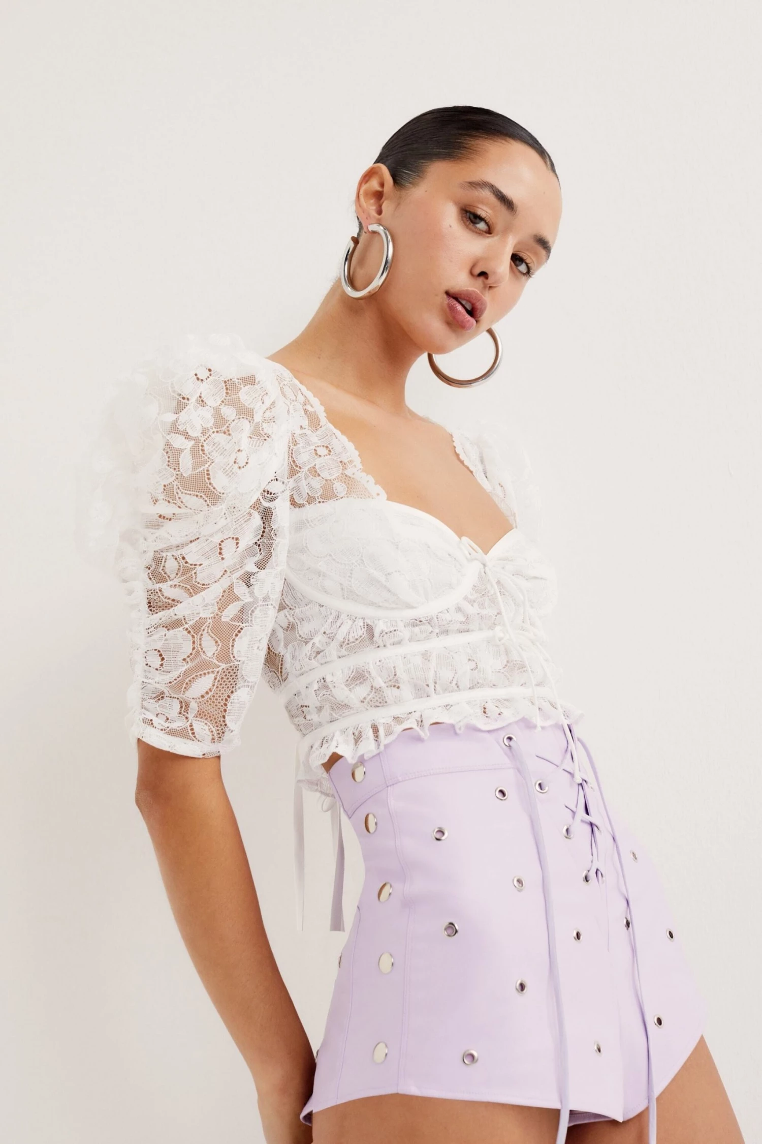 Ethereal lace crop top featuring a structured underwire bust and delicate satin detailing that ties at back. Ruffles throughout, sheer gathered sleeves, Bra closure at back.